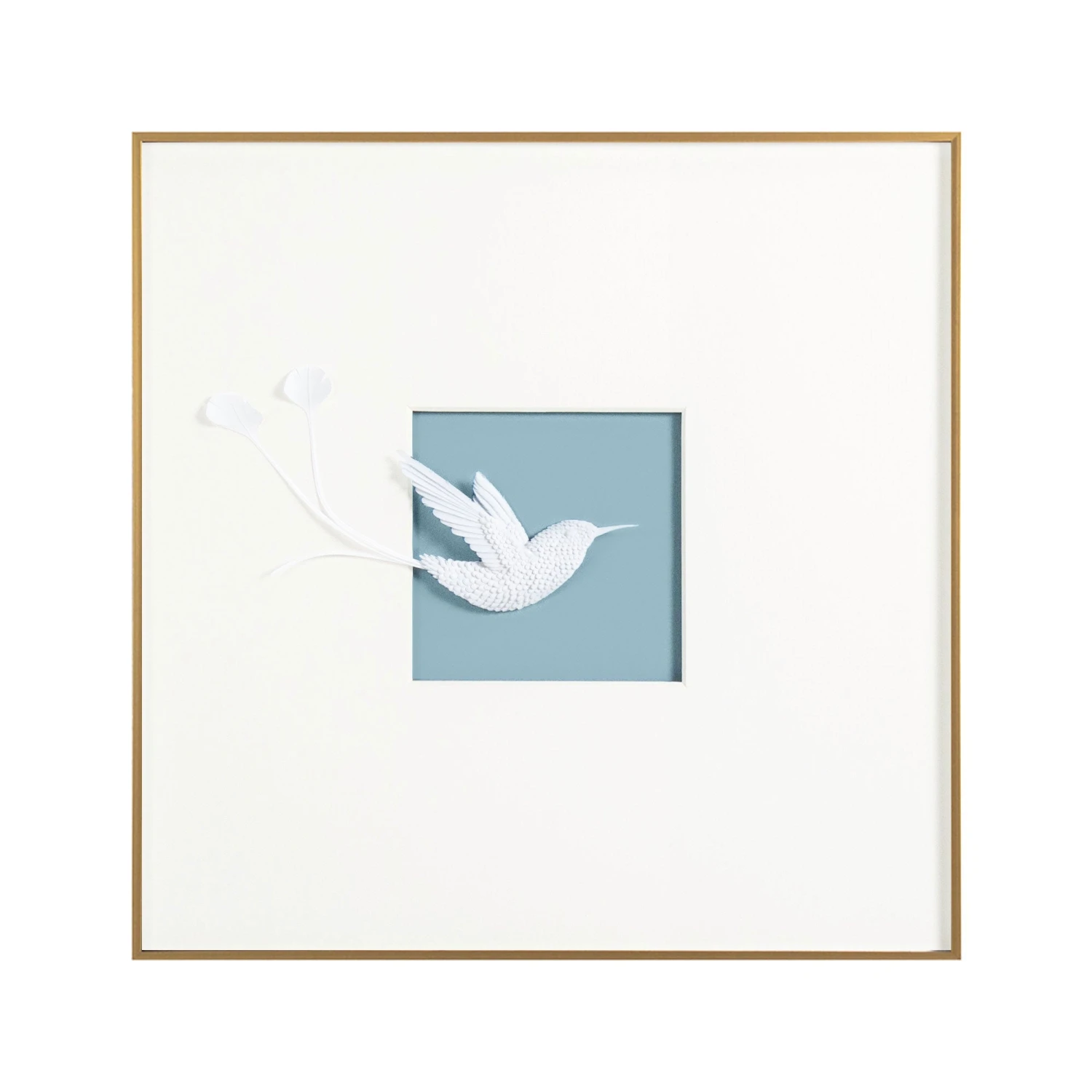 Our exclusive Aviary Series is sure to make your space sing. Hand-crafted paper birds fly on a blue background. A cream matte and gold frame adds the finishing touch.