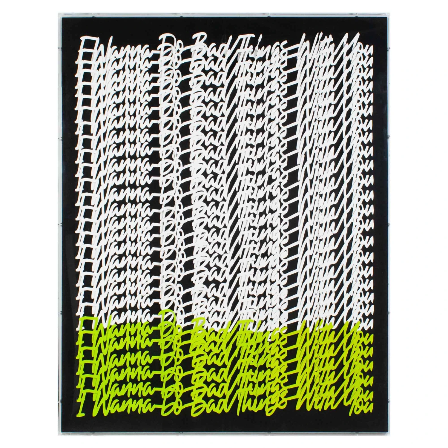 I wanna do bad things with you.ย Laser cutย words set the mood against black canvas. Framed in an acrylic shadowbox.ย