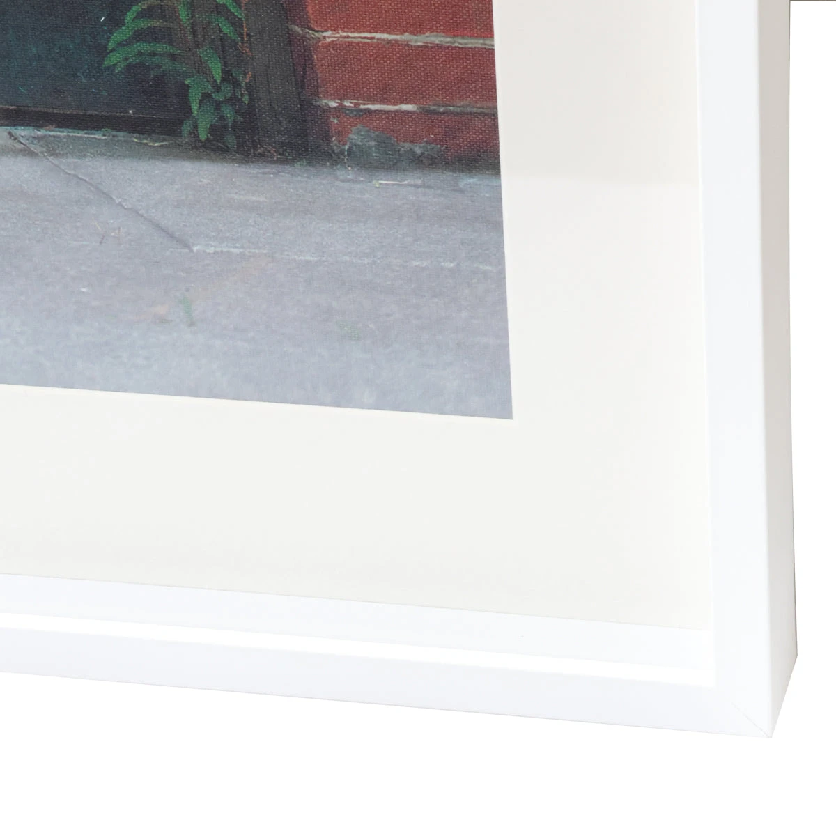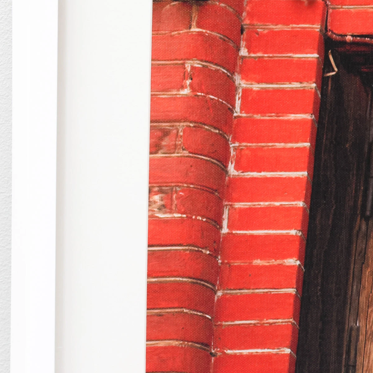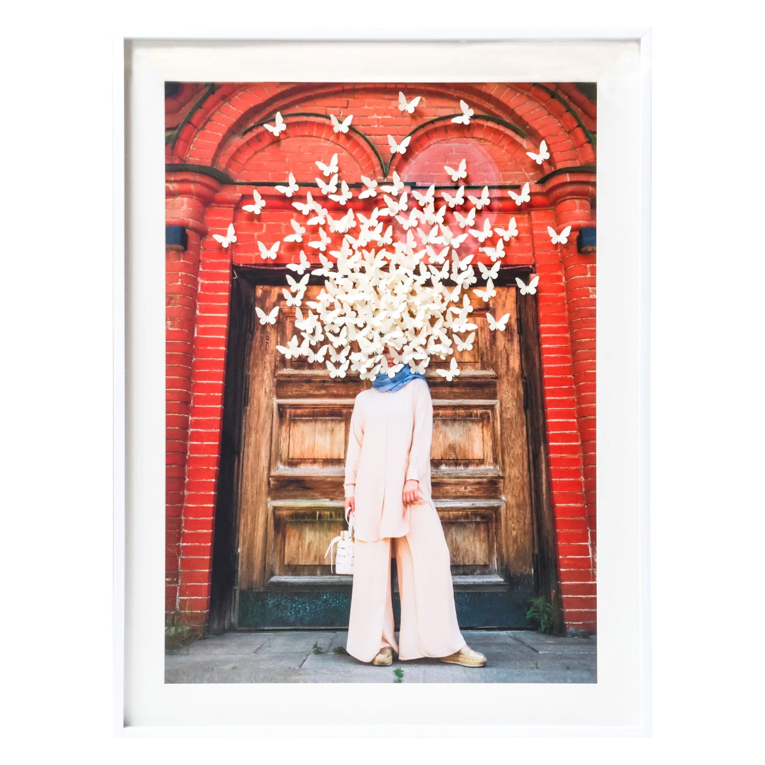 A modern-day blend of chiaroscuro and mixed media,ย Brick Fly features a womanย printed on canvas with a swarm of butterflies obscuring her face.ย