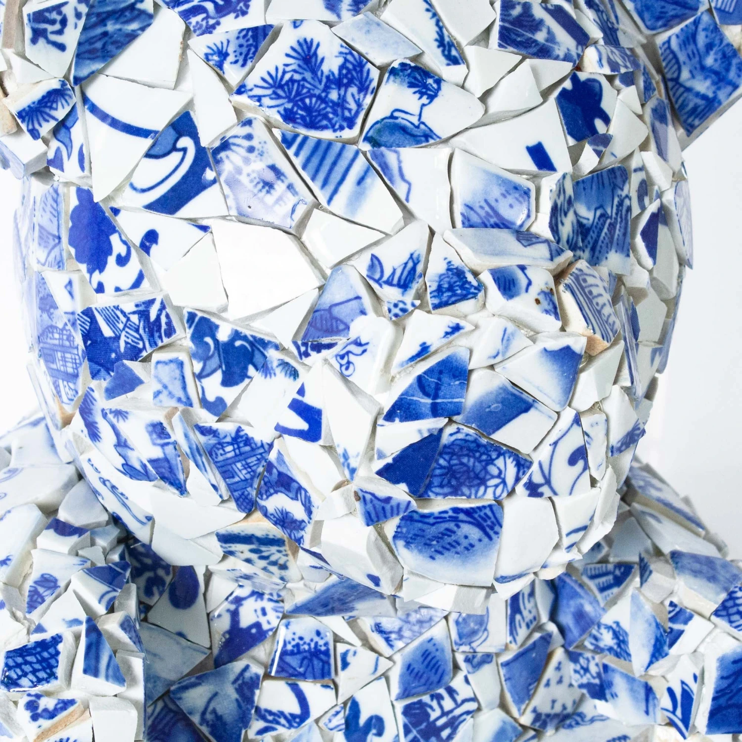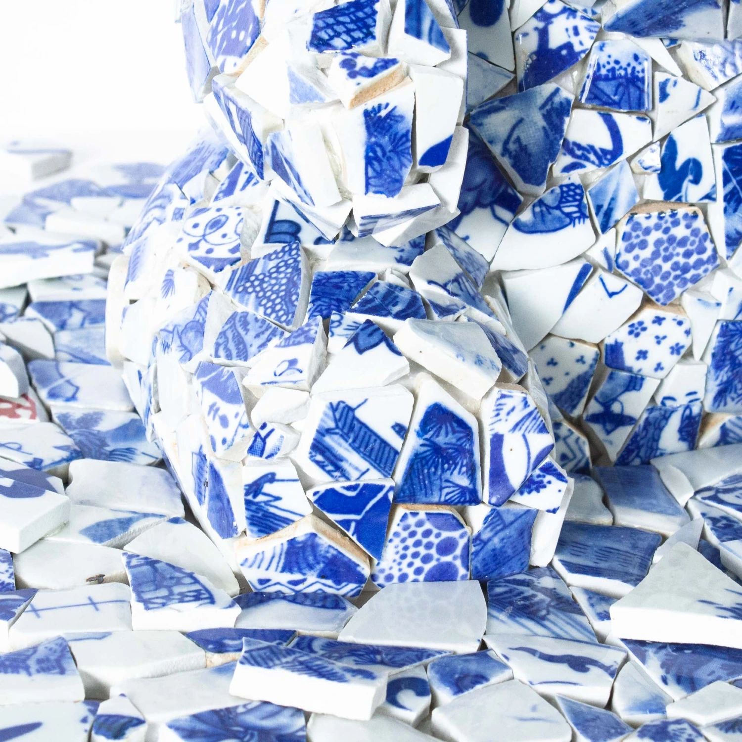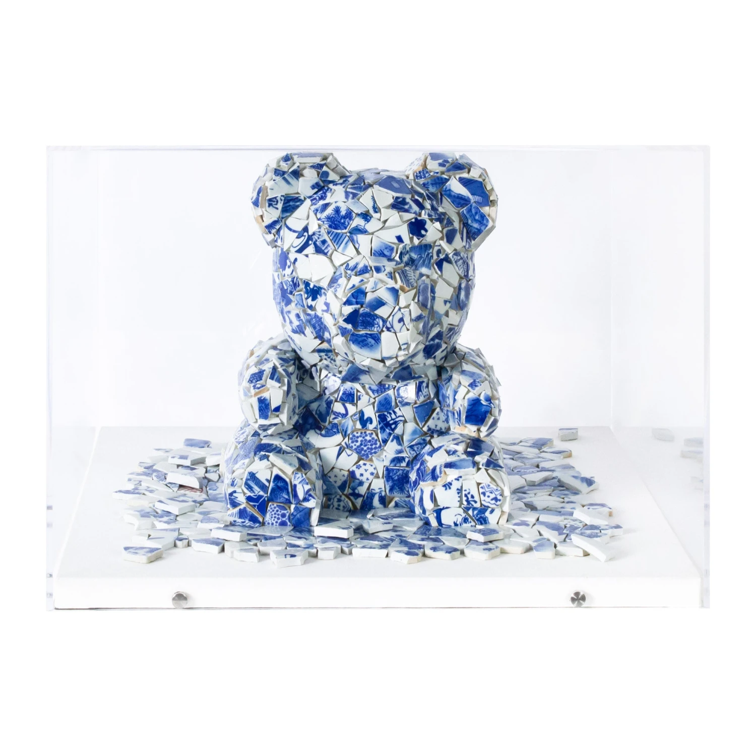 Shattered ginger jar pieces individually placed on aย bear sculpture. Mounted on white canvas and framed in an acrylic shadowbox.
