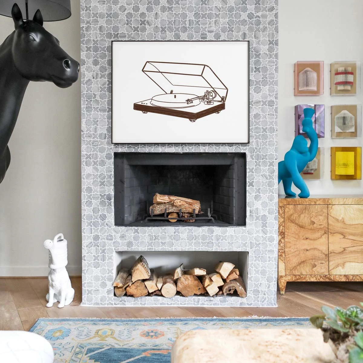 Record player artwork made of cassette tapes in a black metal frame with a plexiglass panel.