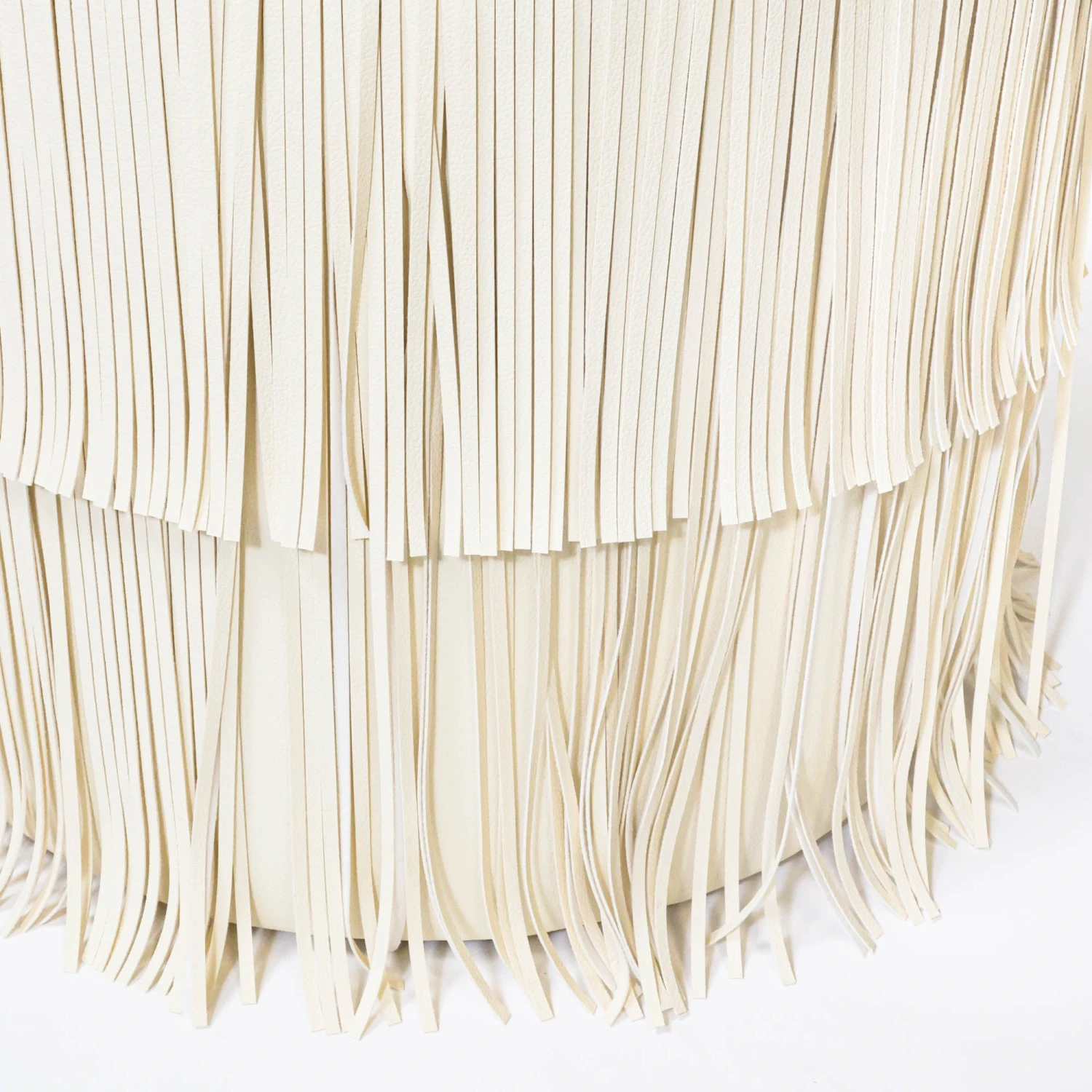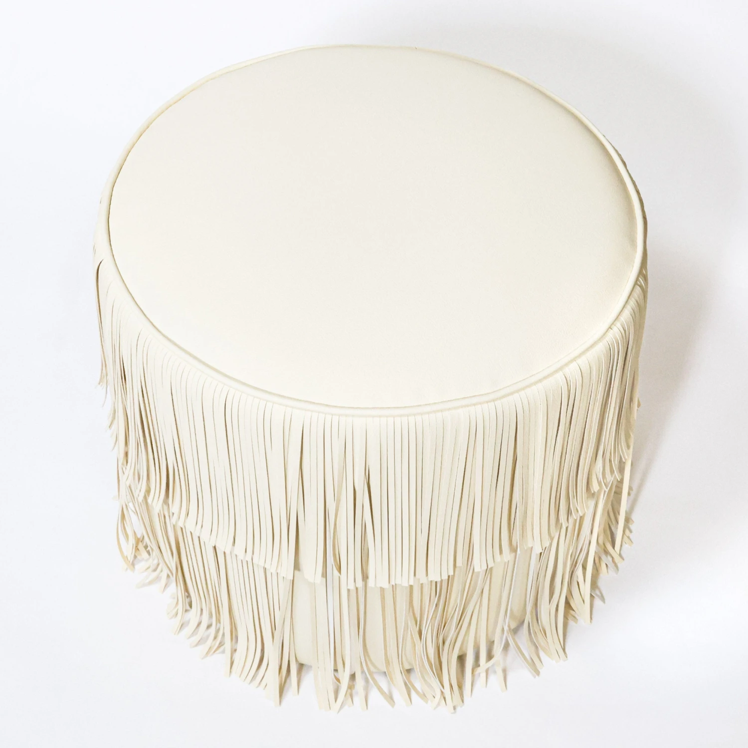 Thisย ivory leather ottoman takes charge with a sassy fringe facade. Perfect for extra living room seating, under artwork, or paired with a console. The options are endless!
