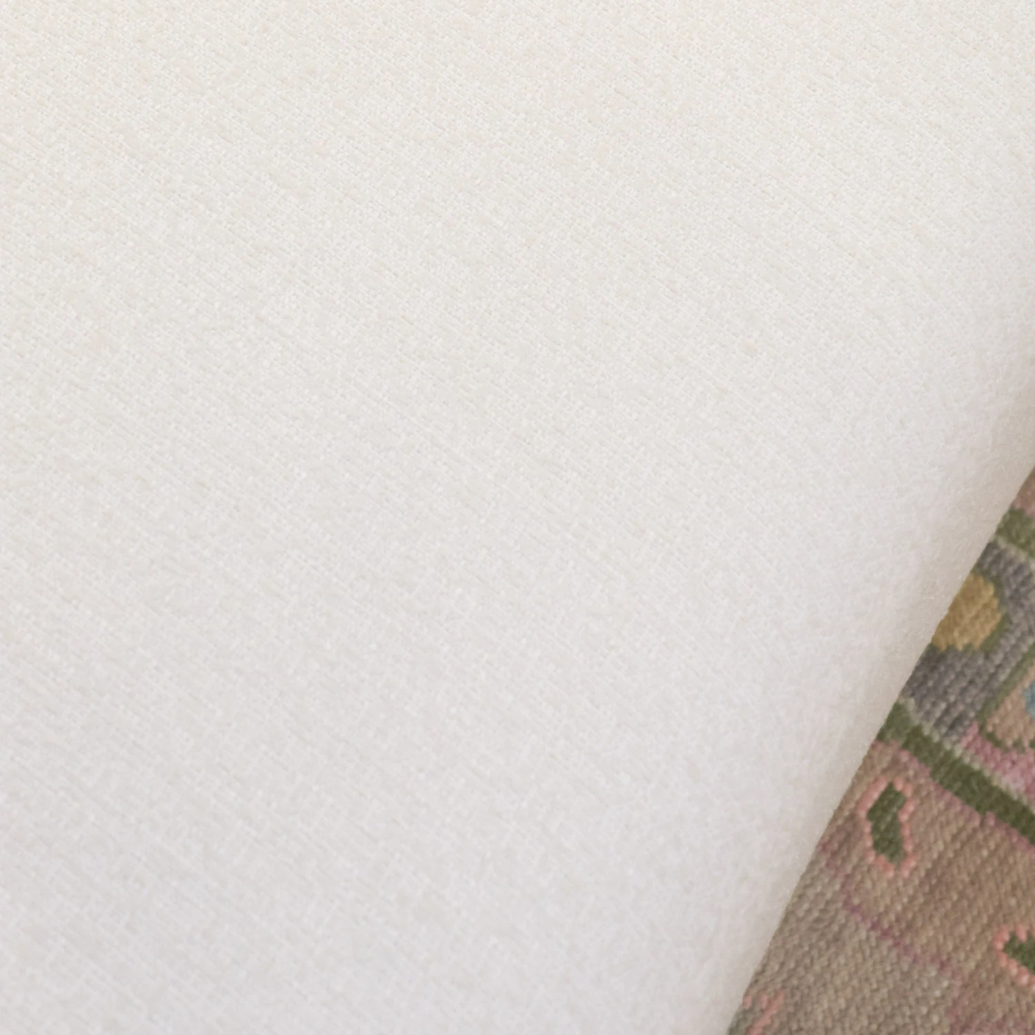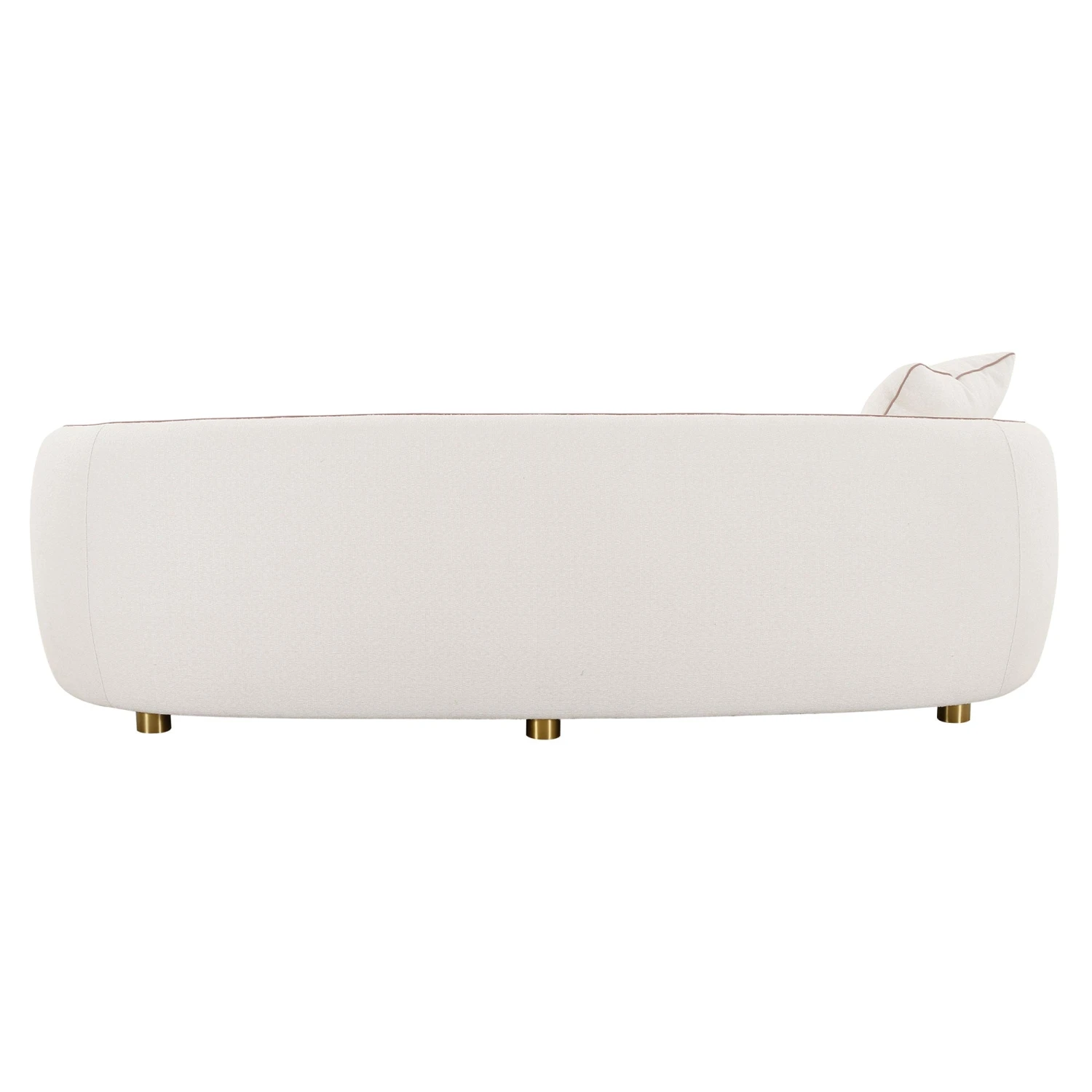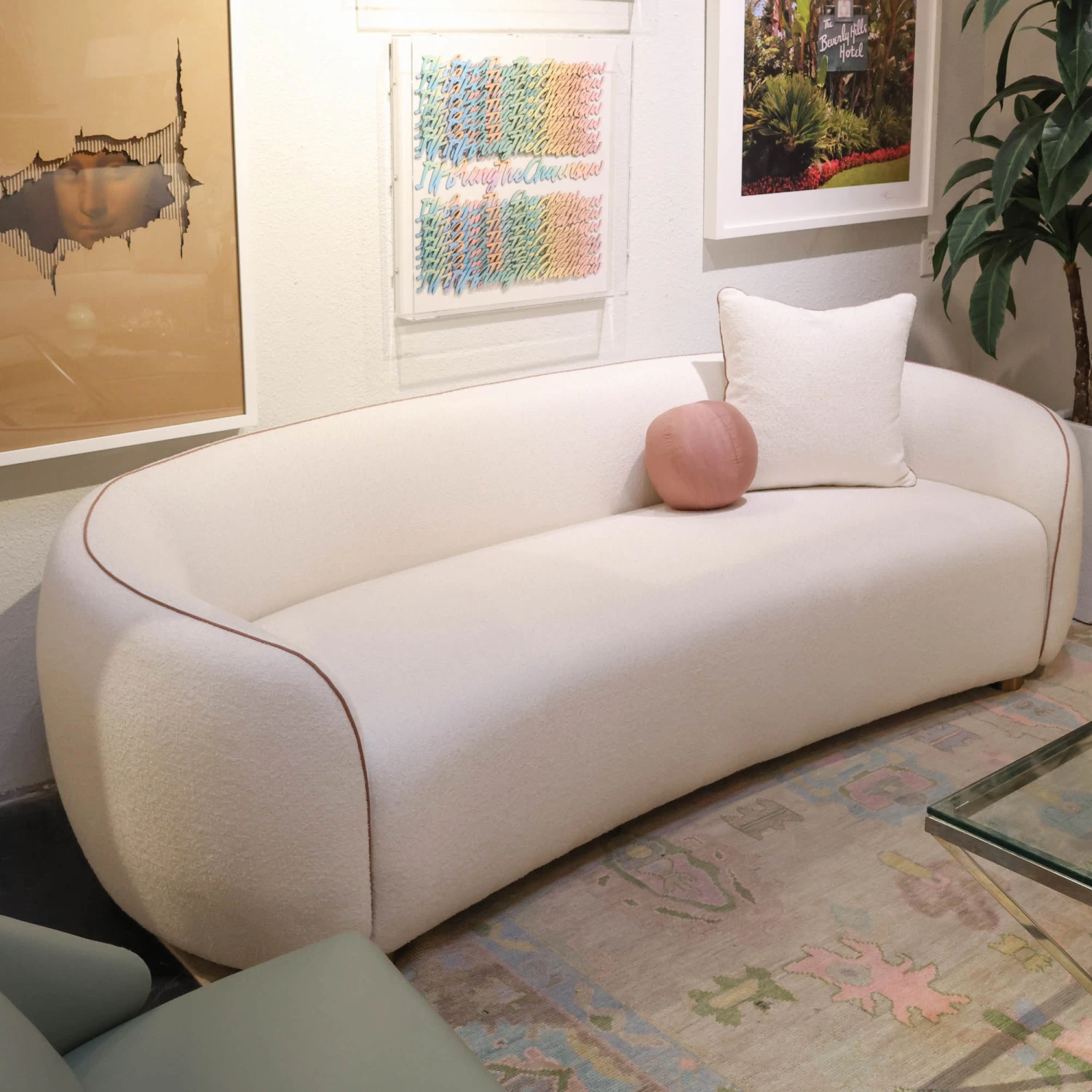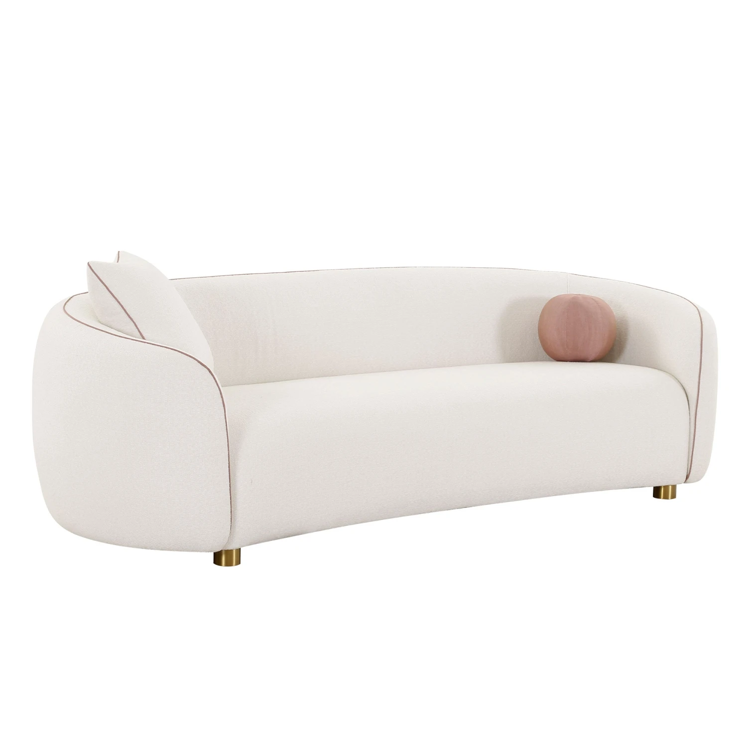 A modern low profile with curved arms invites you in.ย This siren features aย feminine touch of mauve pink pipingย against texture-rich ivory woven fabric. Brassย feetย add extra appeal.ย