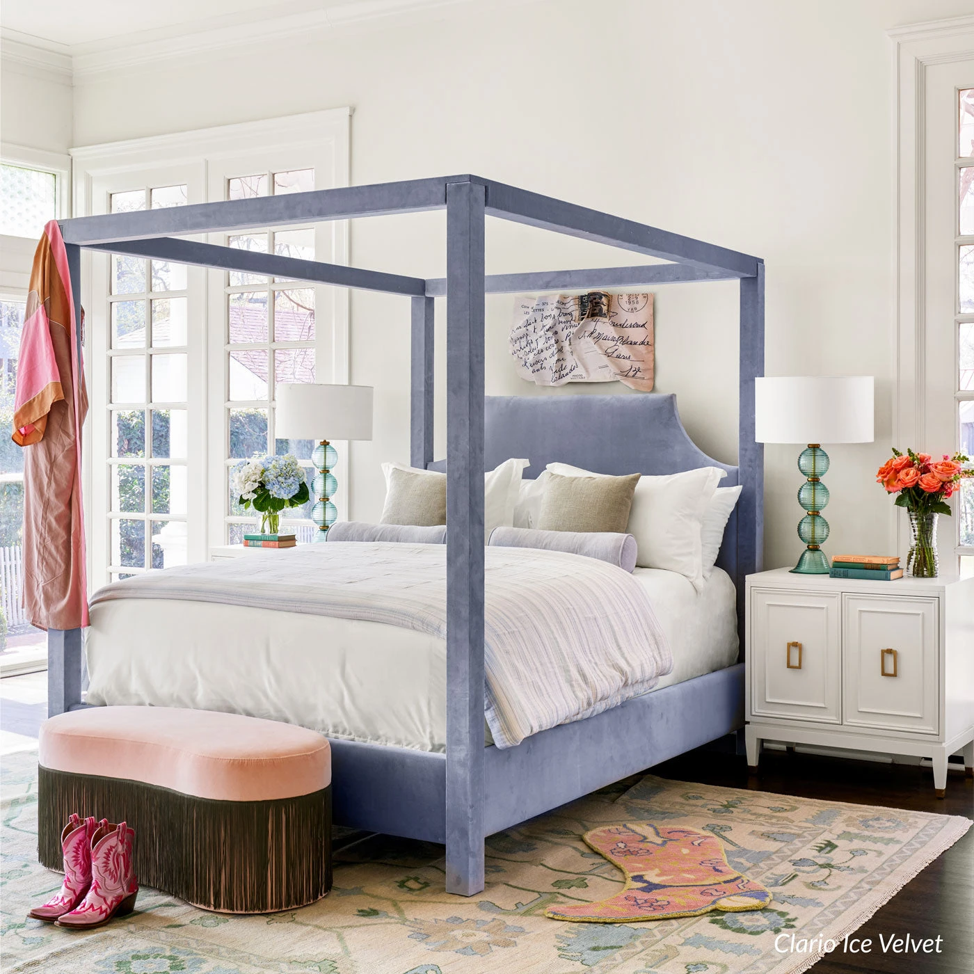 Made to order in the fabric of your choice, our custom Provence Canopy Bed features a show-stopping canopy design, accentuated by a chic headboard with inverted corners.ย