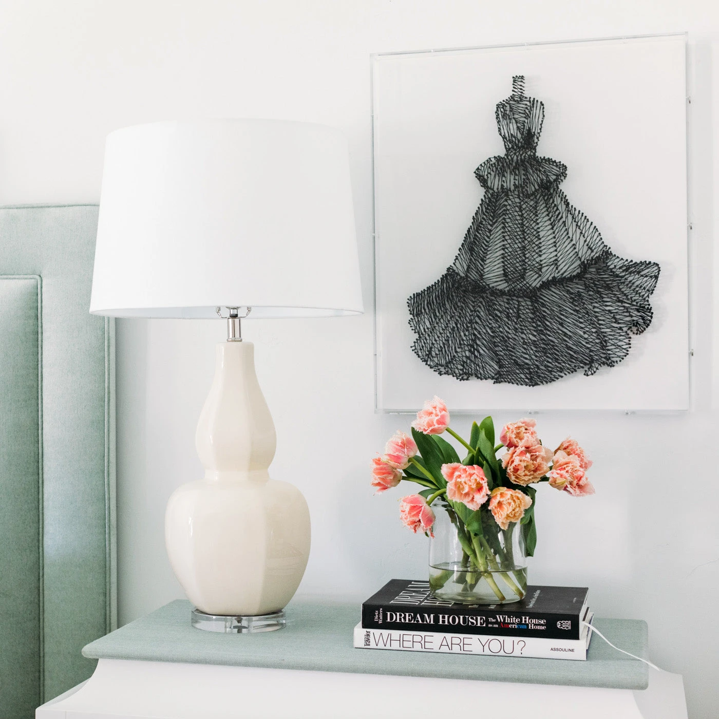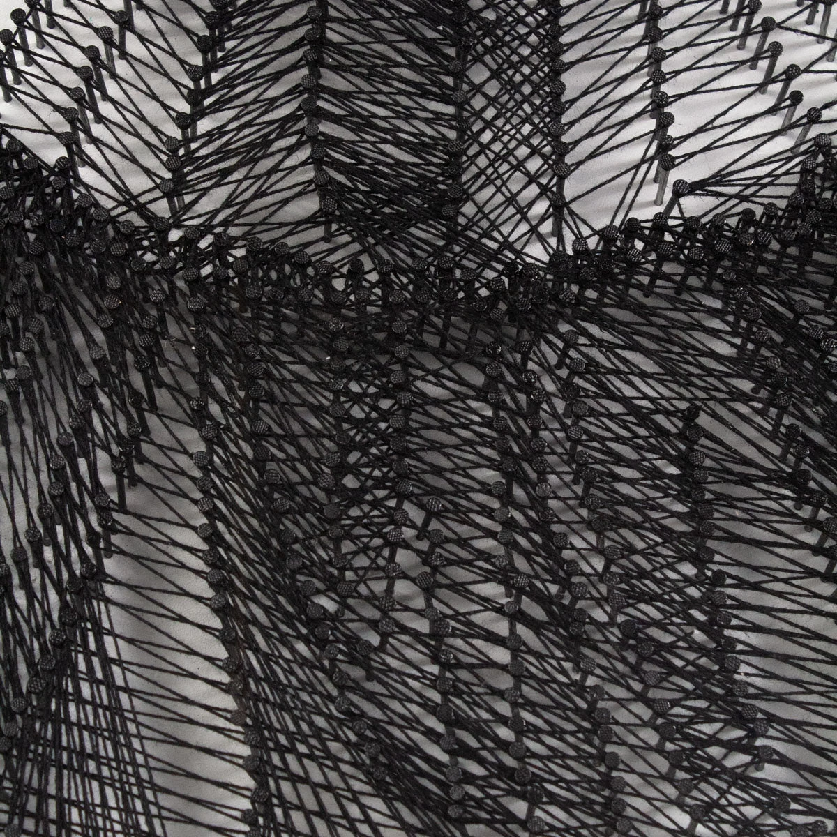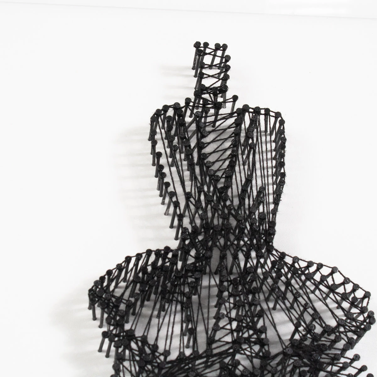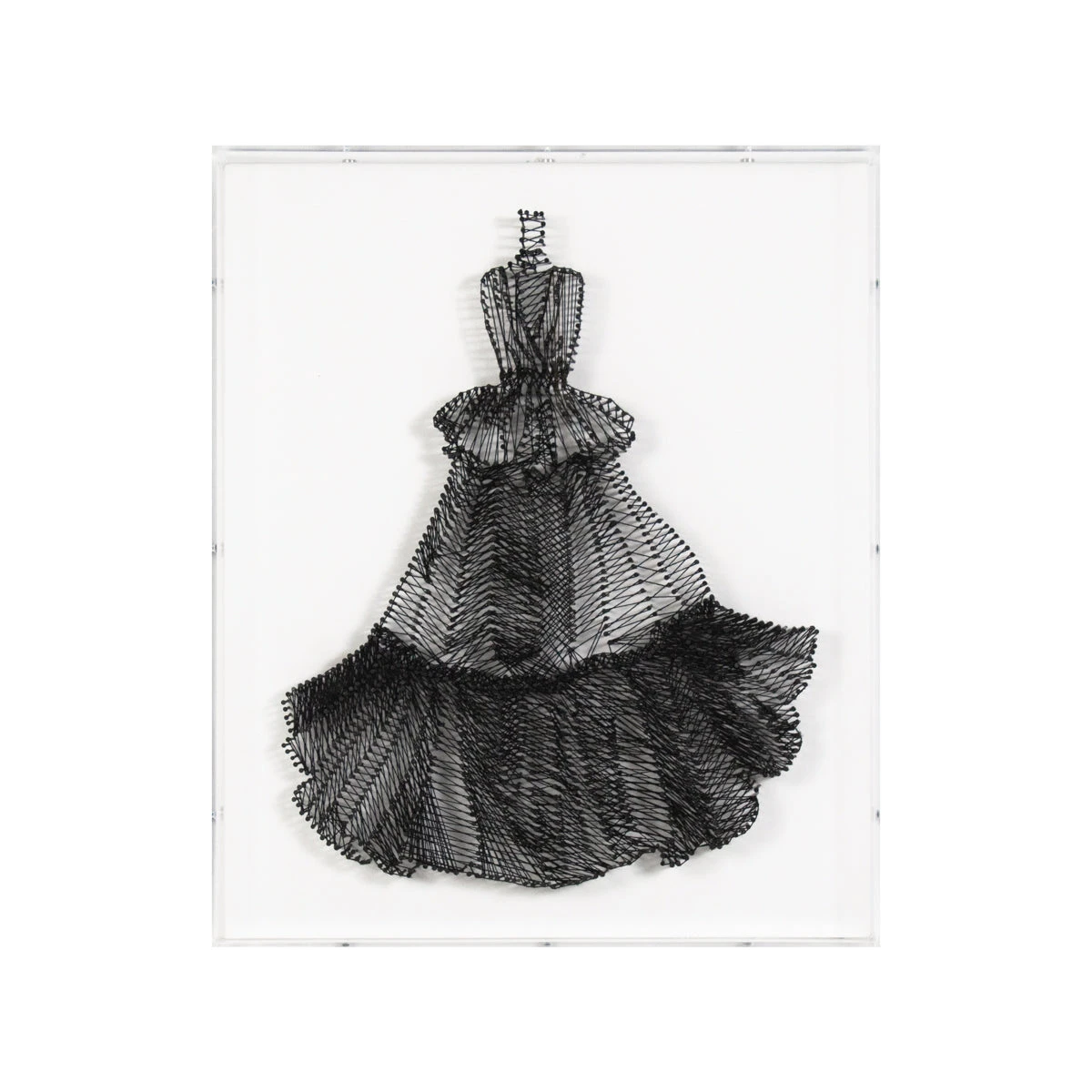 Mix and match with with the rest of theย Damsel & Dapper Seriesย for a fun-filled wall. Hand-placedย nailsย are hammered into canvas and black stringย forms a frilly dress. Framed in an acrylic shadowbox.