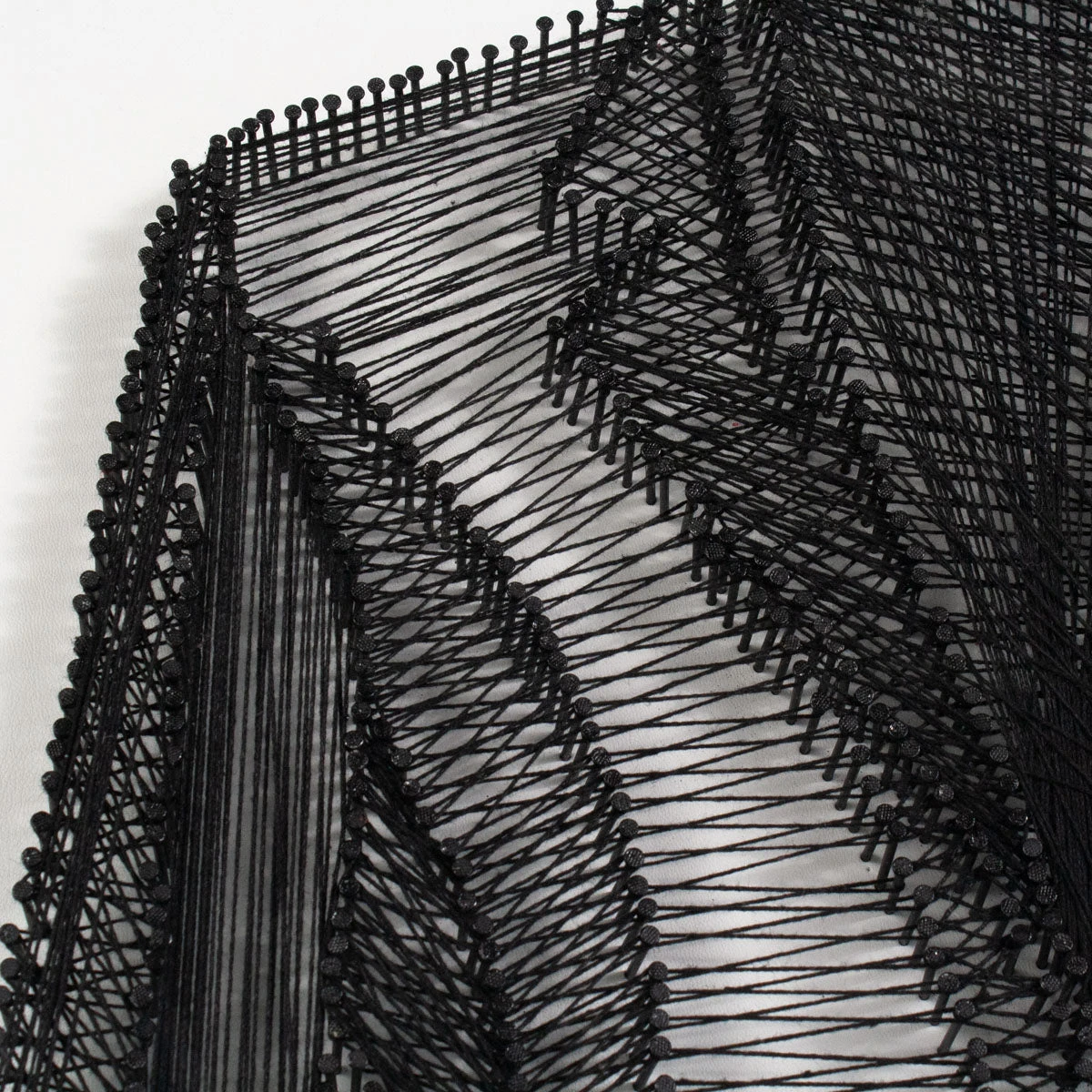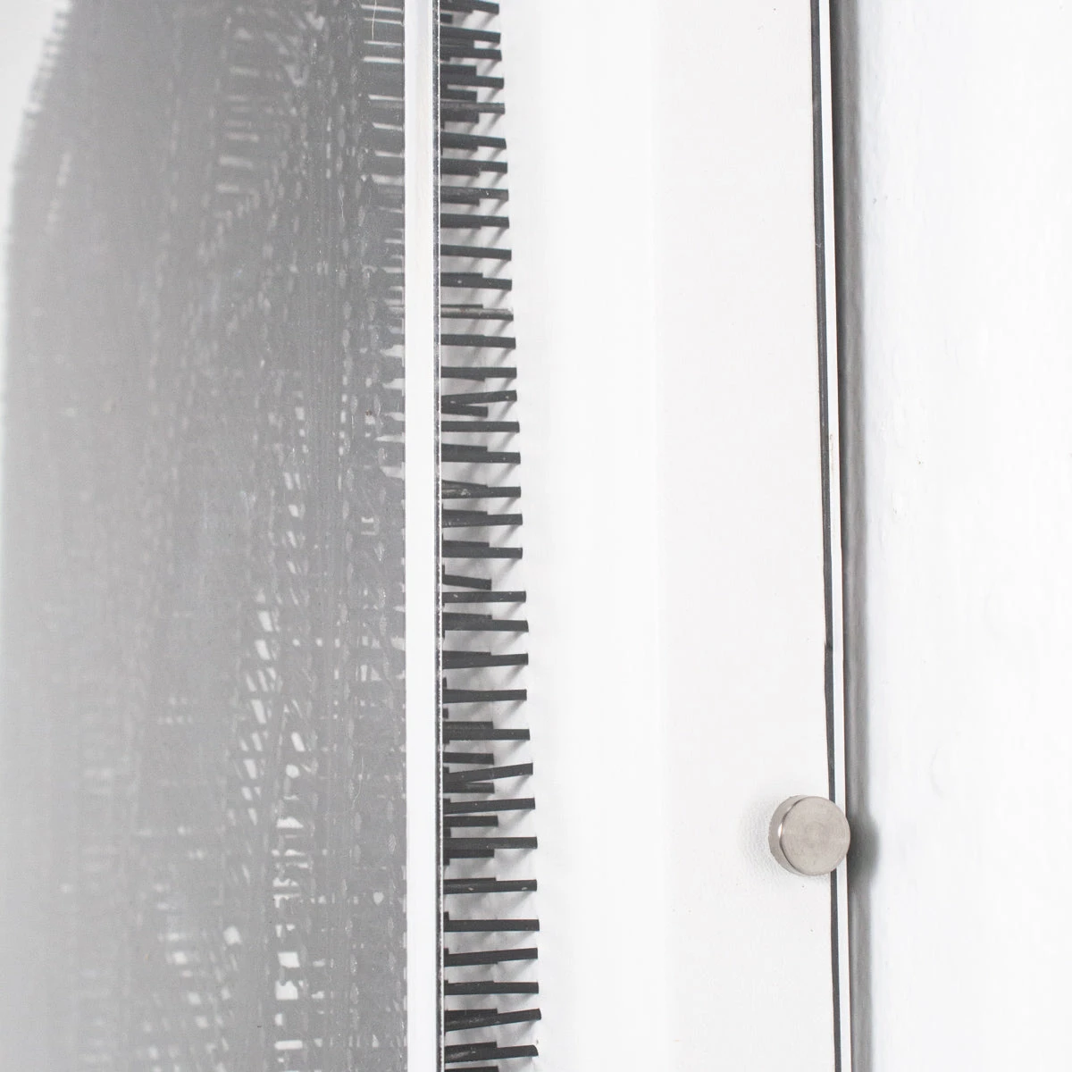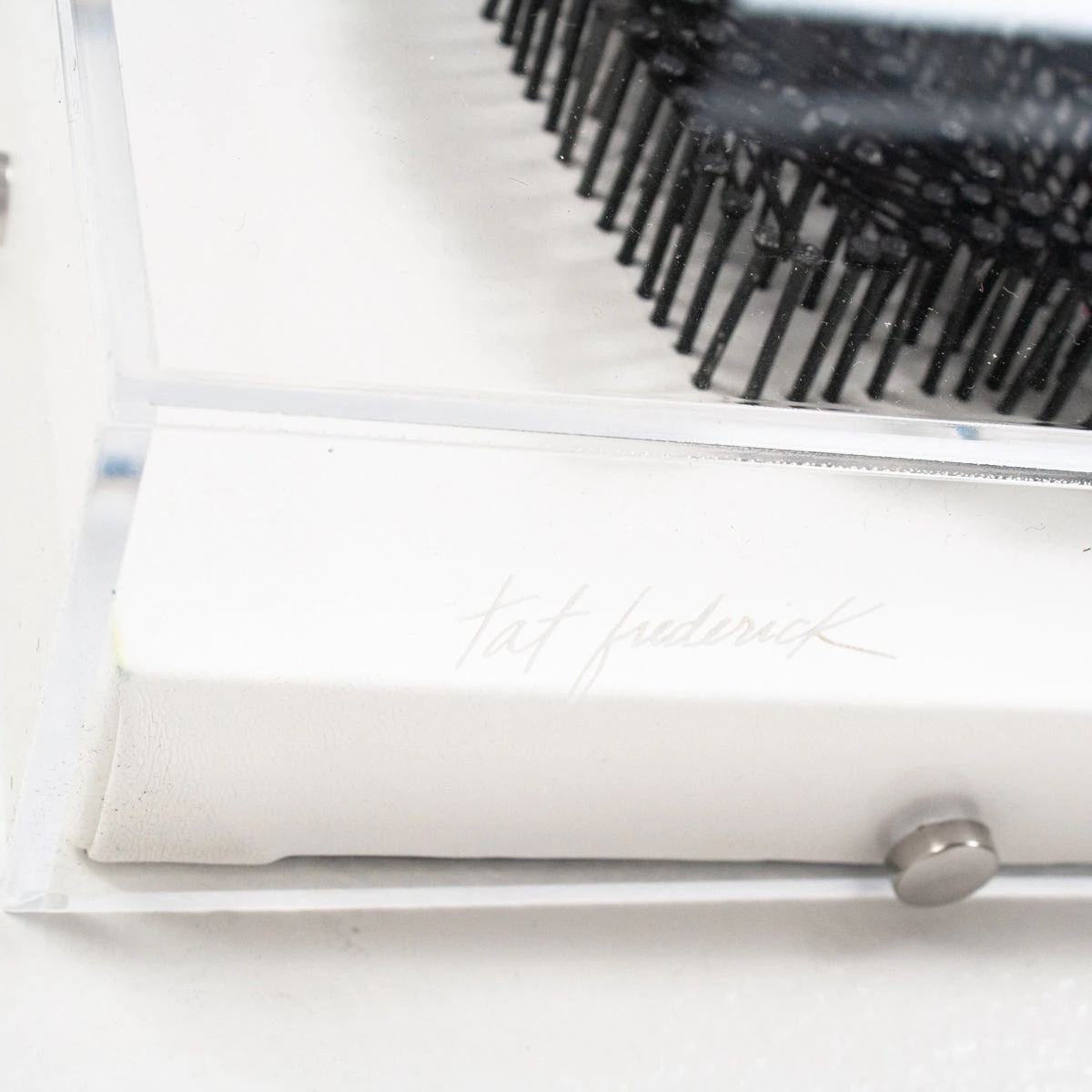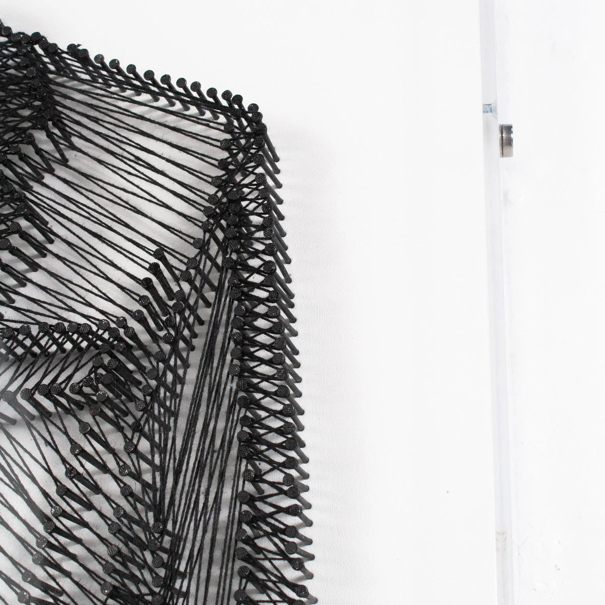 Mix and match with with the rest of theย Damsel & Dapper Seriesย for a fun-filled wall. Hand-placedย nailsย are hammered into canvas and black stringย forms a jacket. Framed in an acrylic shadowbox.