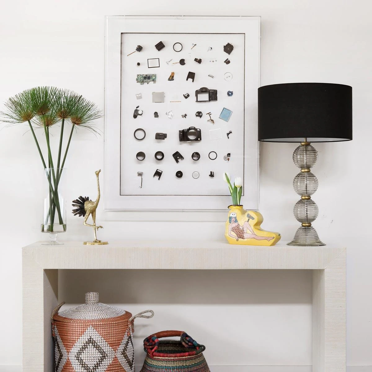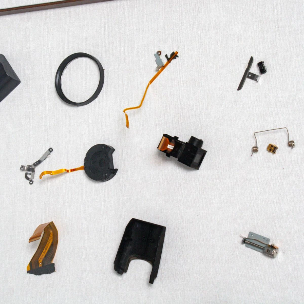 Deconstructed camera art we are HERE for. Neatly arranged camera parts float on canvas in an acrylic shadowbox.