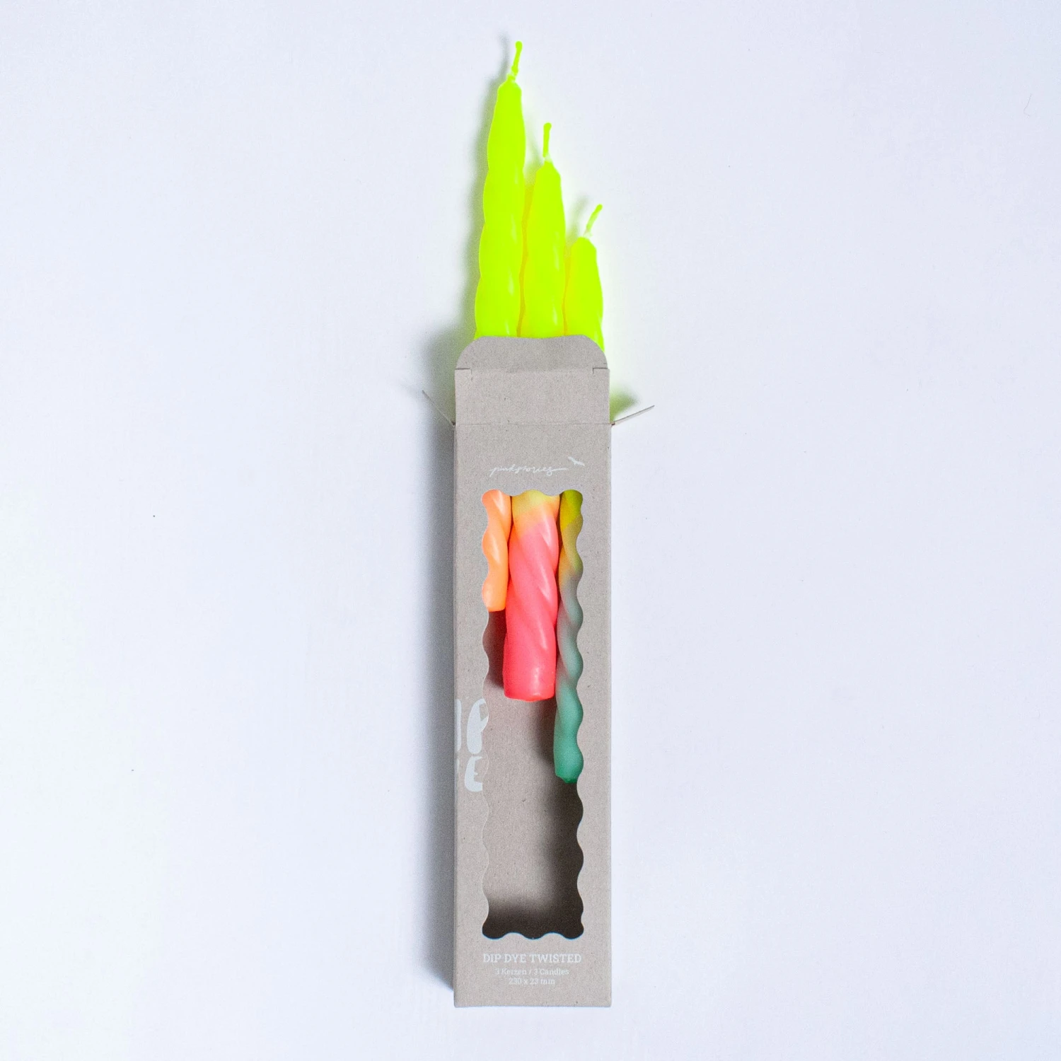 Set of three lovingly hand-colored, twisted taper candles in a neon look. While the colors stay the same, the pattern gradients vary with each candle to make it one-of-a-kind.