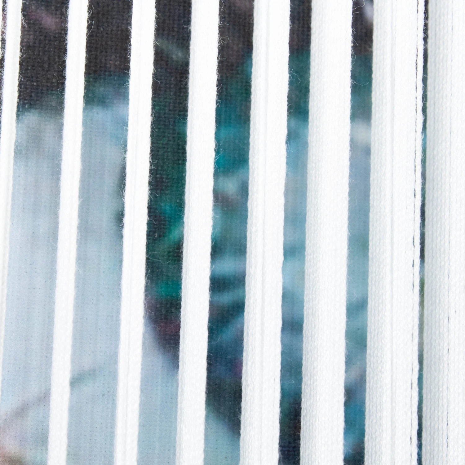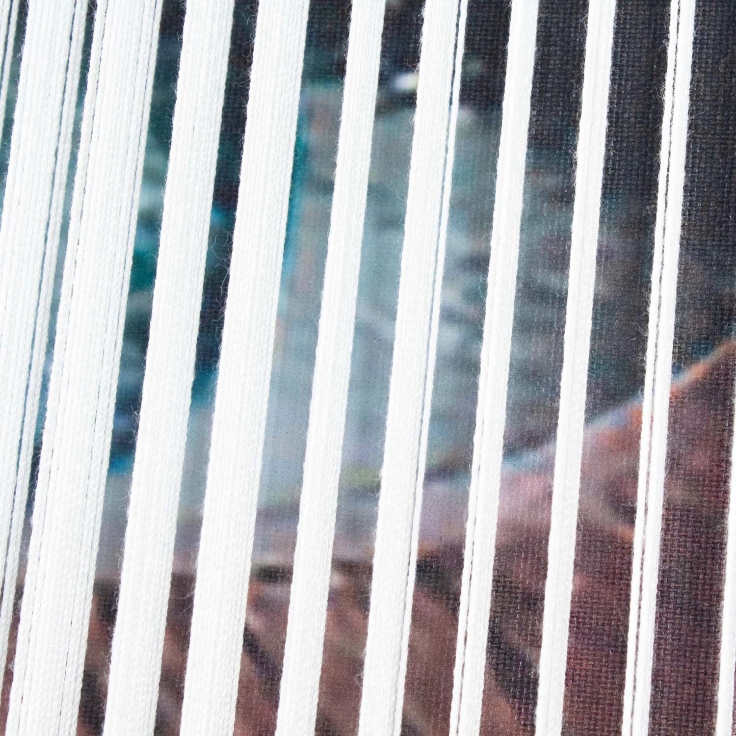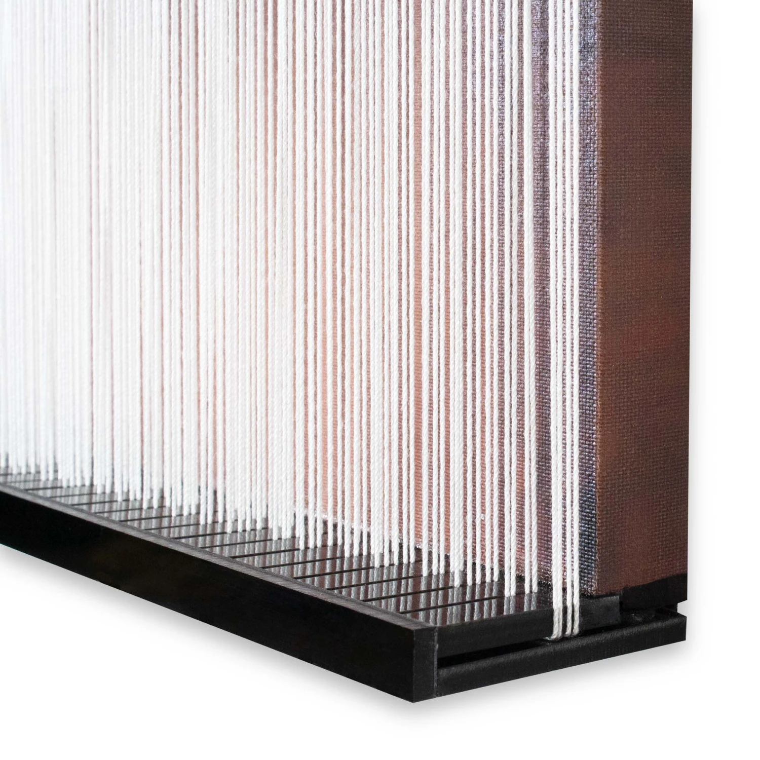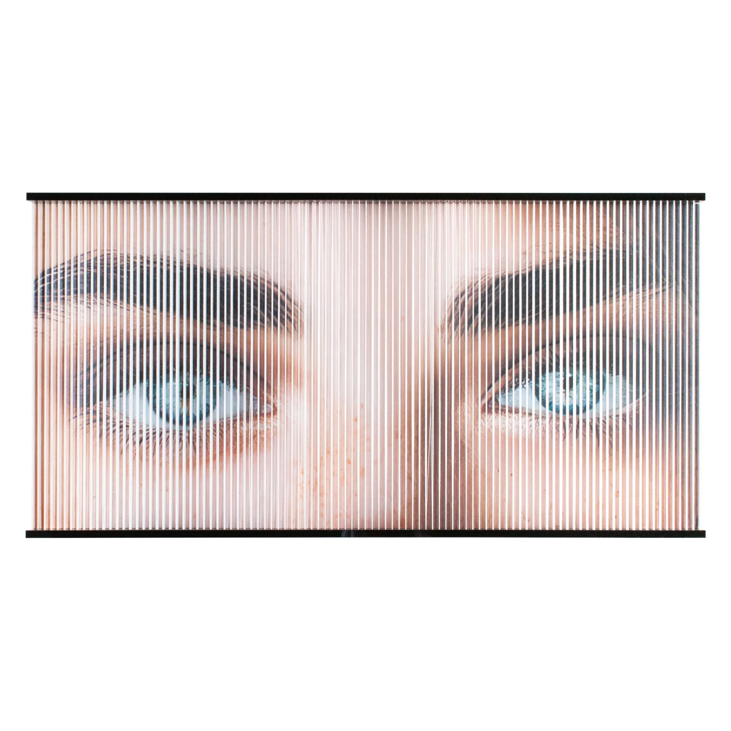 Mixed media artwork by Tat Frederick featuring a printed eye painting with segmented stringsย overlaid on top.ย