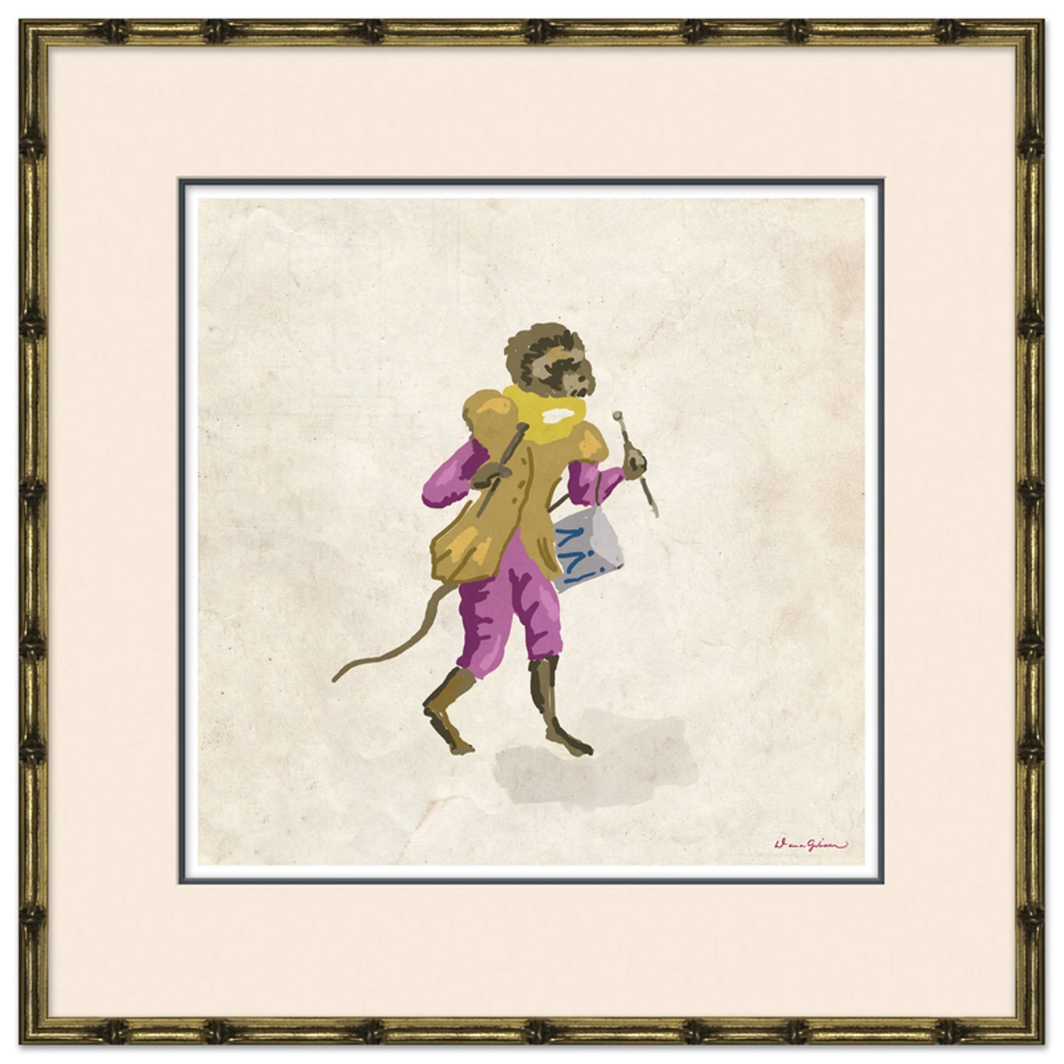Giclée print of an acrylic painting by Dana Gibson. ‘Drum Monkey‘ is printed on archival paper and framed in a gold faux bamboo frame.