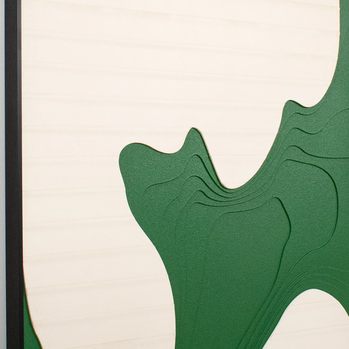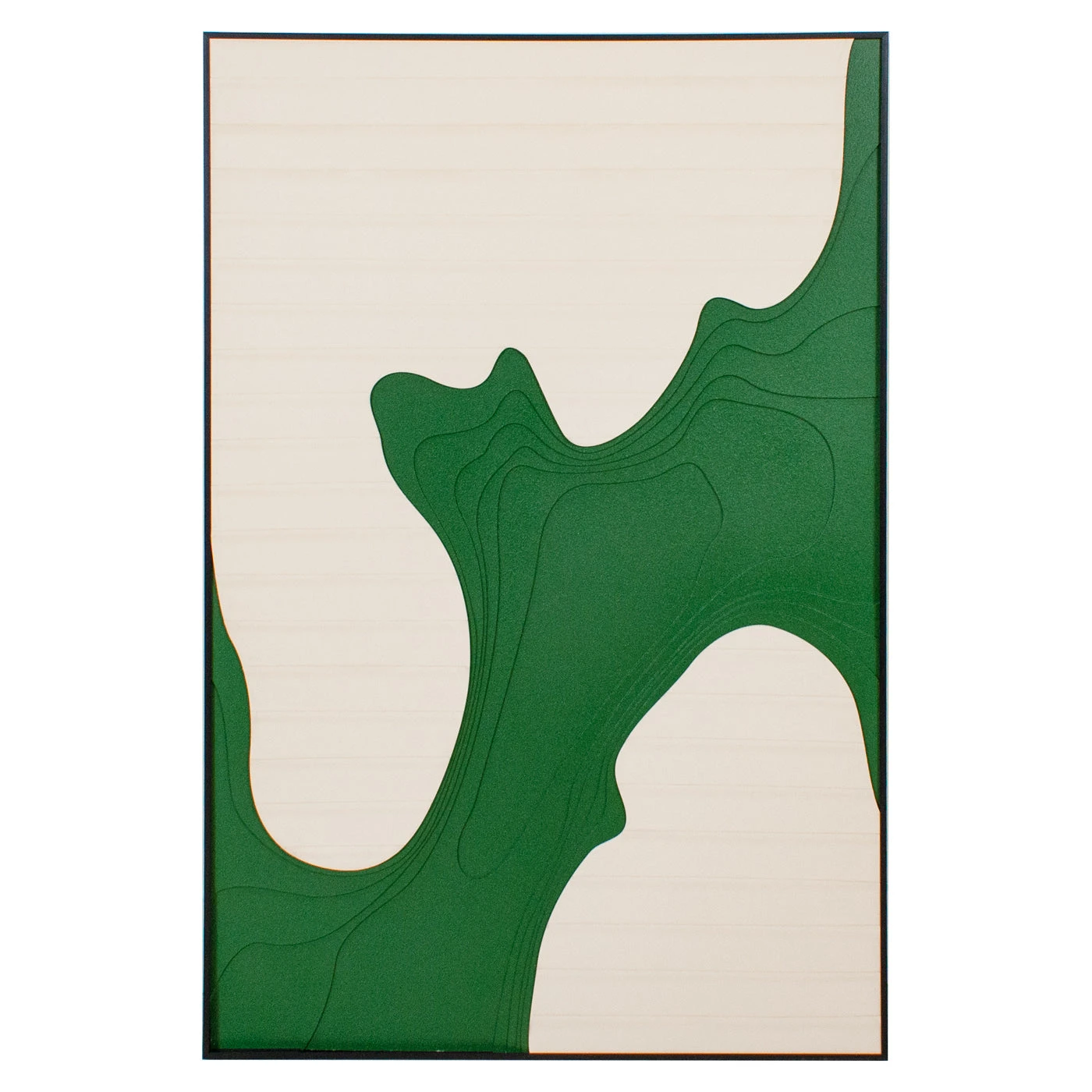 ‘Elements’ is an abstract piece comprised of graduated layers of green leather with a topmost layer of wood sandstone. Reminiscent of a topographic map, this eclectic piece is sure to up the intrigue in your space.