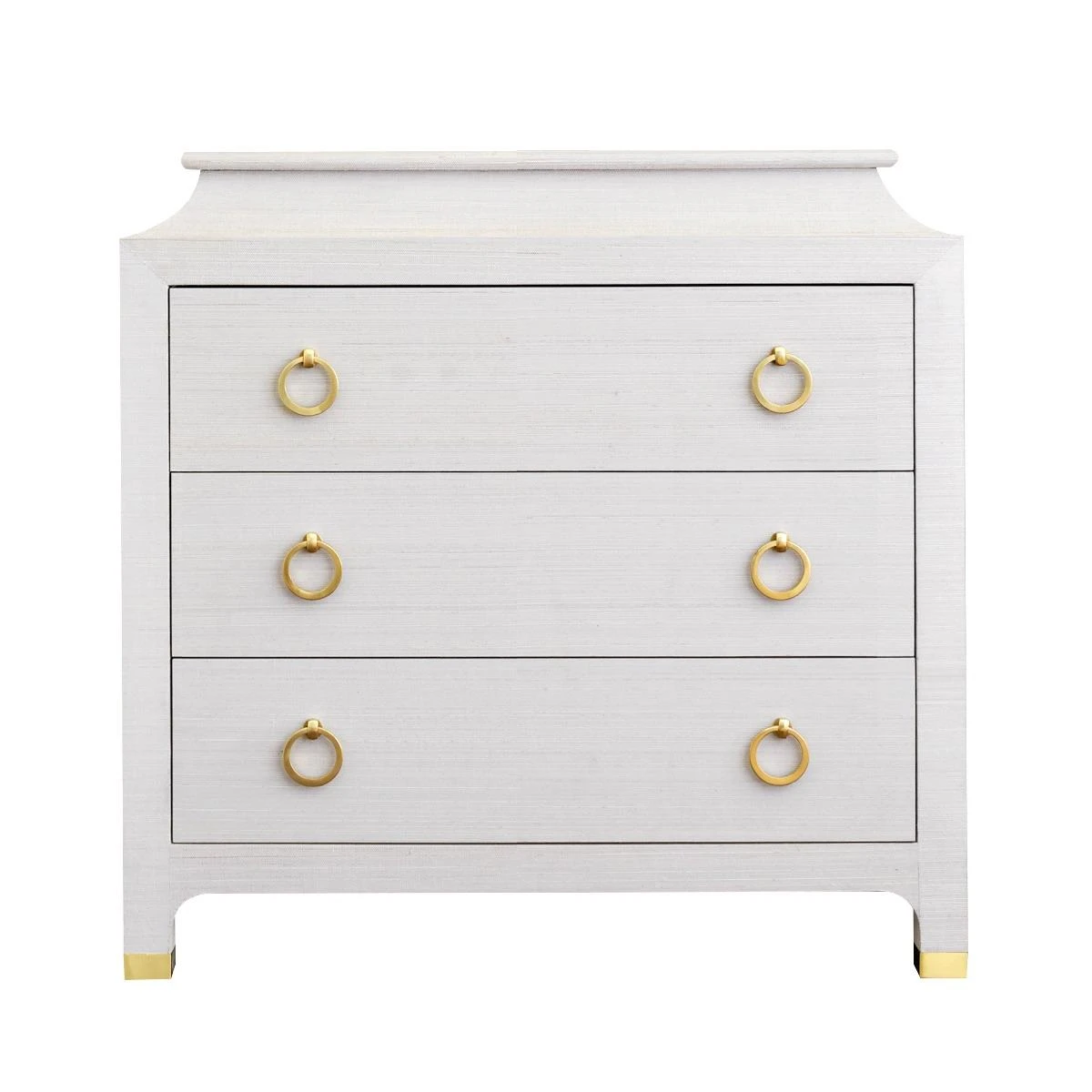 Sly and masterful, our Espionage Chest steals the show with its unique design. Pale mist grasscloth is accented with brass pulls and sabots for a refined look.