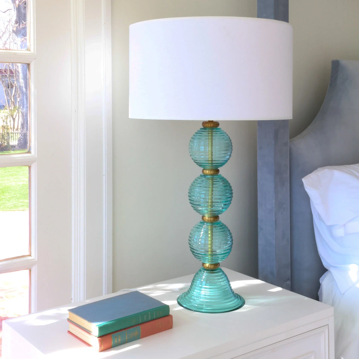The classyย blue hand blown glass base on our Essex Lamp is topped with aย white linen shade and gold finial.