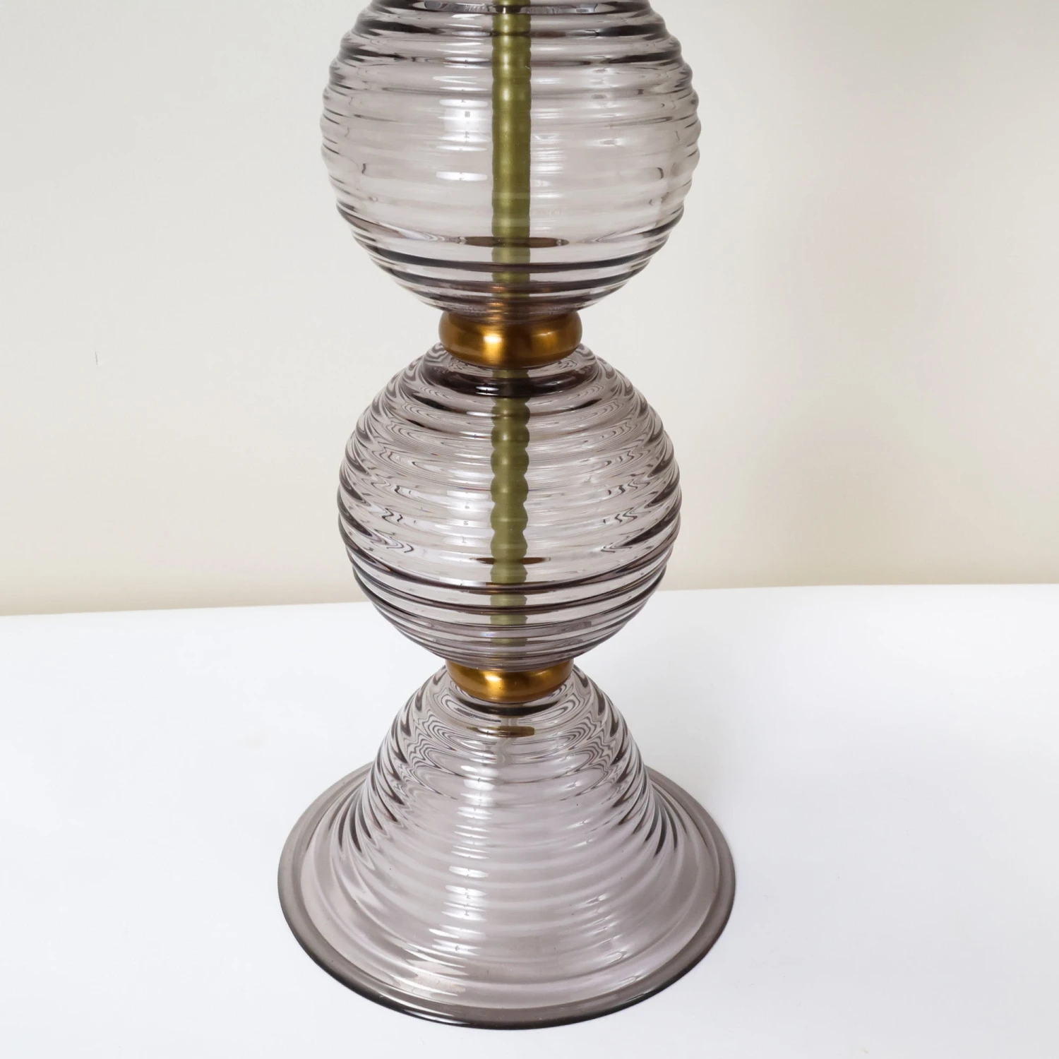 The classyย dark grey hand blown glass base on our Essex Lamp is topped with aย black linen shade and gold finial.