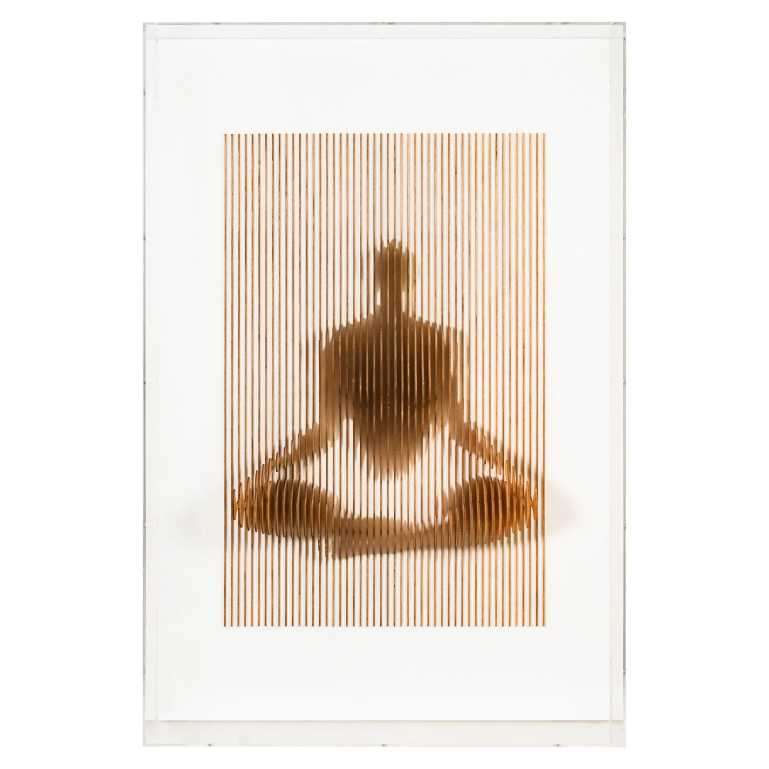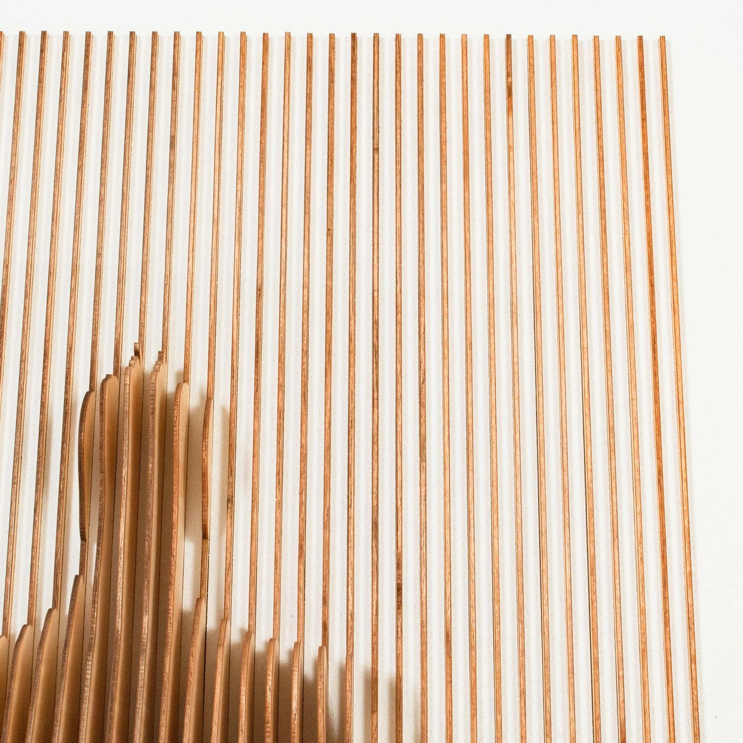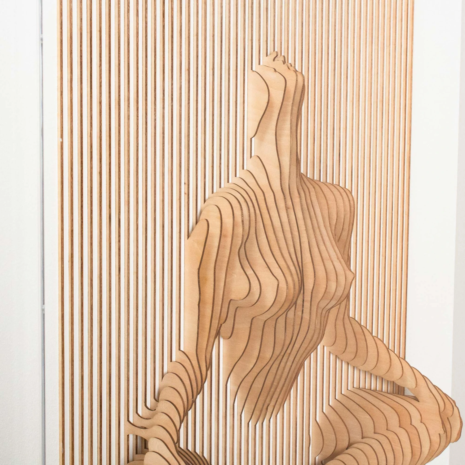 Mixed media artwork by Tat Frederick.ย Laser cut wood forms the body of a female with a stunning 3D effect.ย Mounted on white sandstone.