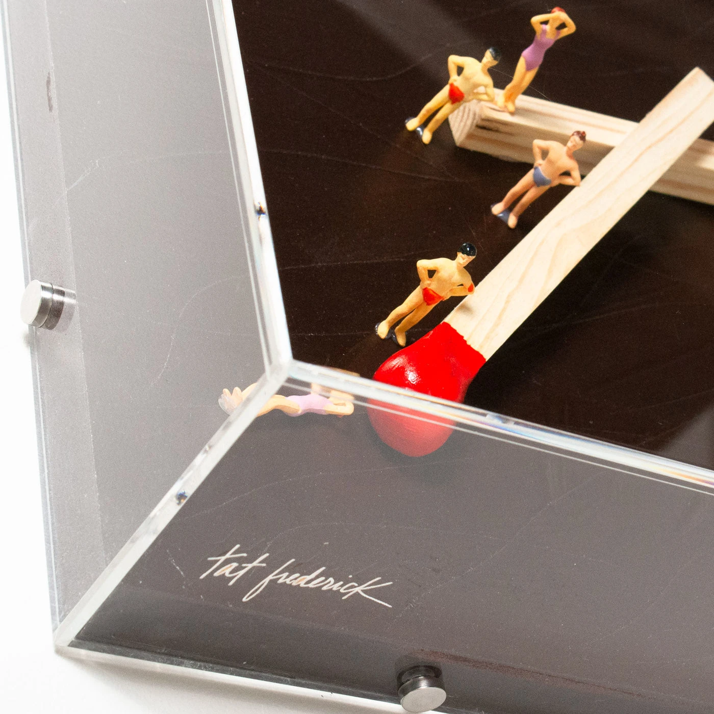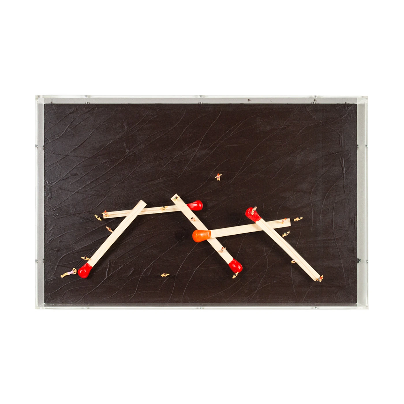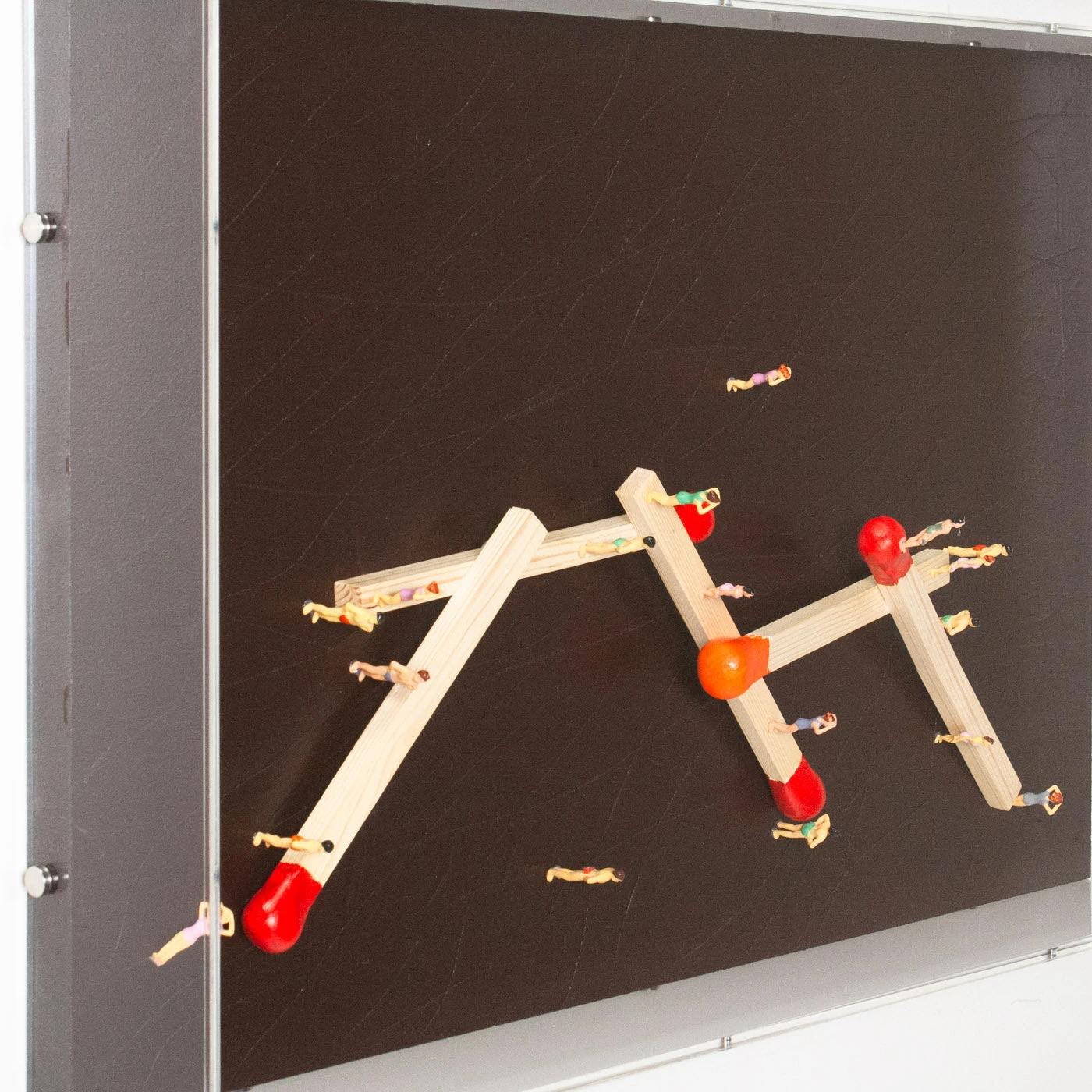 From the Tat Frederick Studio, Flash Burn is made out of faux matches and miniature figures fixed to a painted black canvas and framed in an acrylic shadowbox.
