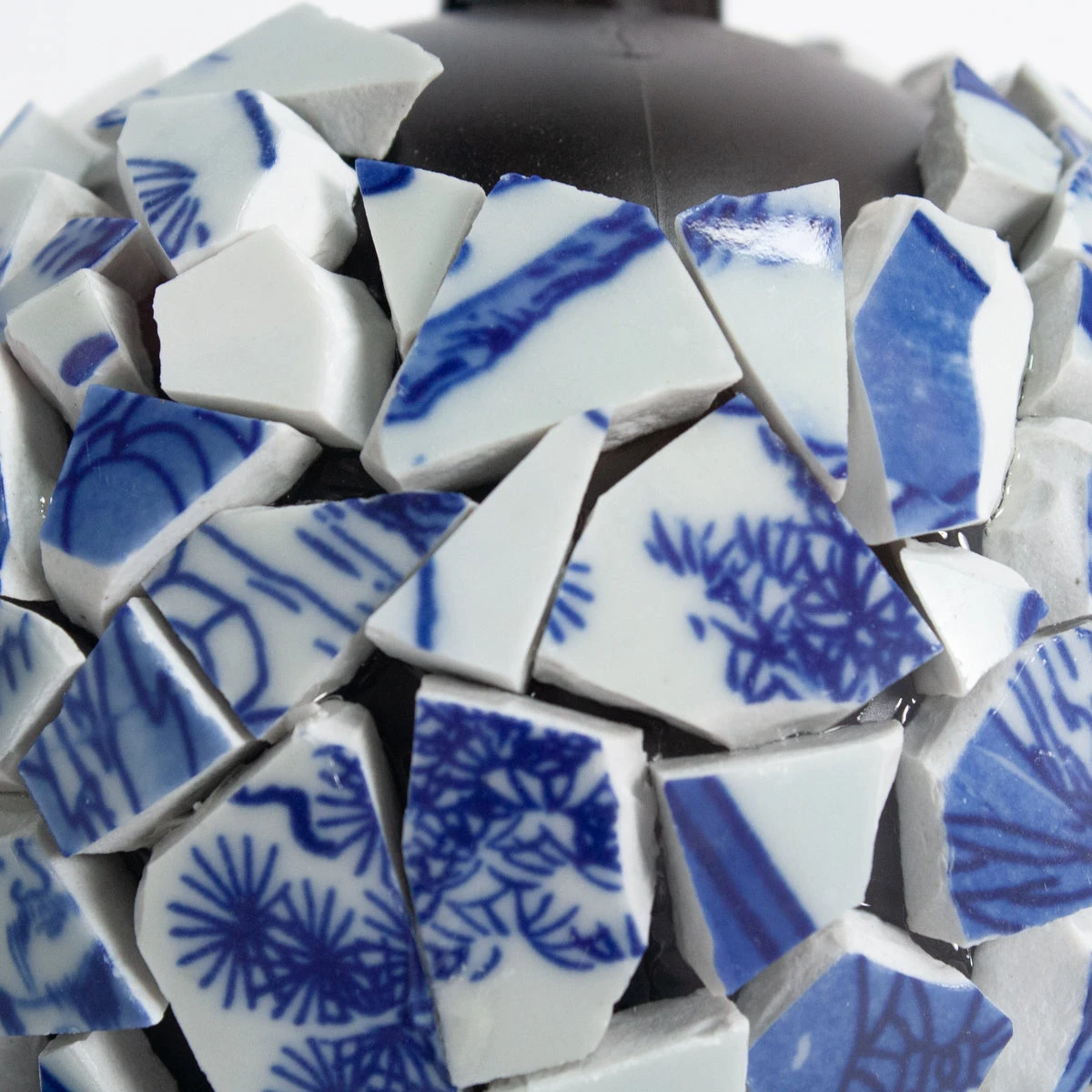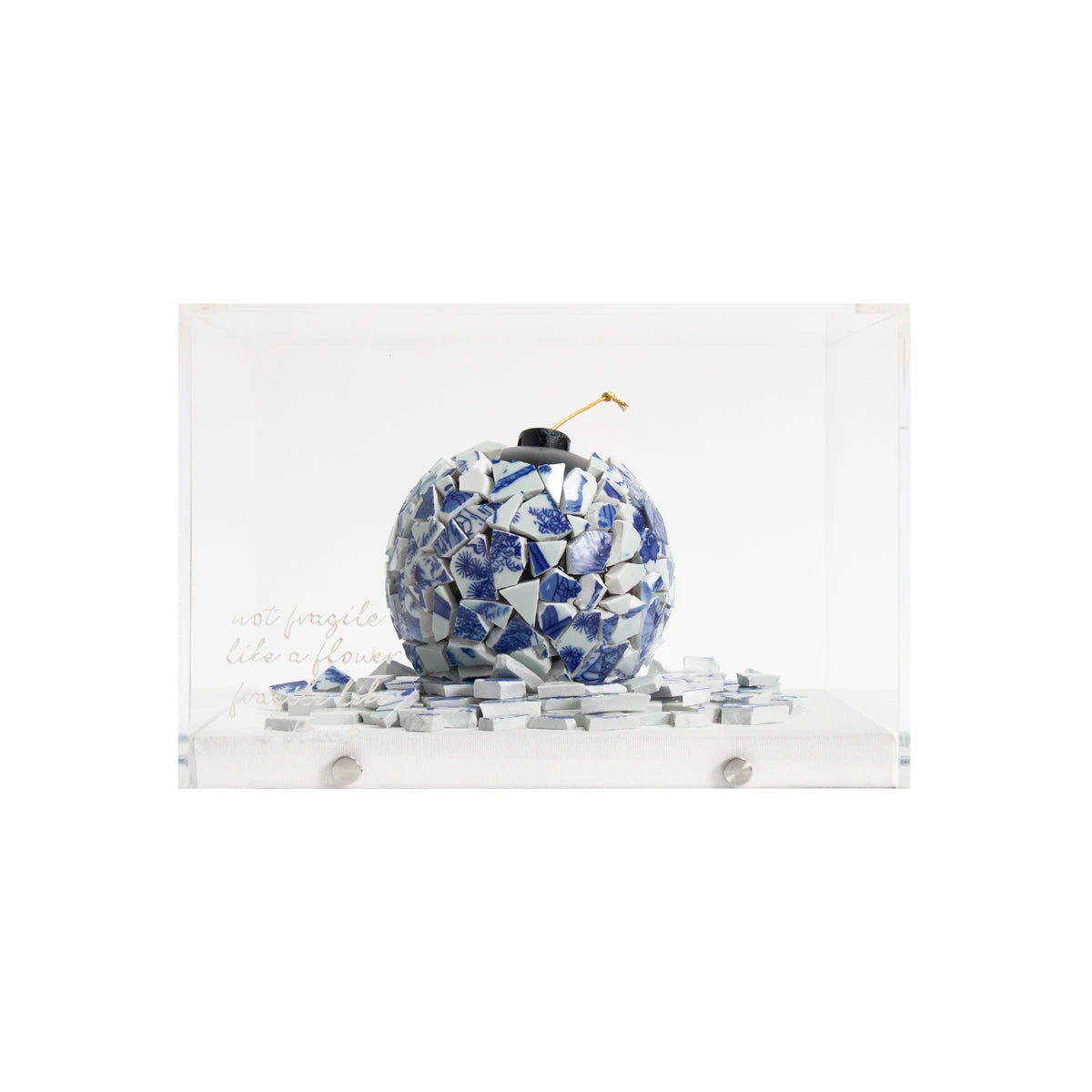 Shattered ginger jar pieces individually placed on a bomb sculpture. Mounted on white canvas and framed in an acrylic shadowbox. Quote engraved on the acrylic box.ย
