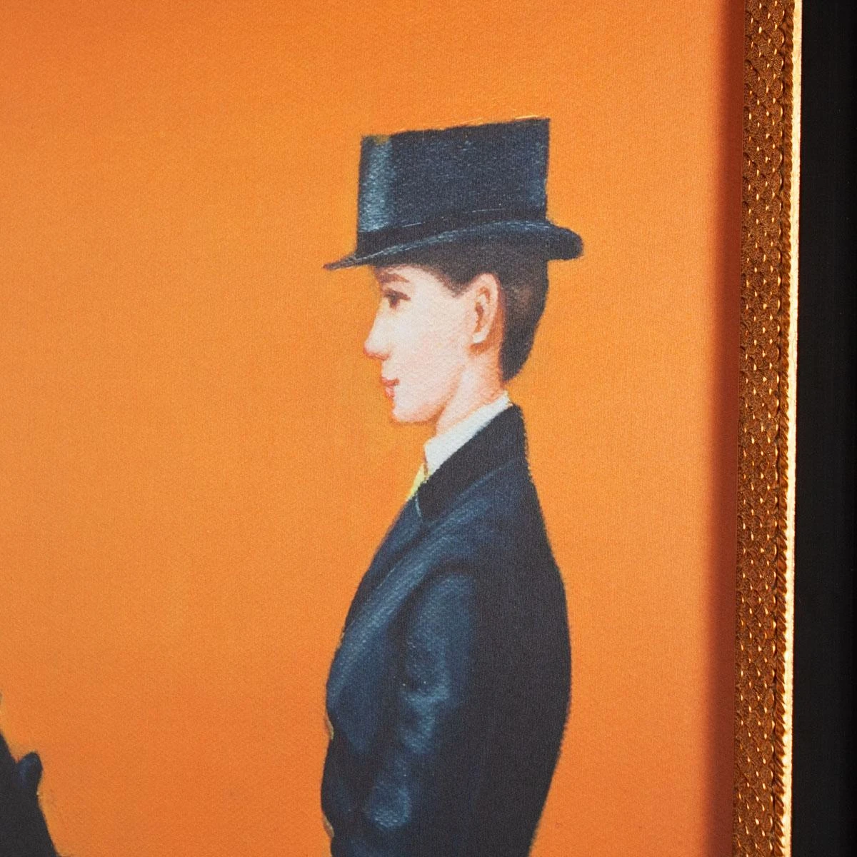 Stately modern printed equestrian art on silk cloth in a black and gold frame. This is an incredible piece!ย