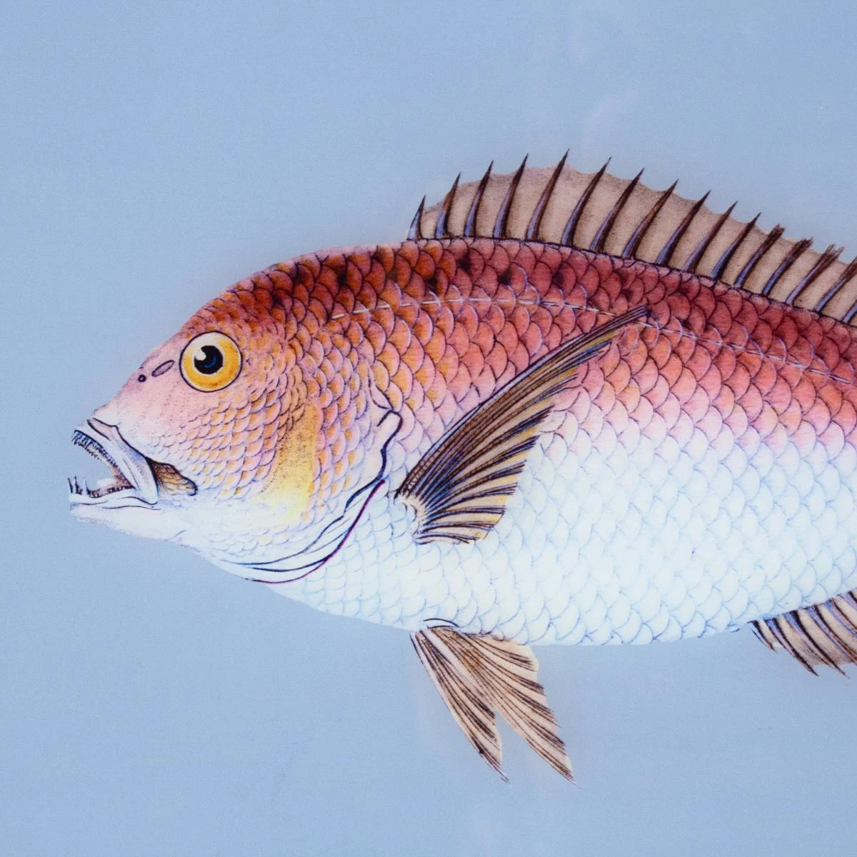 Scout exclusive pastel fish artwork. UV printed on acrylic film with a black and gold frame.