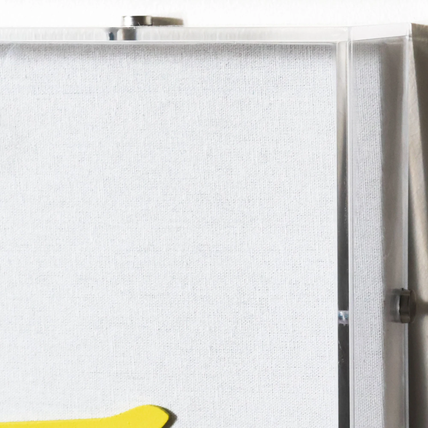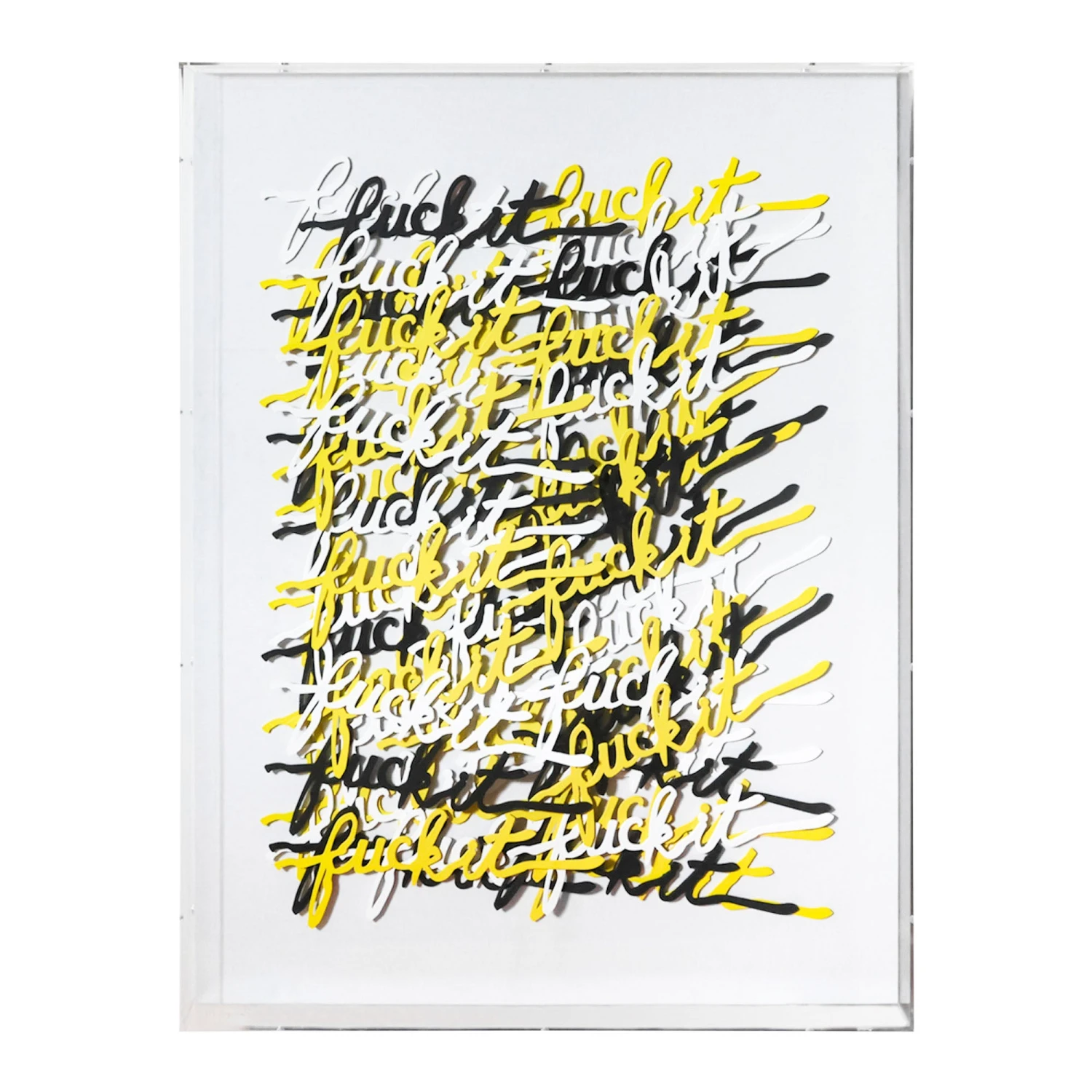 Laser cut words “fuck it” are individually placed on white canvas and framed in an acrylic shadowbox.ย