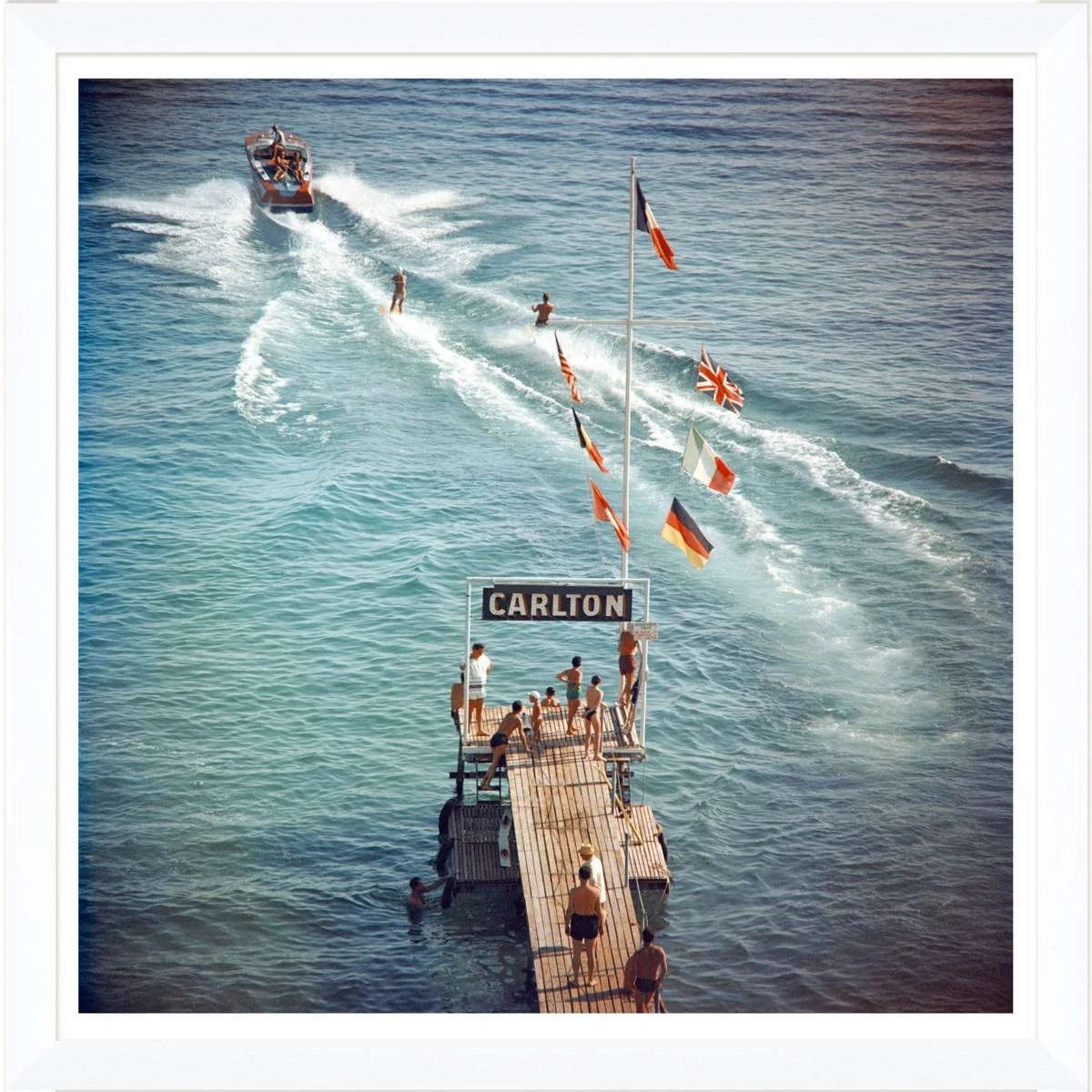 Slim Aarons photography of holidaymakers waterskiing from the pier of the Carlton Hotel in Cannes, 1958.