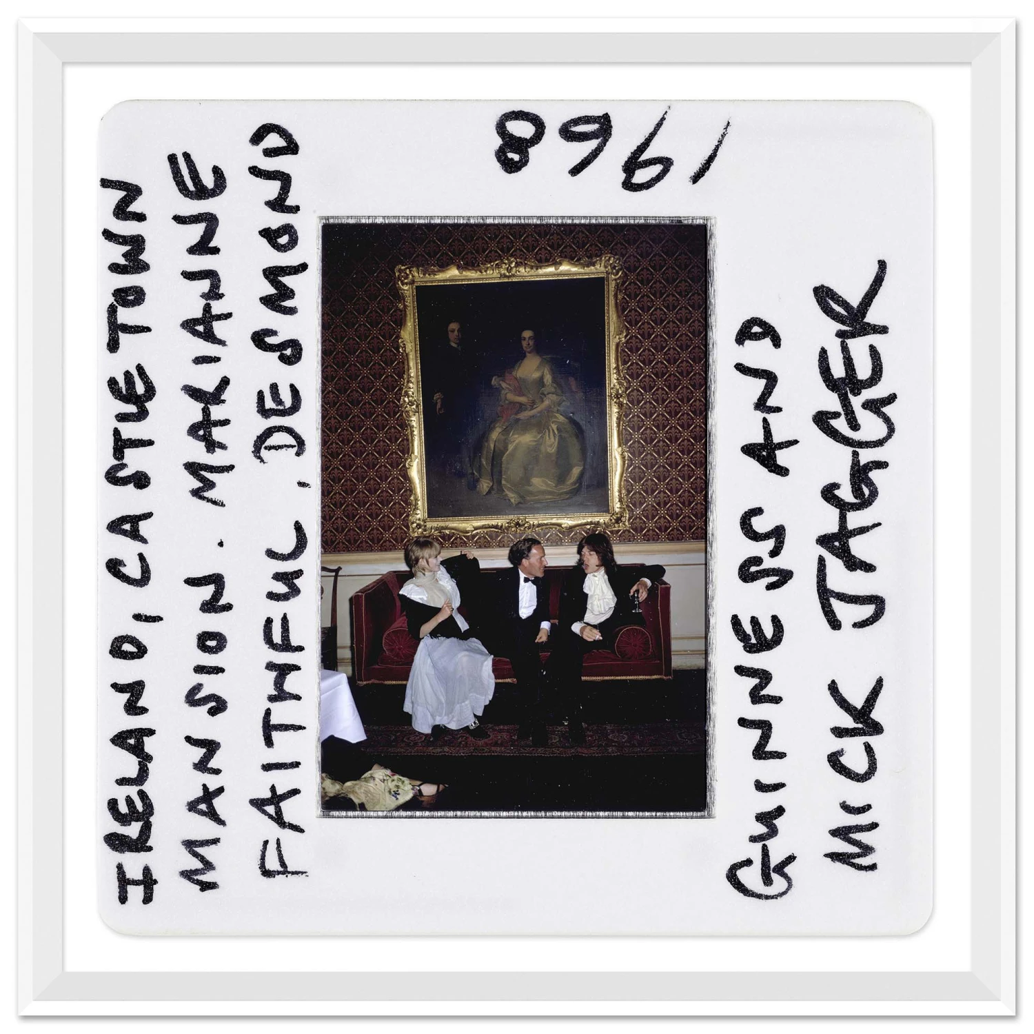Photography by Slim Aarons of singer Marianne Faithfull, the Honorable Desmond Guinness and Mick Jagger at vintage Leixlip Castle.