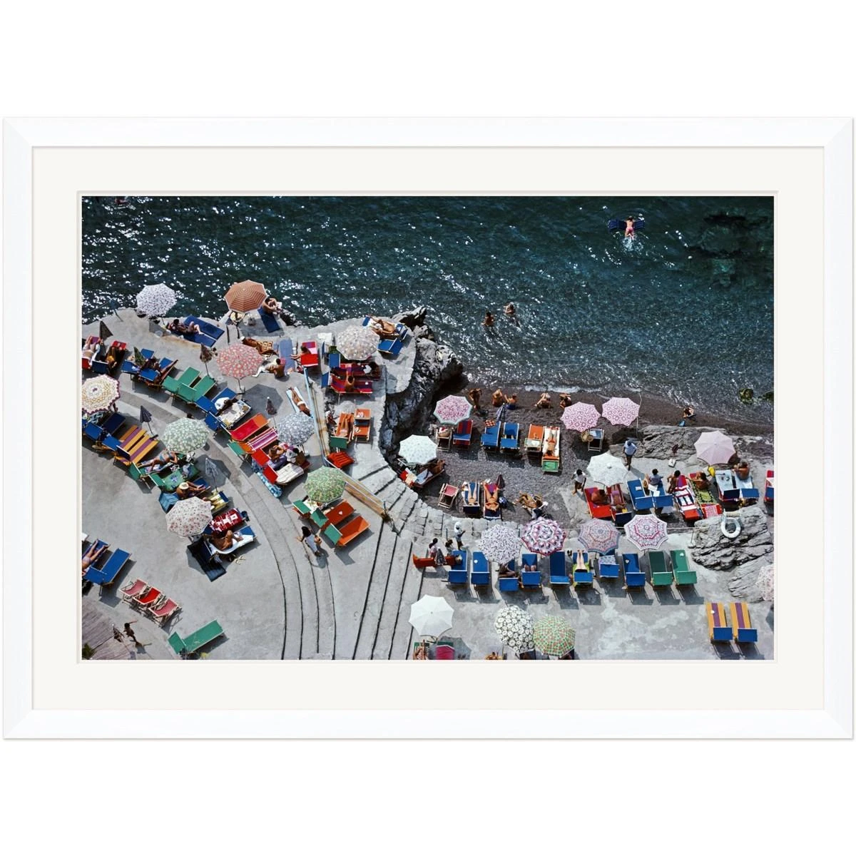 Photography by Slim Aarons of the view looking down on sunbathers and parasols on the beach at La Scogliera in Positano, Italy, 1979.