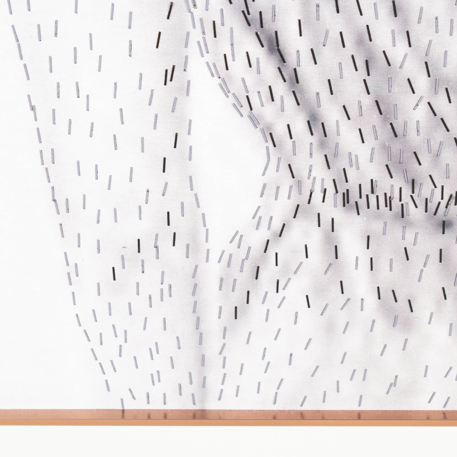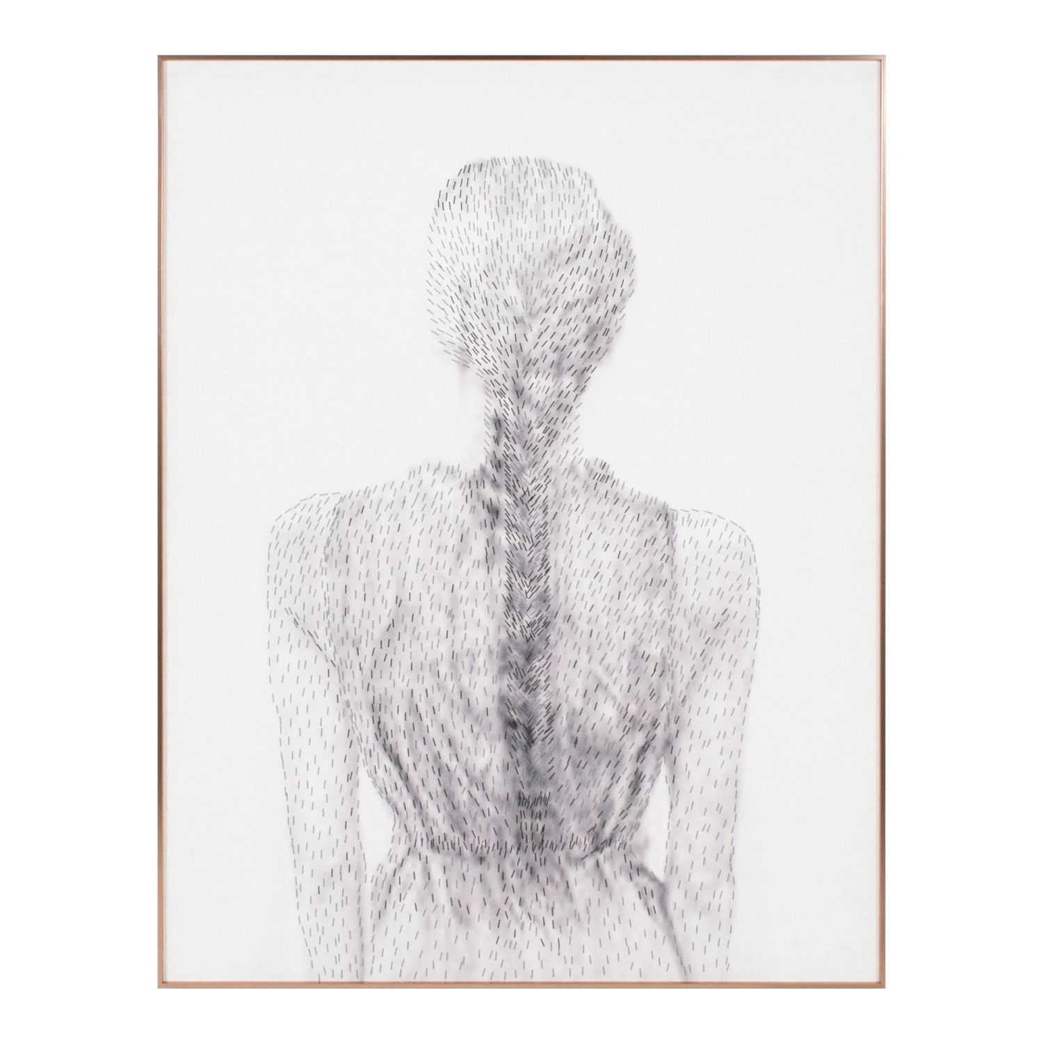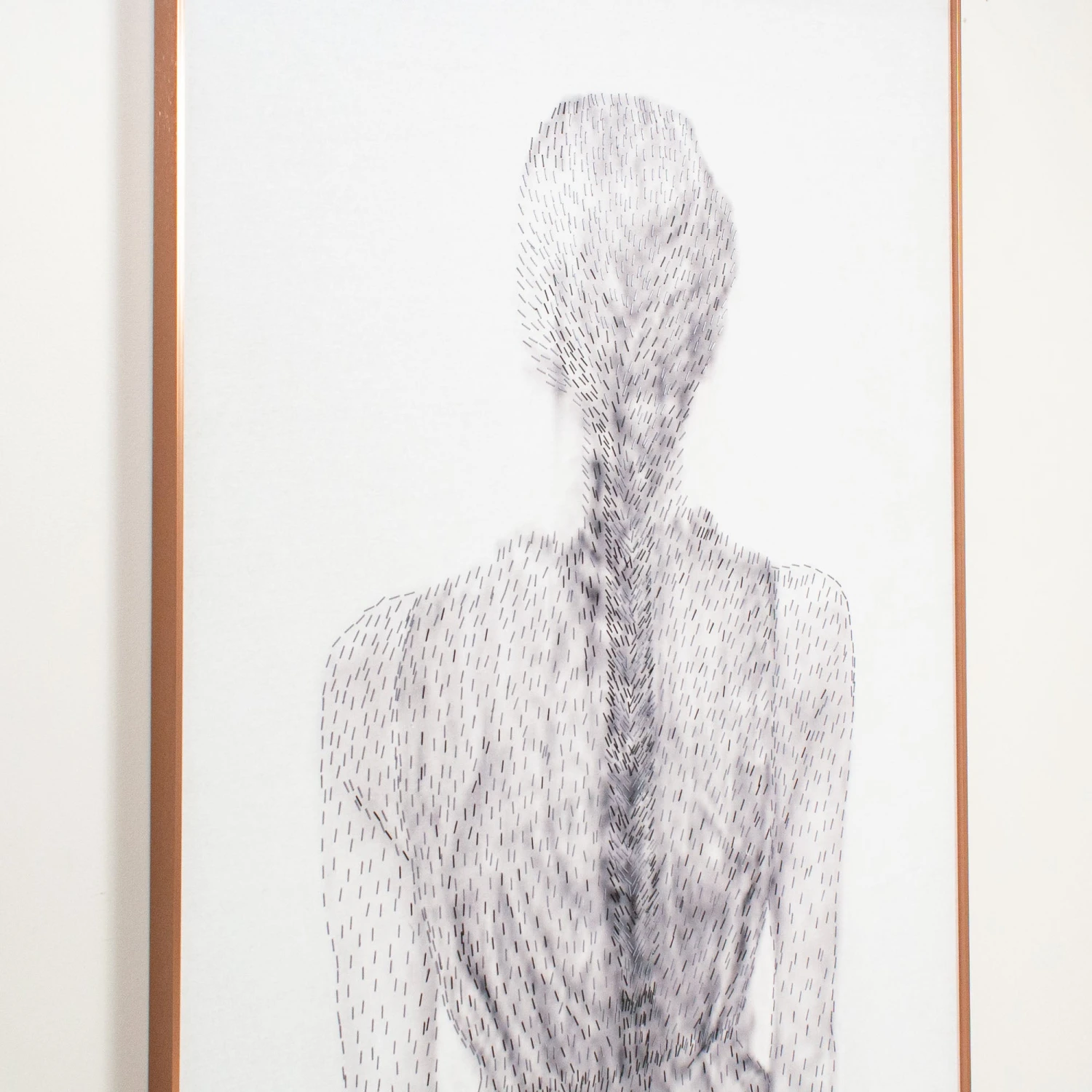 From the Tat Frederick studio, ‘Girl With Braid’ is comprised of staples in various sizes that form the depiction of a girl. Framed in rose gold metal.