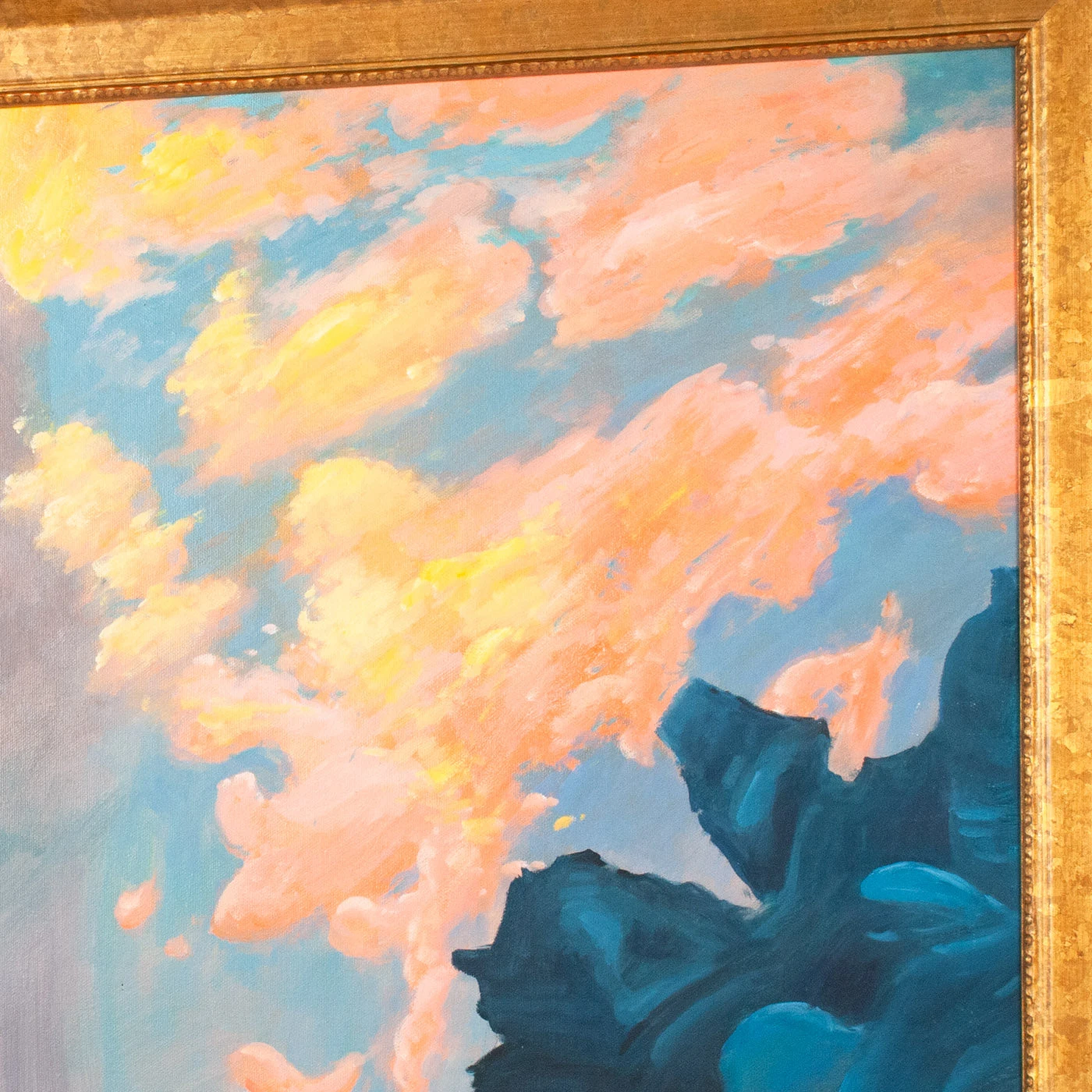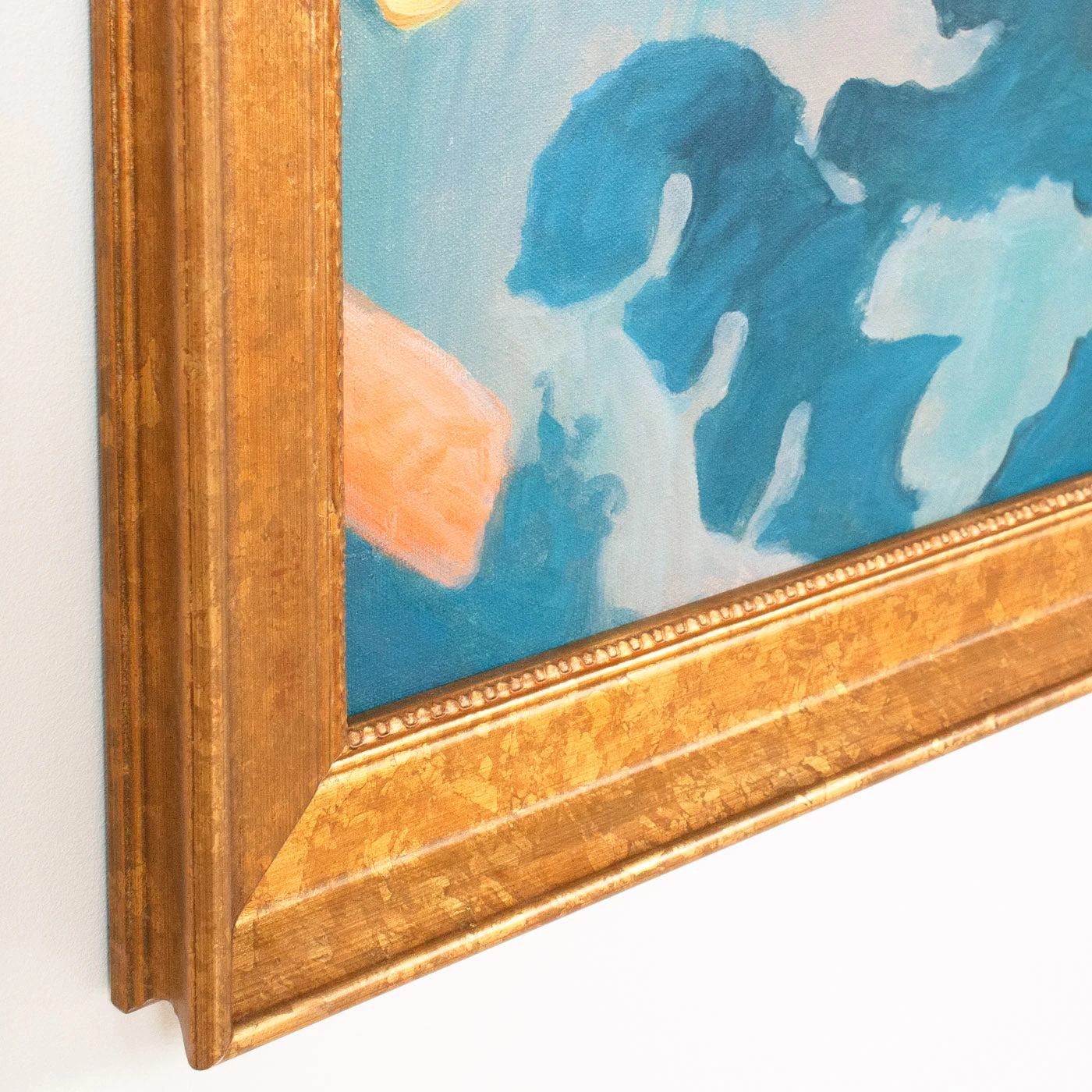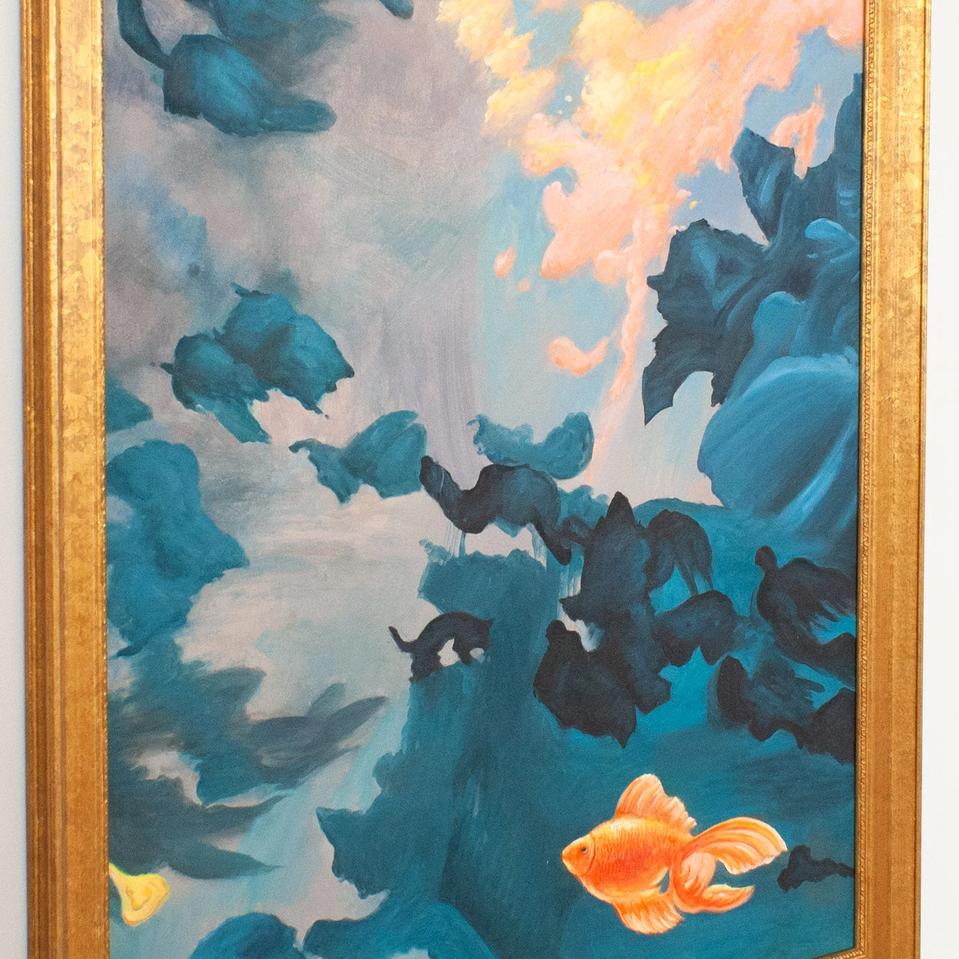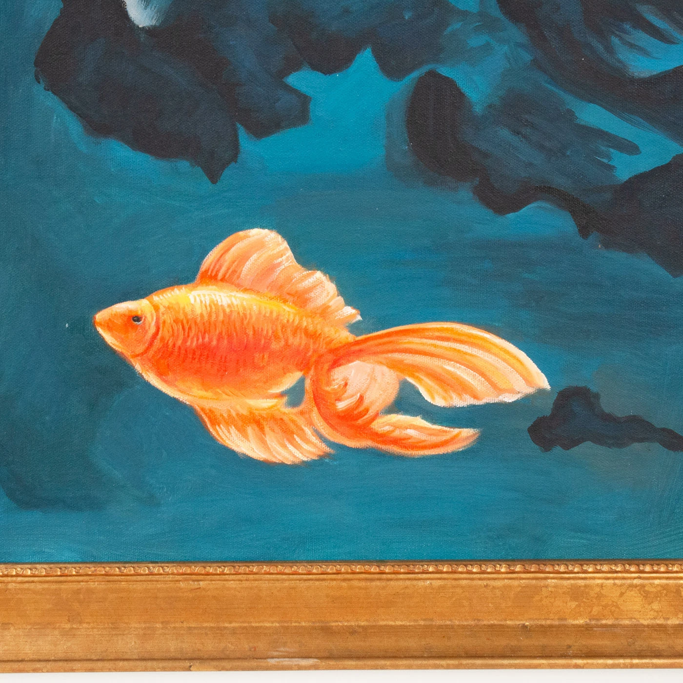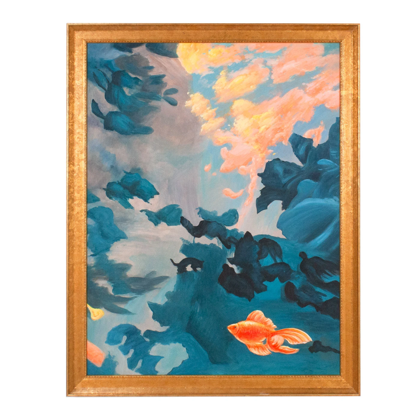 From the Tat Frederick studio, Golden Stormย is a giclee printย in a gold frame thatย depicts a goldfish swimming throughย the stormy sky.