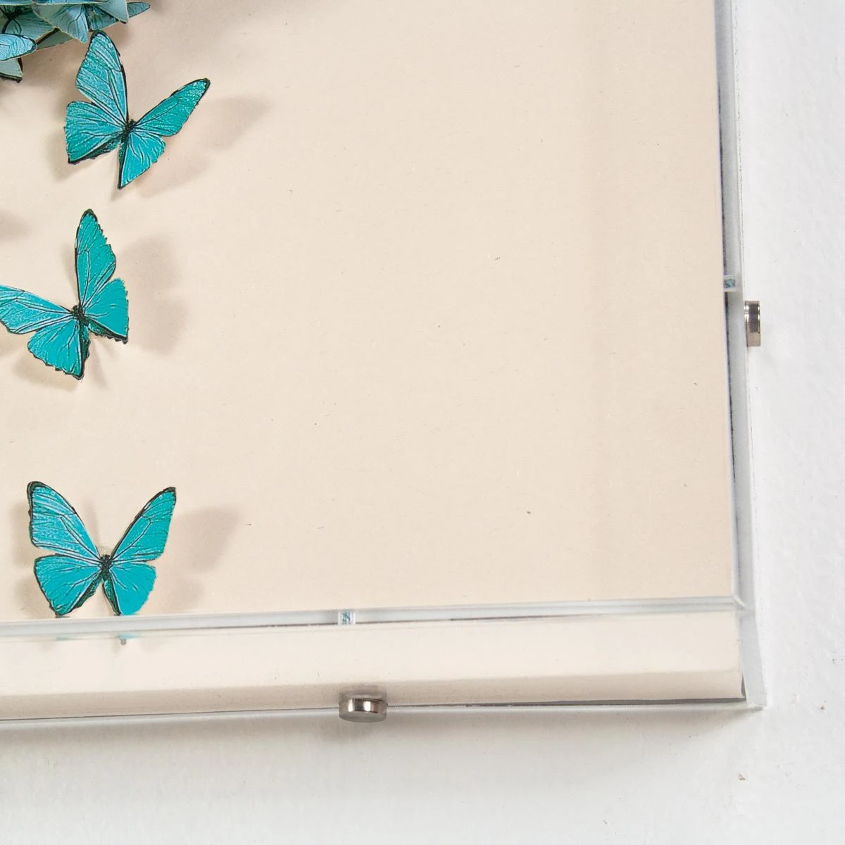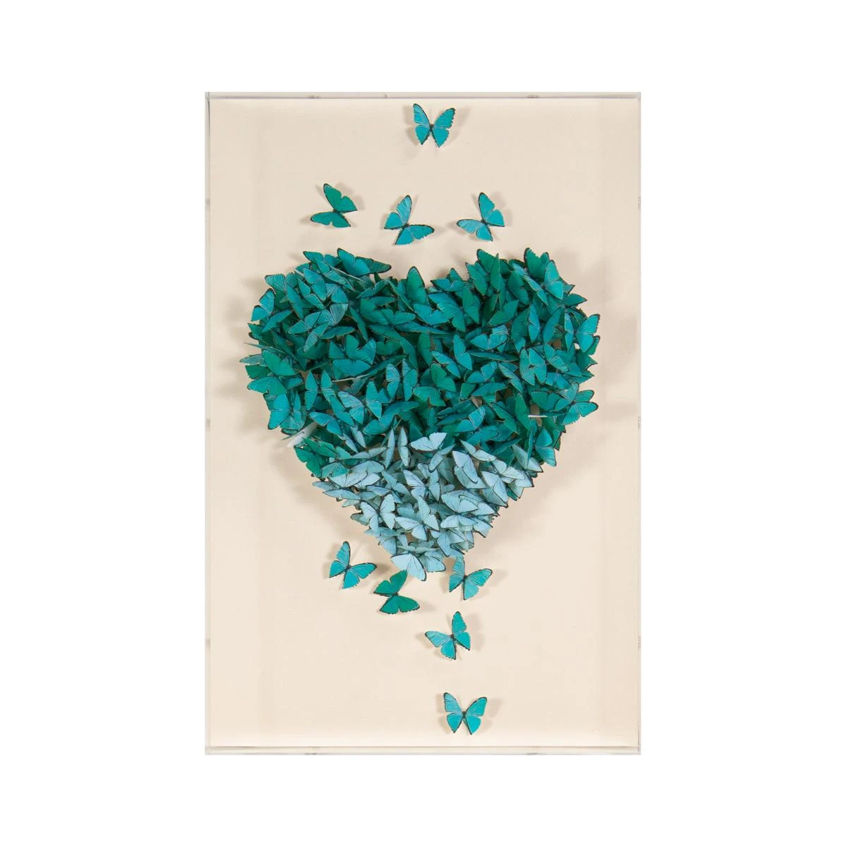 Hand-cut peacock green paper butterflies in the shape of a heart, framed in an acrylic shadowbox. Of the Jen Lin Series.ย