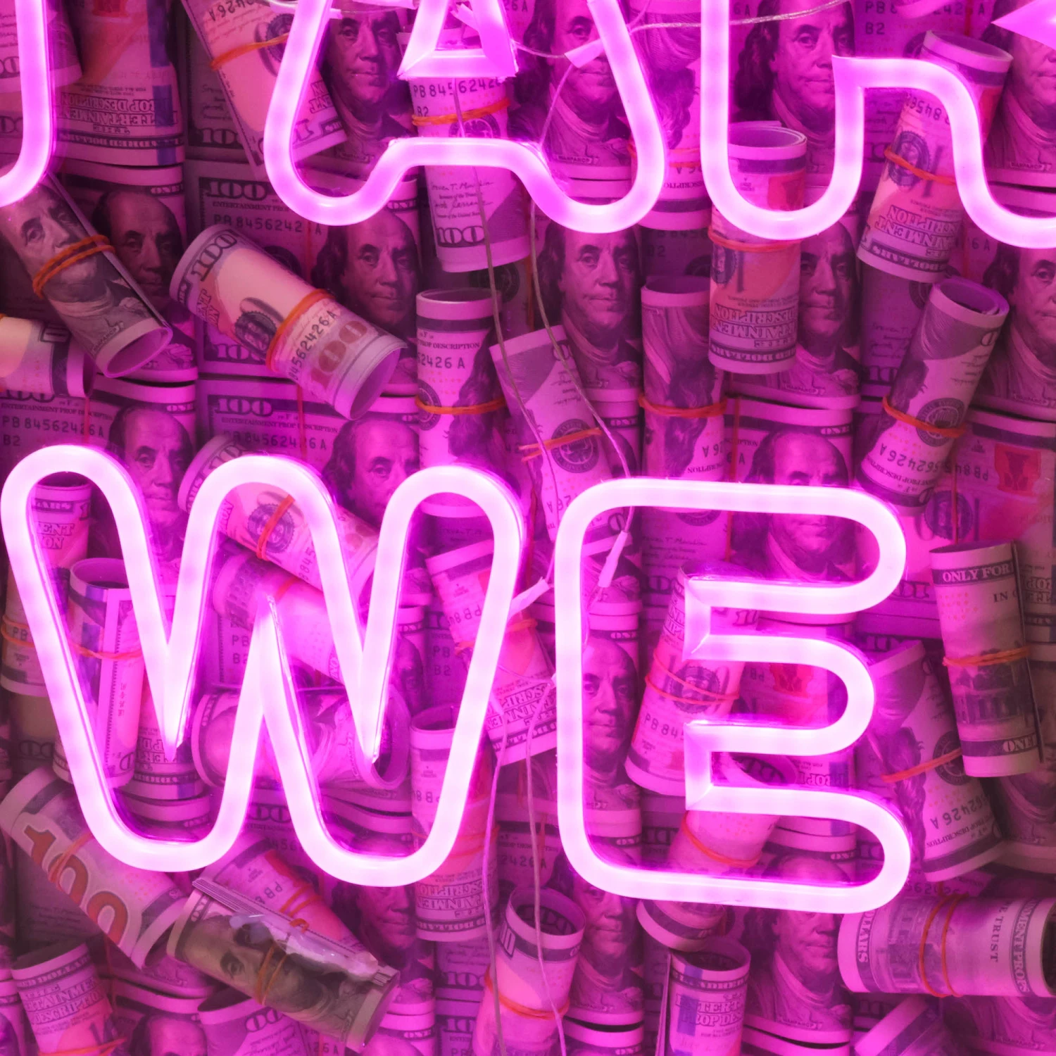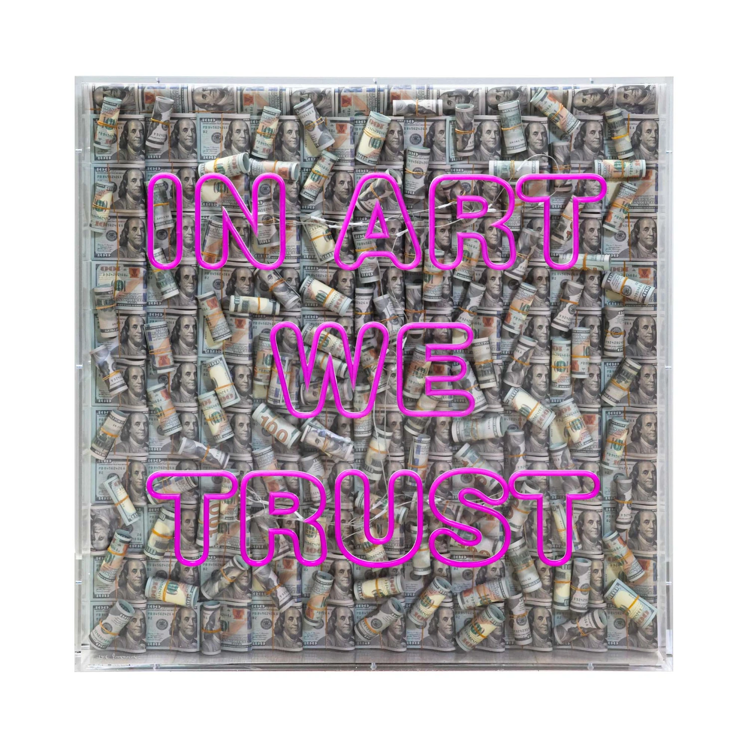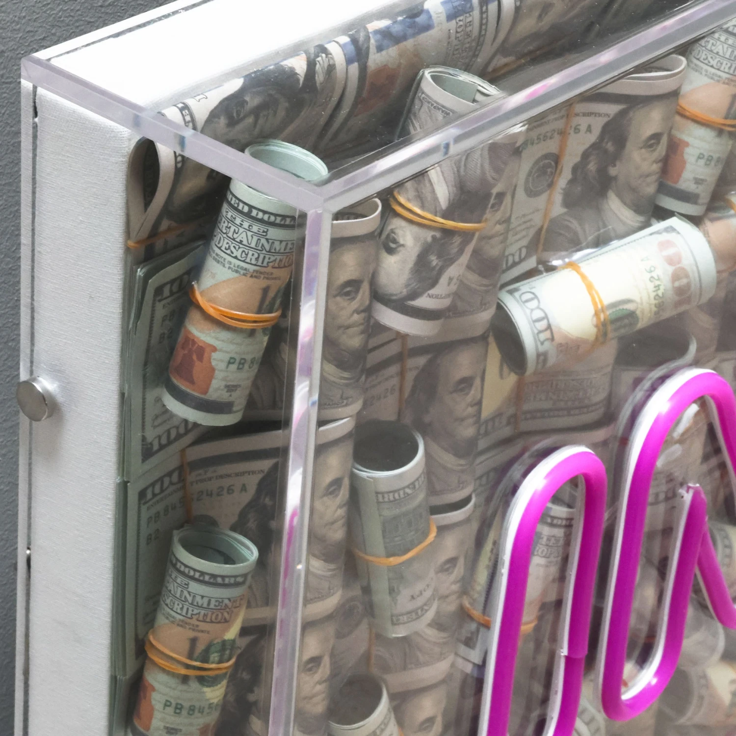 From the Tat Frederick studio,ย ‘In Art We Trust’ features money rolls and neon lights. Once eachย money roll is hand-placed, it is encasedย in an acrylic shadowbox with the neon lights applied toย the outsideย of the shadowbox.ย