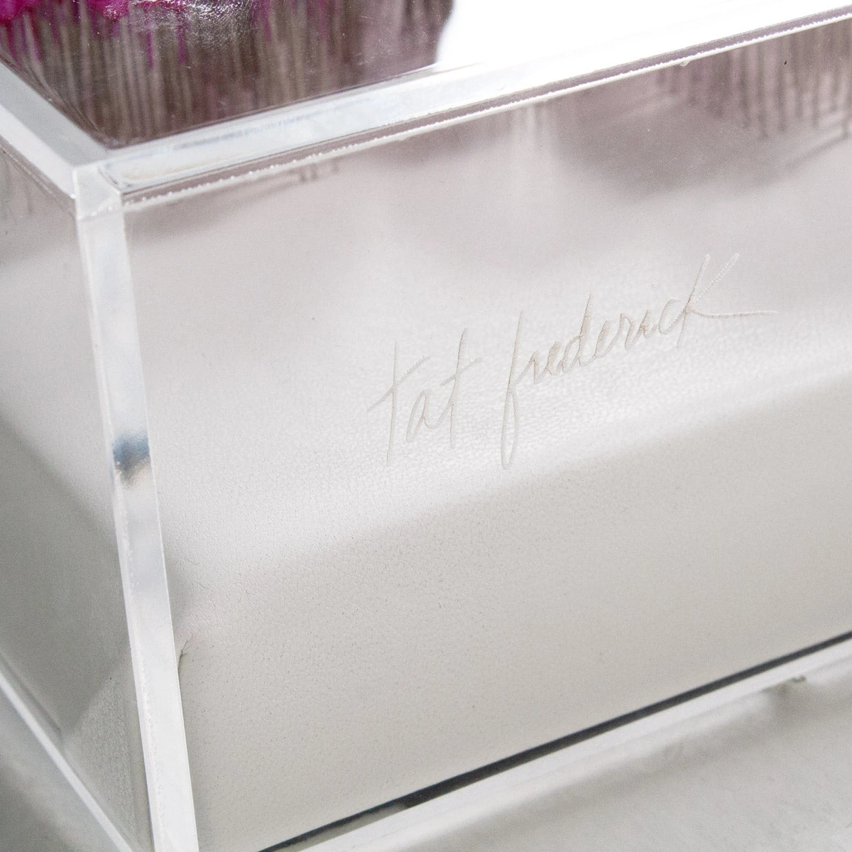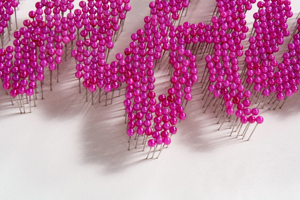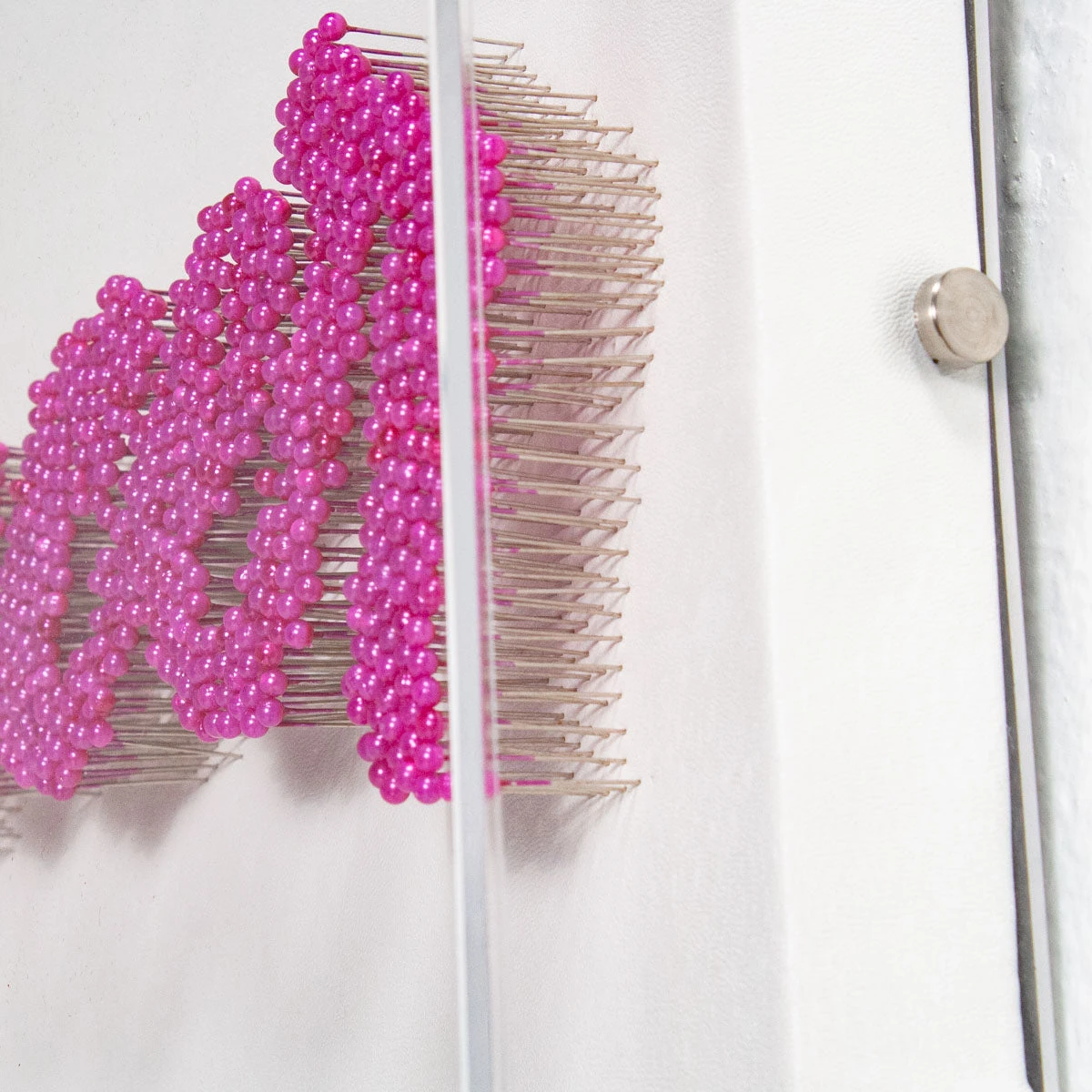 Mixed media artwork by Tat Frederick. “Influencer” made with individually placed pins on canvas, framed in an acrylic shadowbox.ย