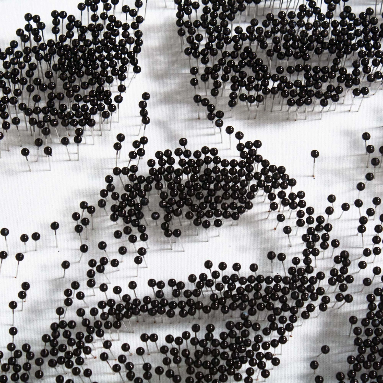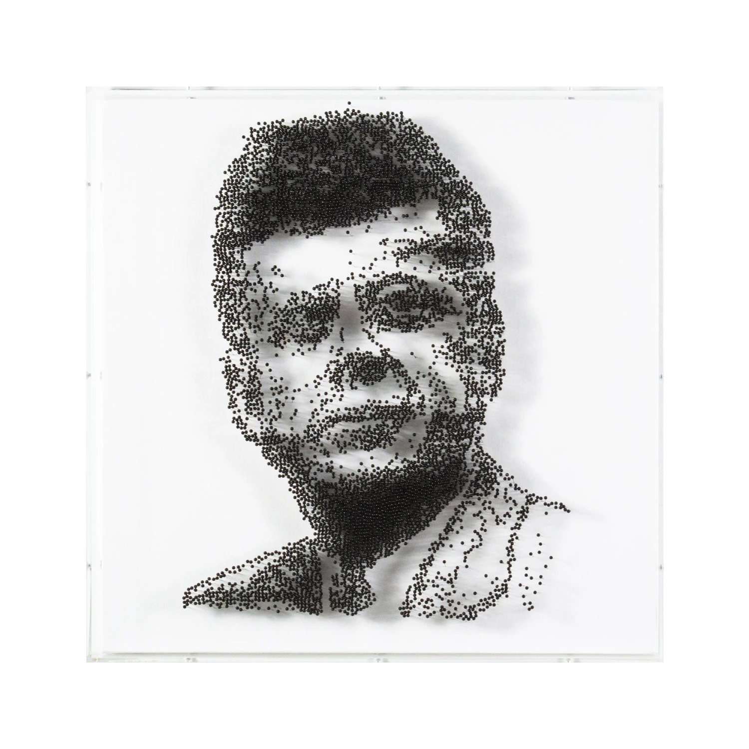 Hand placed black pins on white canvas shaped to form the face of John F. Kennedy. Framed in an acrylic shadowbox.