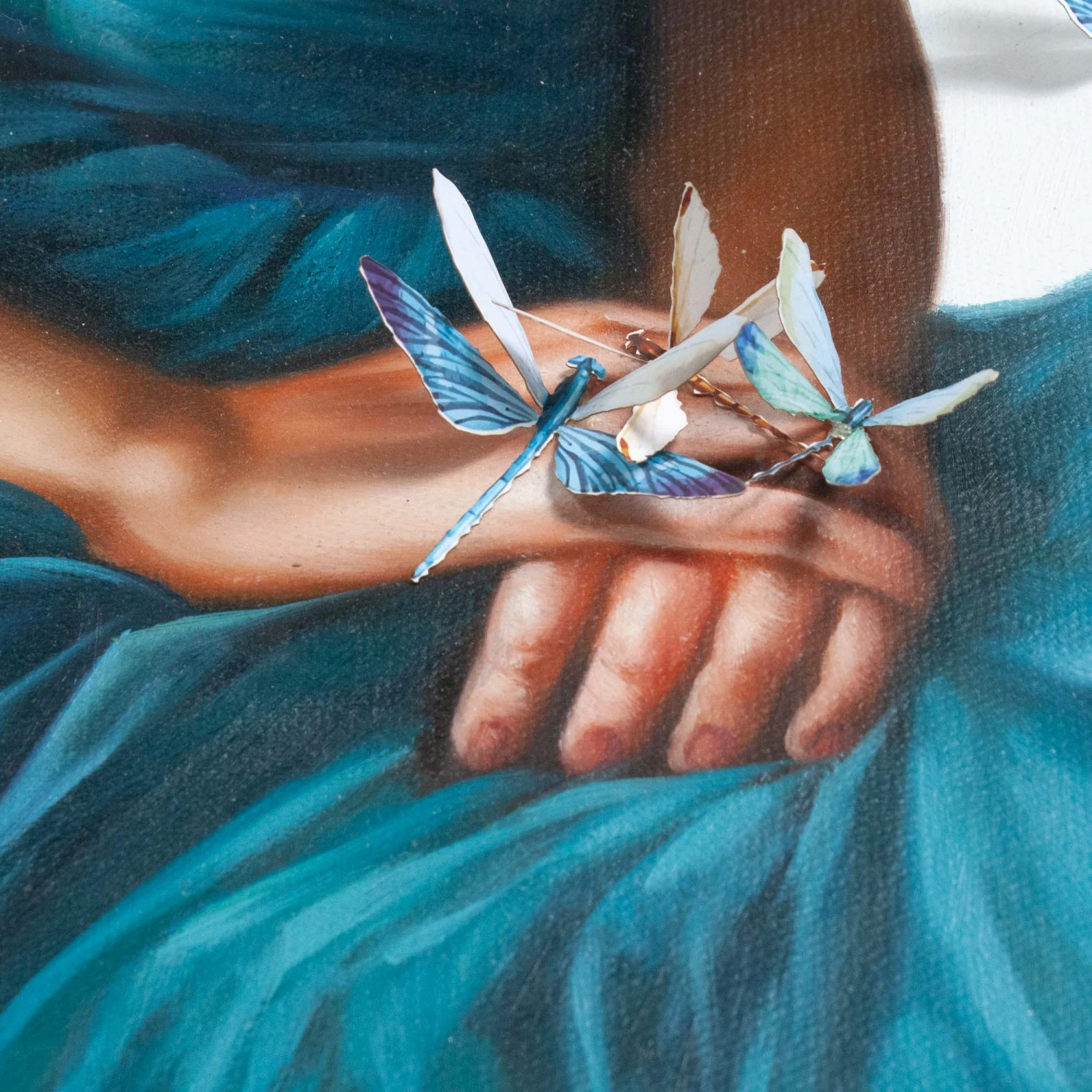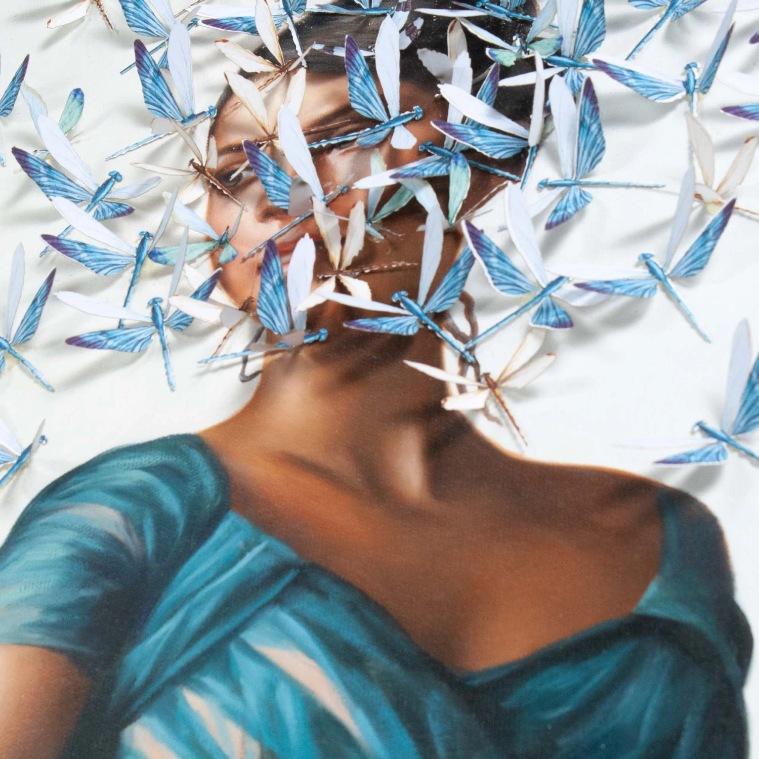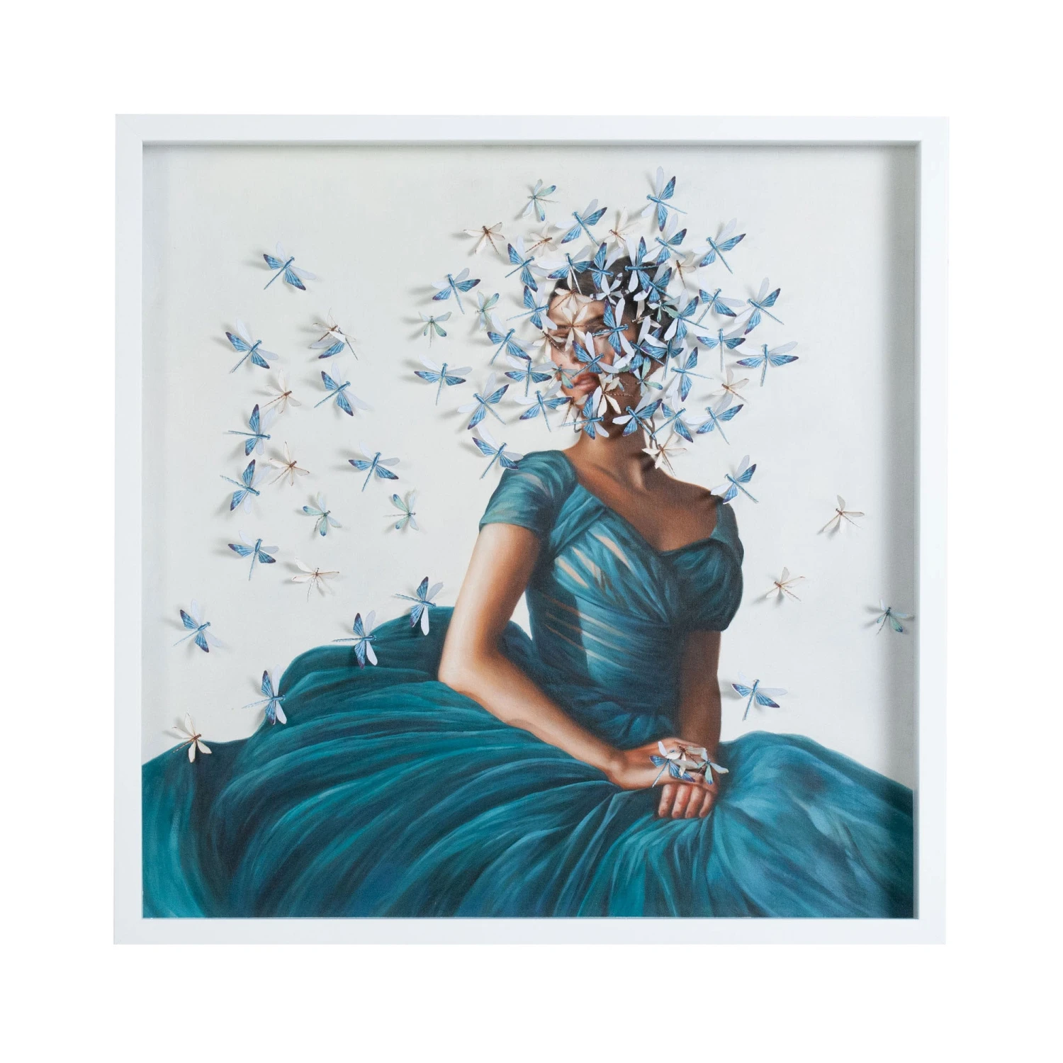 A modern-day blend of chiaroscuro and mixed media, Lady Kymley is printed on canvas with a swarm of dragonflies surrounding her.
