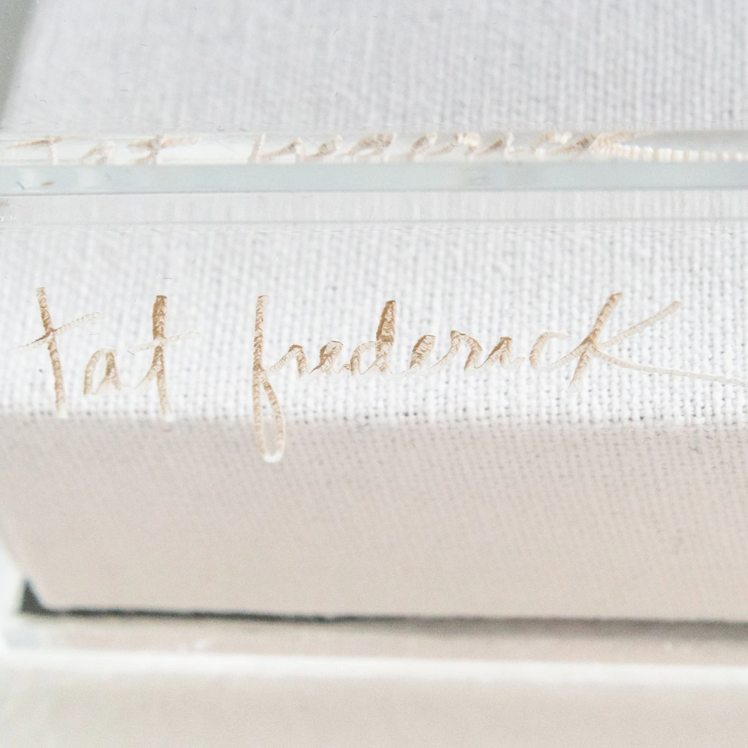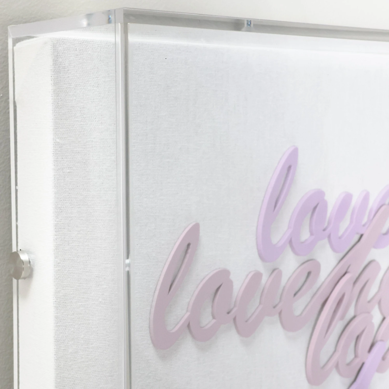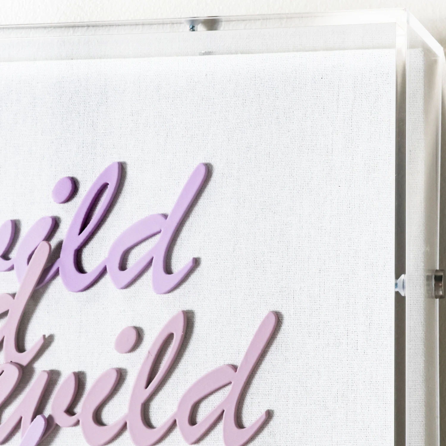 Hand cut words form the famous Atticus Poetry quote, “love her but leave her wild”. Arranged on white canvas and framed in an acrylic shadowbox.
