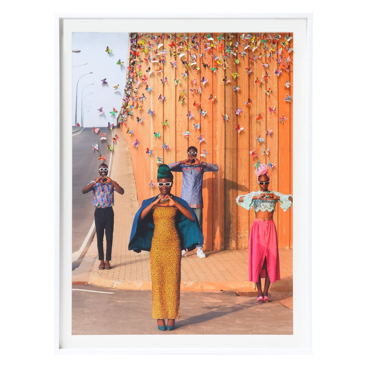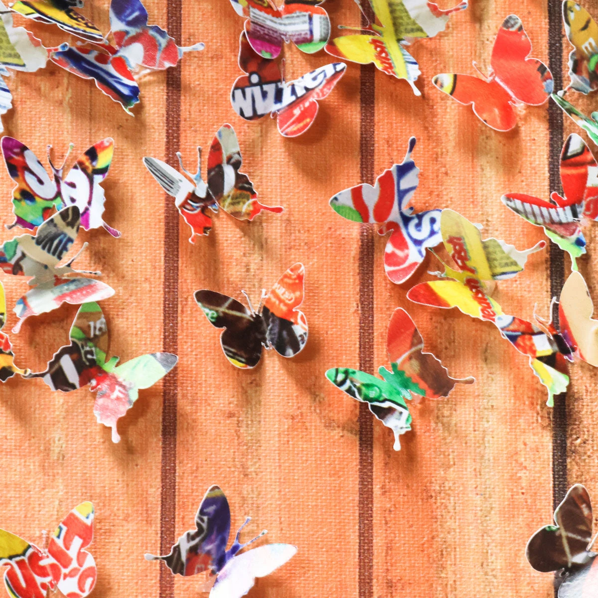 Love on the Fly featuresย printed candy butterflies that are hand-cut and individually pinned to canvas. Each piece is handmade and will have some variations in color and finish. Framed in white lacquered wood with a plexiglass panel.