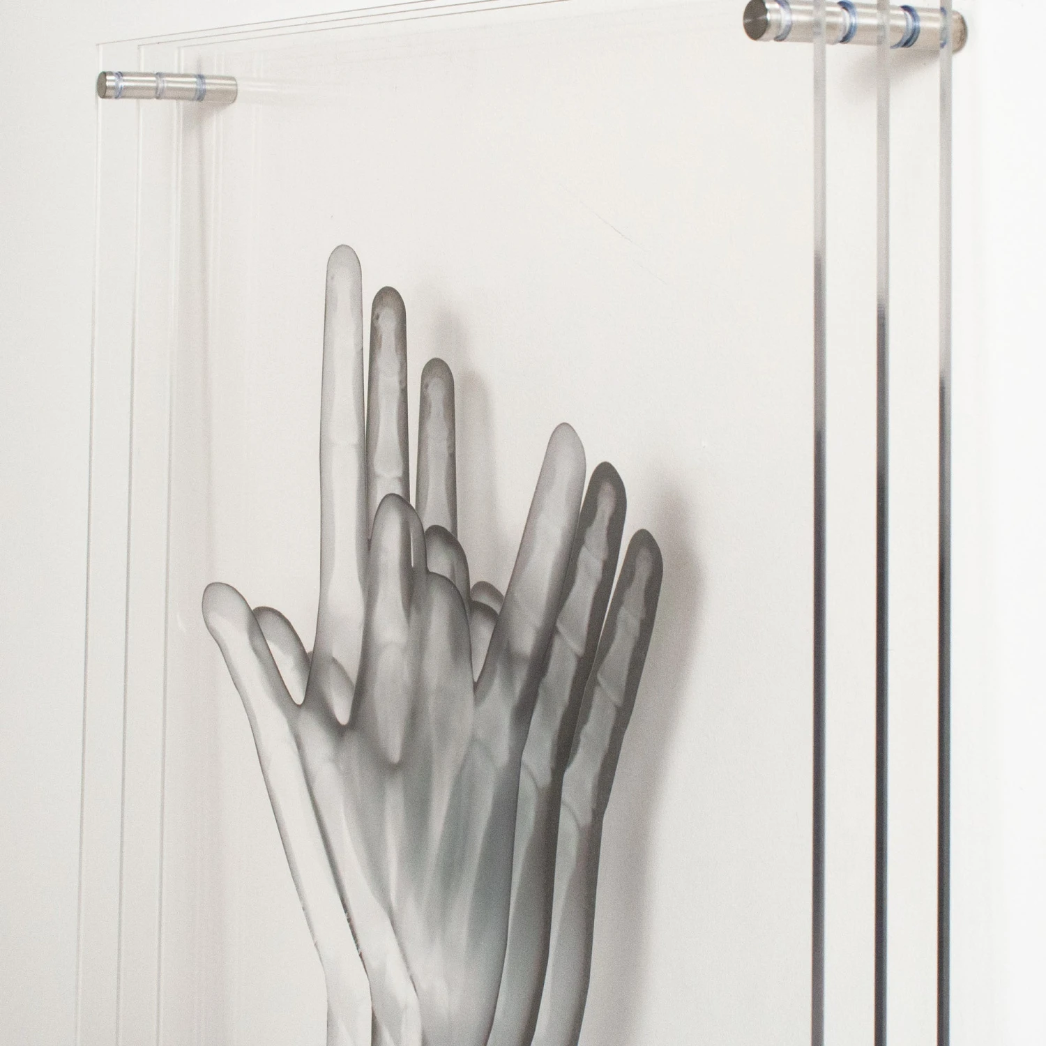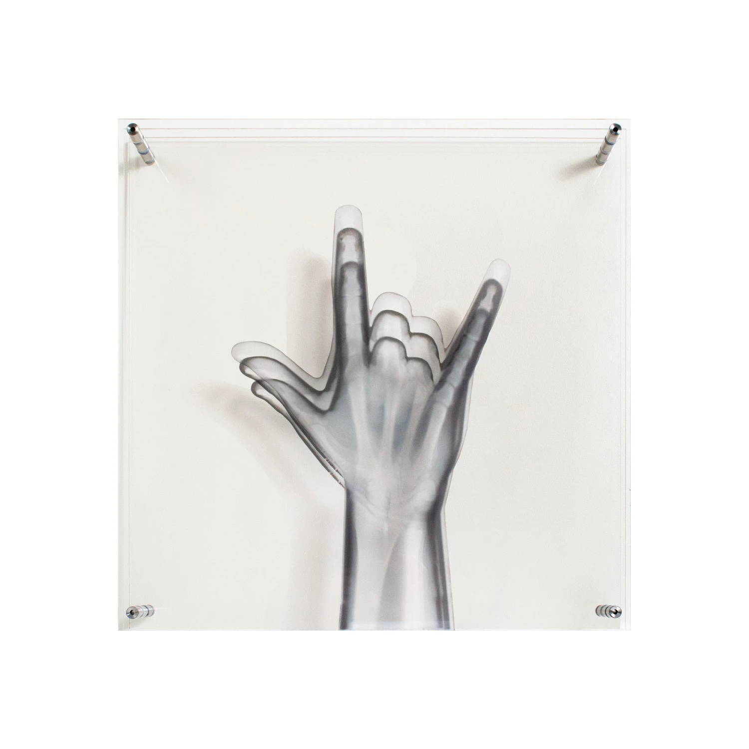 Featuring pieces of layered acrylic that depict an x-rayed hand rocking out, we love this personality piece.