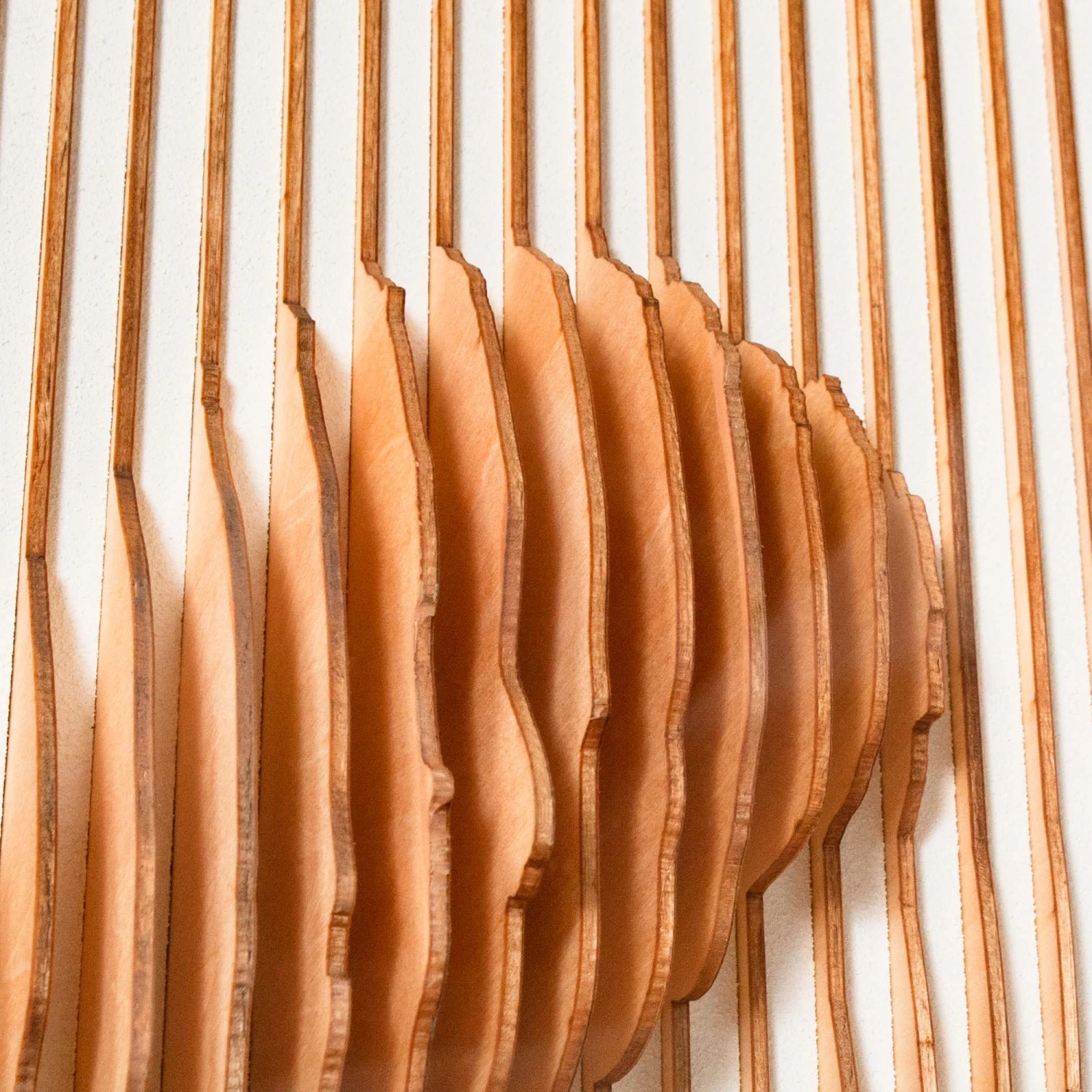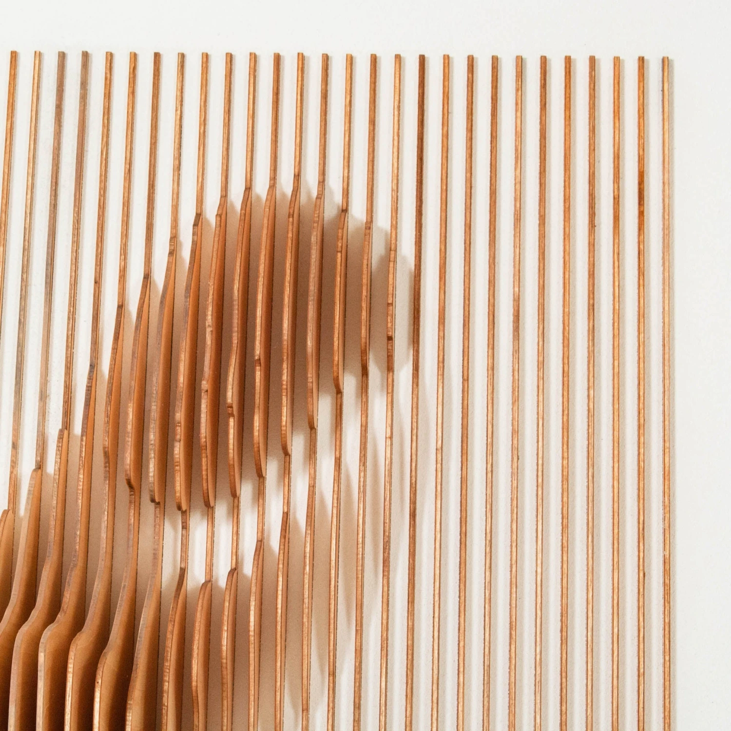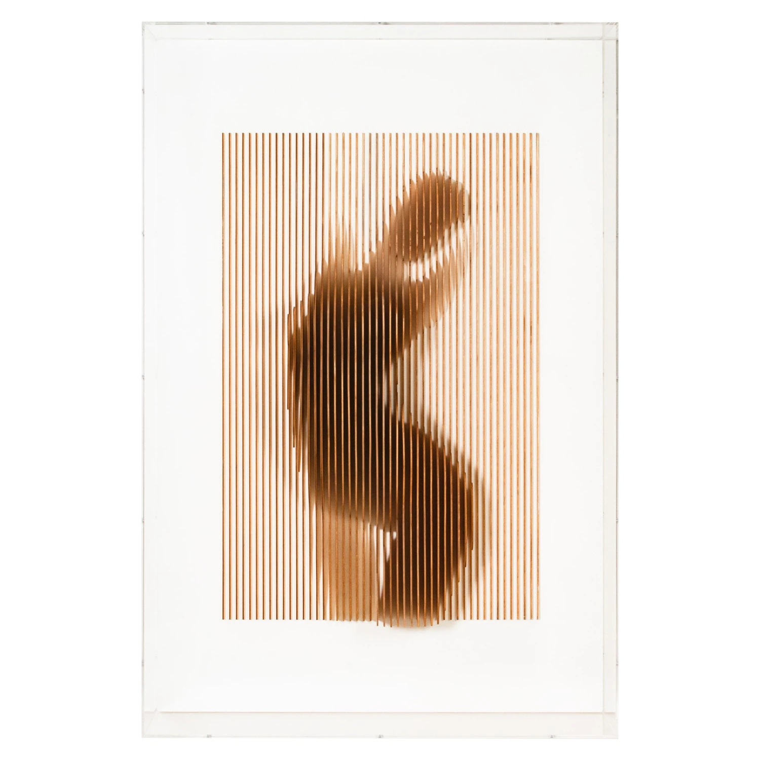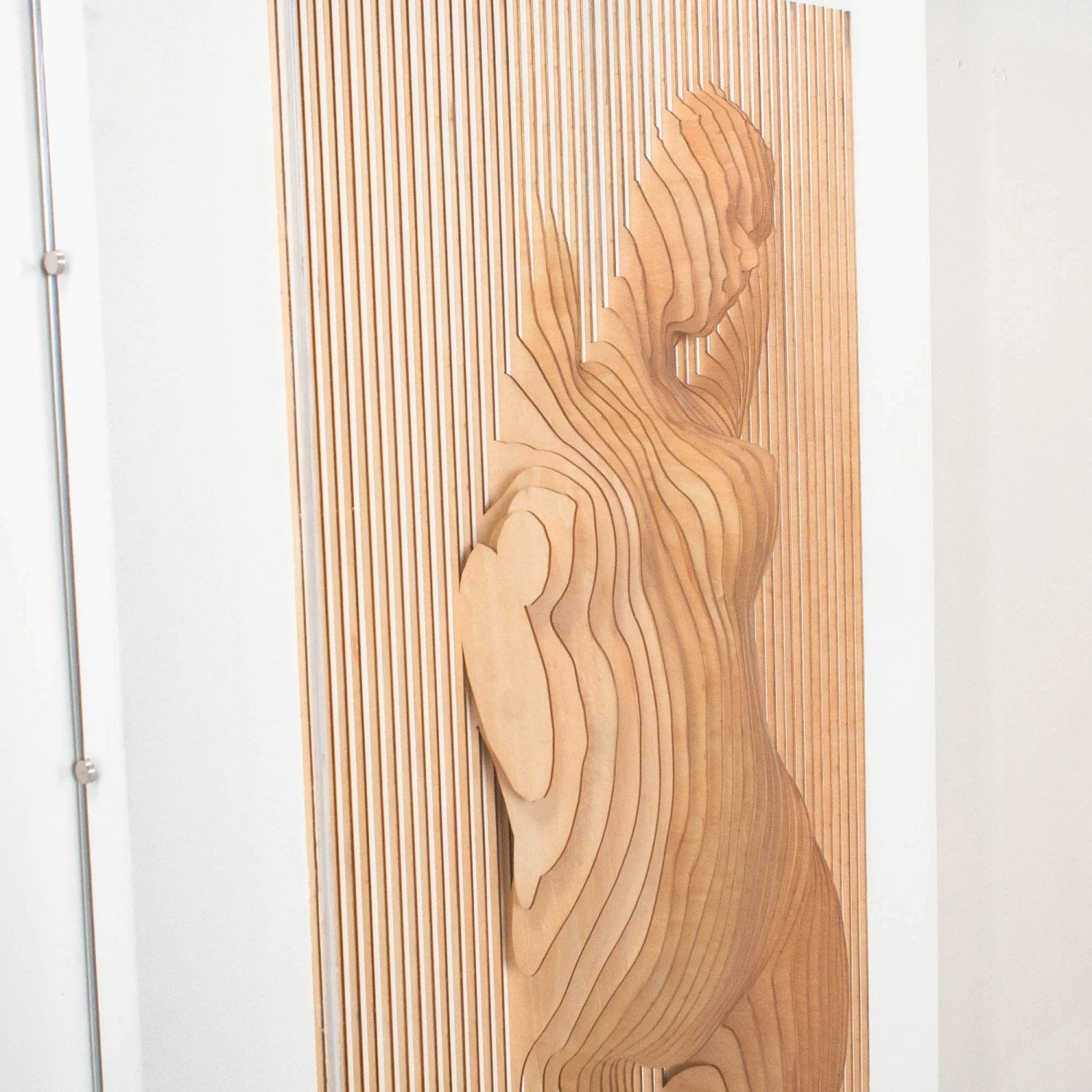 Mixed media artwork by Tat Frederick.ย Laser cut wood forms the body of a female with a stunning 3D effect.ย Mounted on white sandstone.