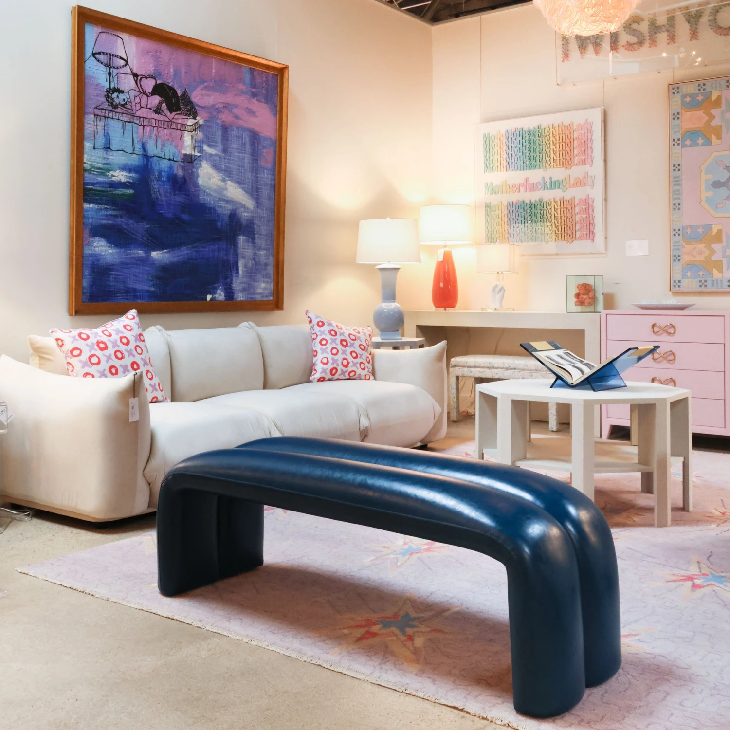 Maxwell is coming hot onto the scene with smooth curves, a double tuft, and blue vegan leather upholstery. Simple and streamlined, this versatile benchย lends itself to a myriad of styling opportunities.ย