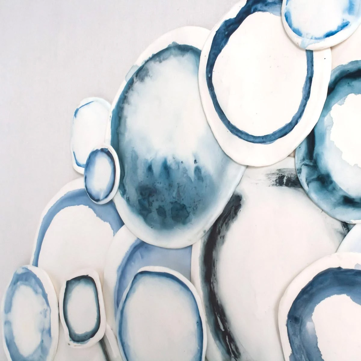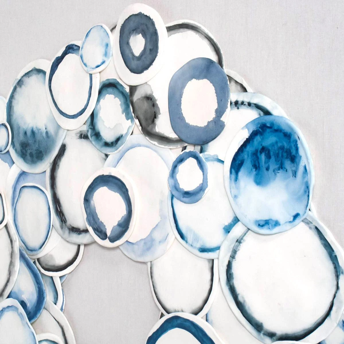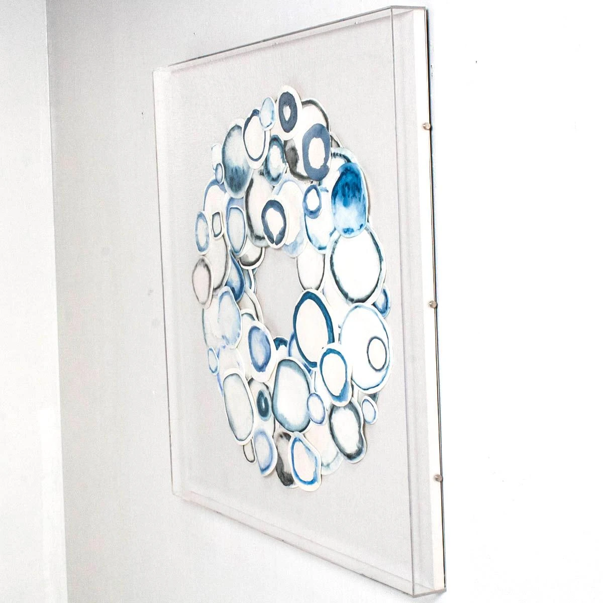 Merigold is made from circular clay that is hand sculpted and left in the sun to bake for 72 hours. When hardened, each piece is hand painted using a variety of paint washes and then finally arranged in a uniform pattern under an acrylic box.ย