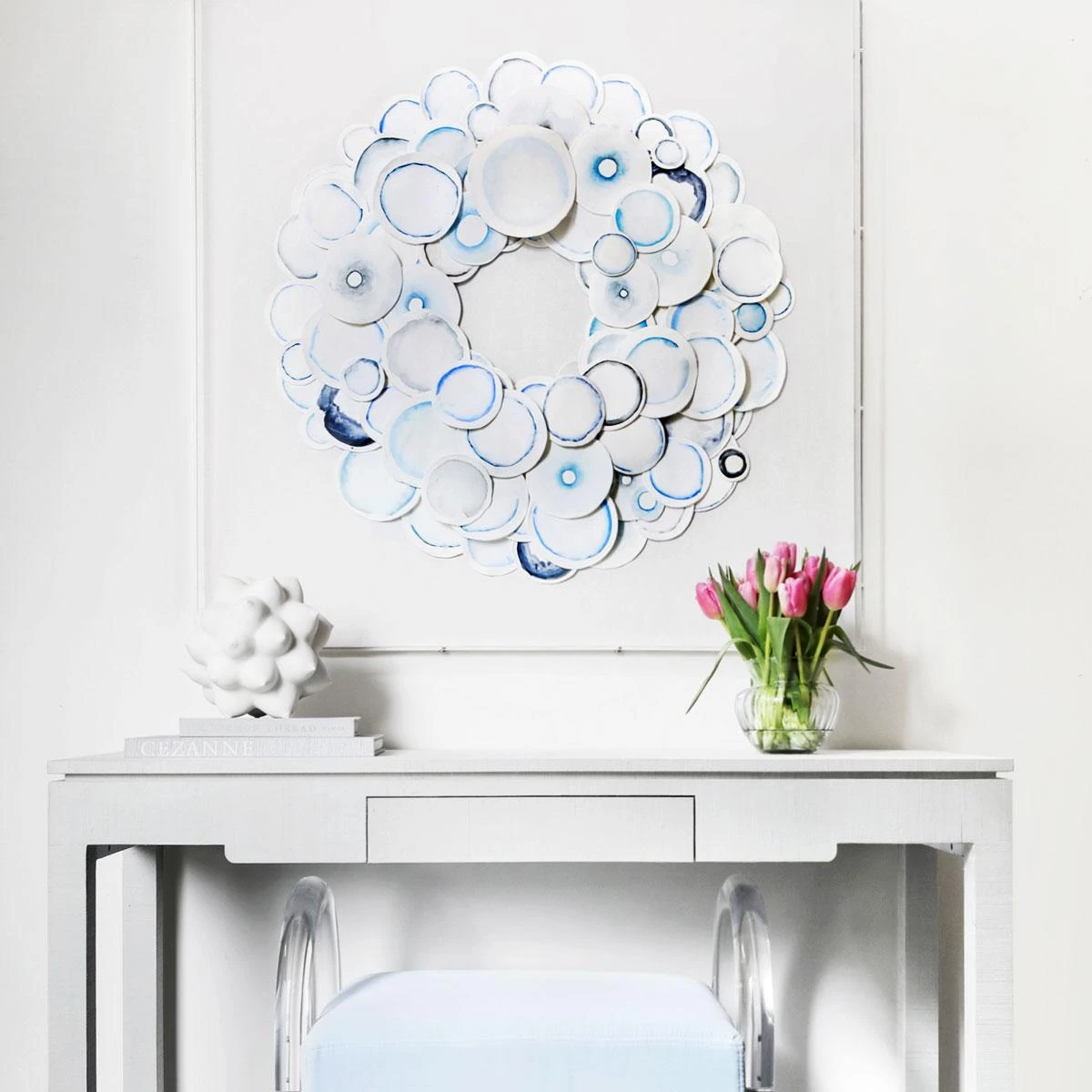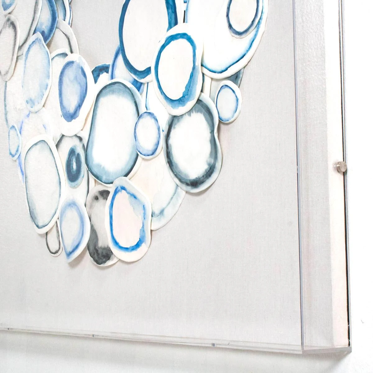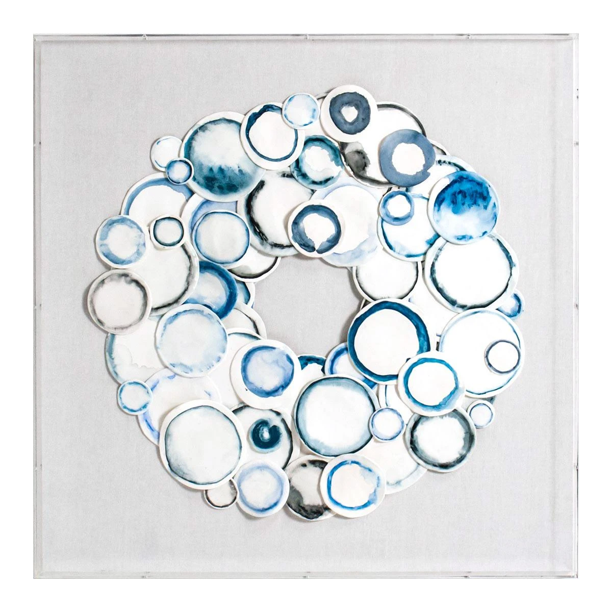 Merigold is made from circular clay that is hand sculpted and left in the sun to bake for 72 hours. When hardened, each piece is hand painted using a variety of paint washes and then finally arranged in a uniform pattern under an acrylic box.ย