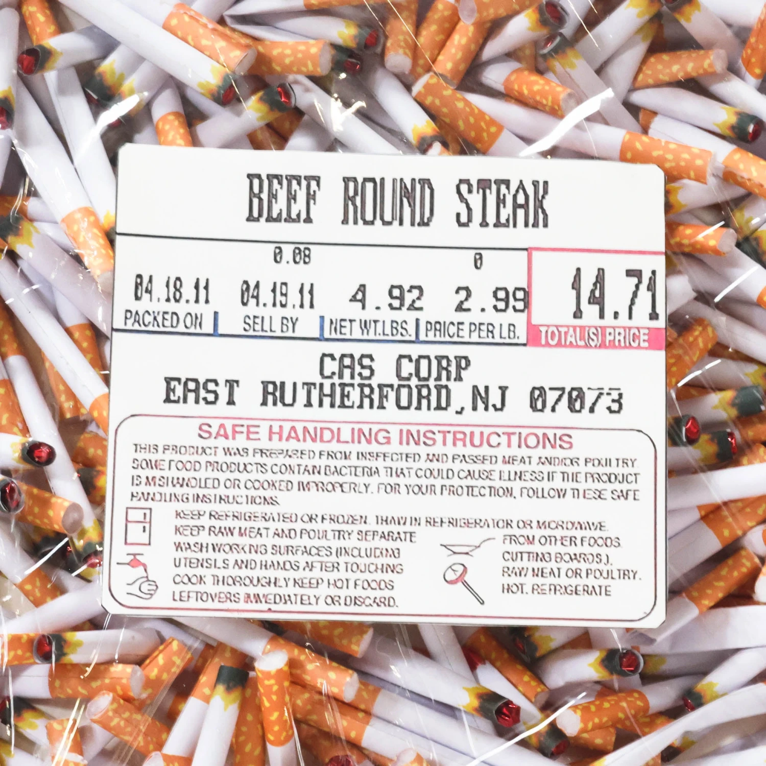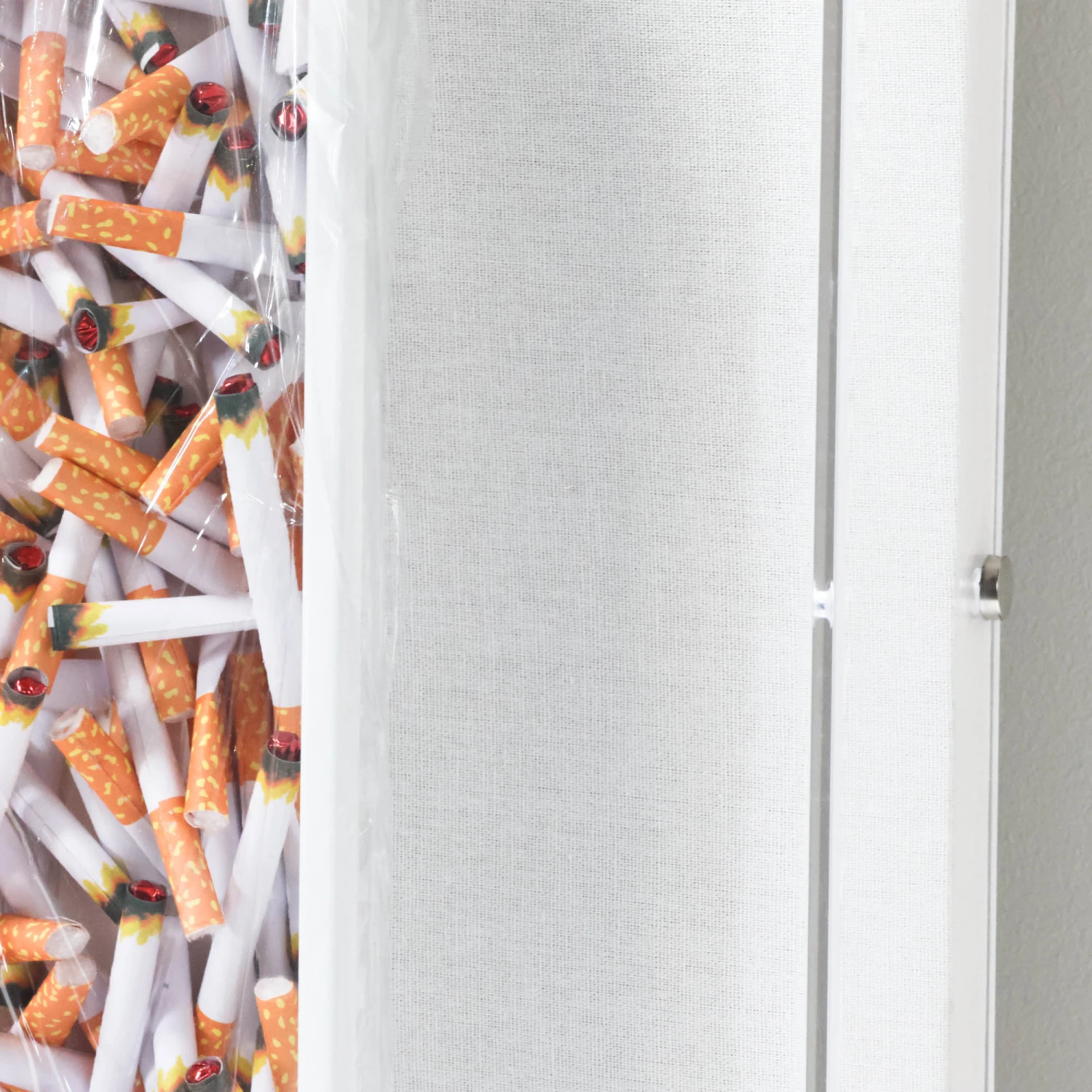 New from the Tat Frederick studio, P Funk features faux cigarettes hand-crafted from paper that have been individuallyΒ placed into a faux deli container. A steak sticker, metallic cigarette tips and plastic wrap are the finishing details before everything is fixed to canvas and framed in a shadowbox.Β