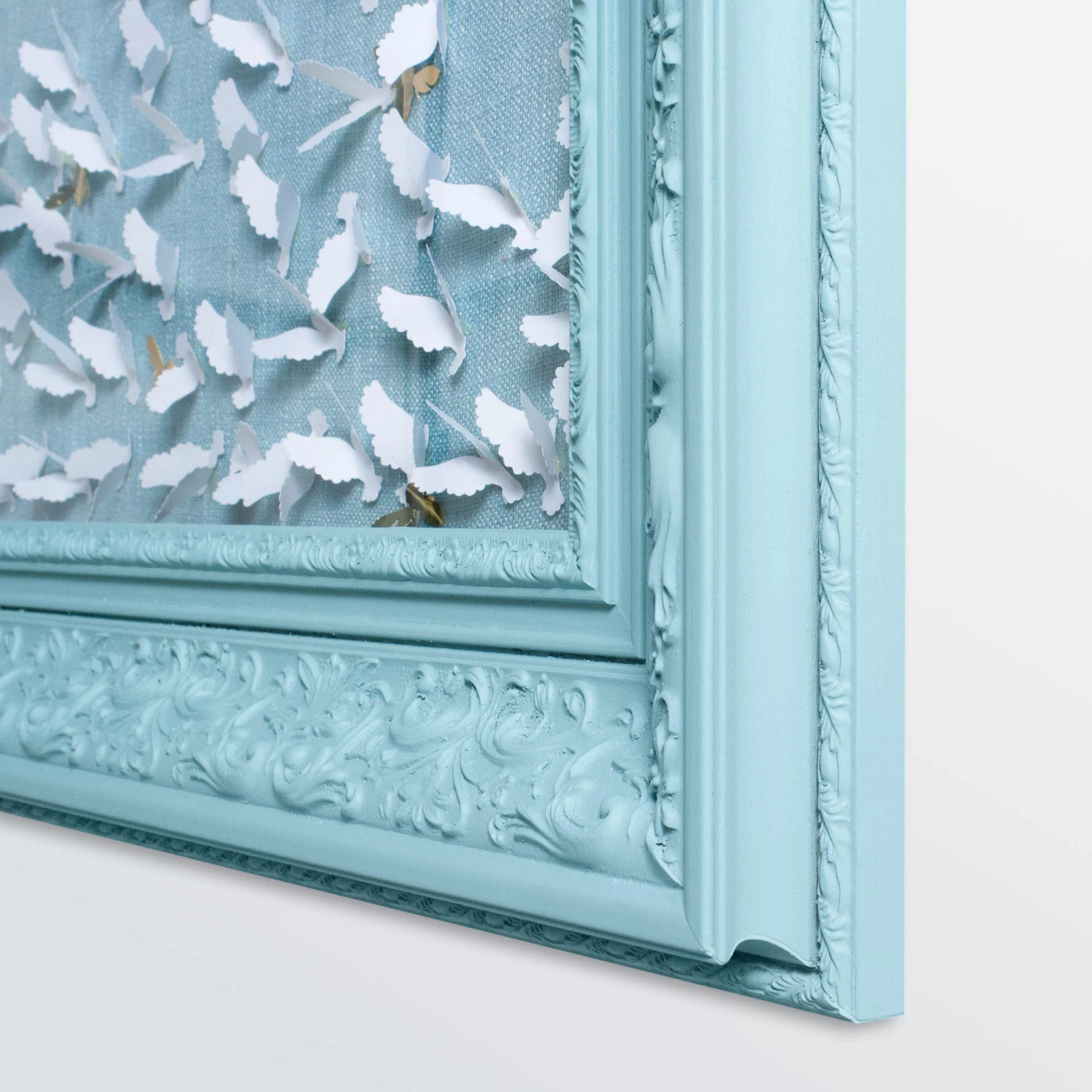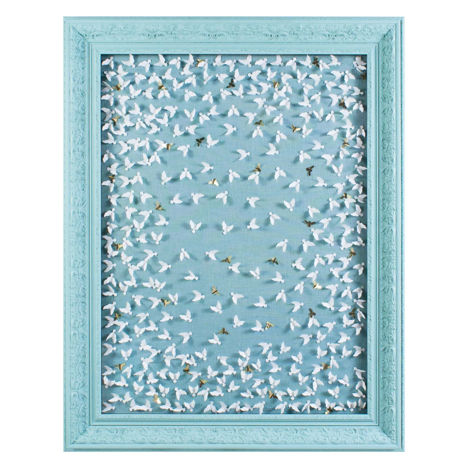 In Jen Lin fashion, this piece will give you all the flutters. Hand cut paper birds and gold bees commingle on teal blue canvas. An ornate painted teal frame sets off the look.