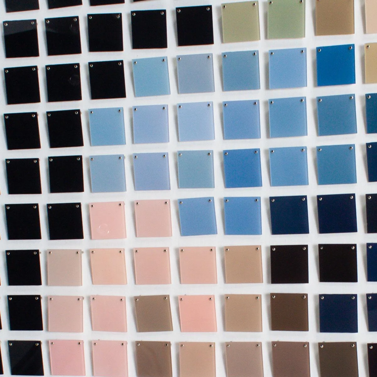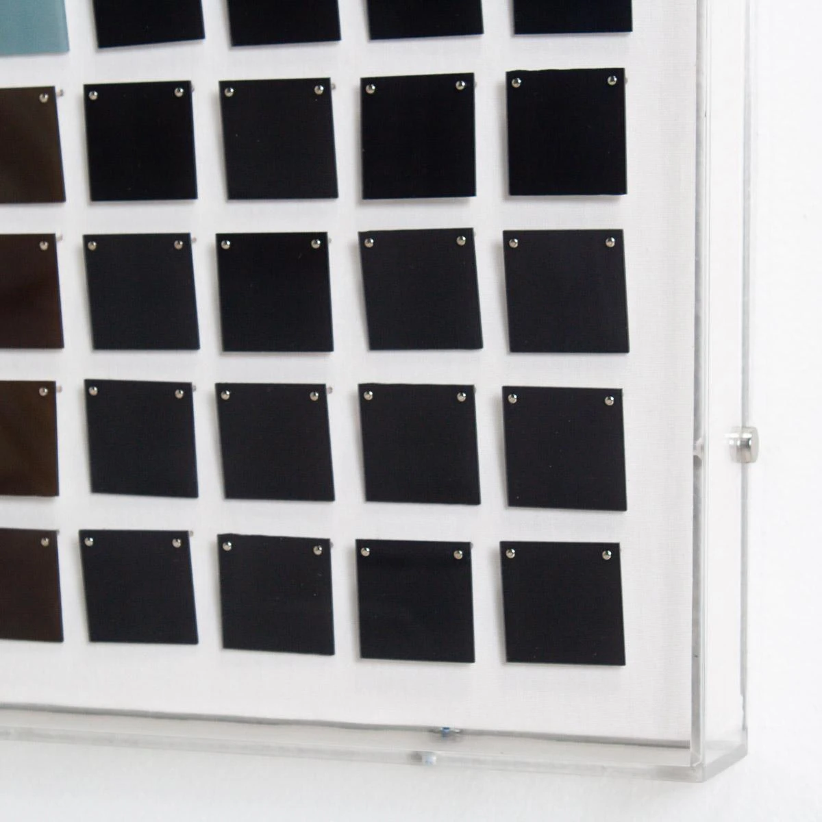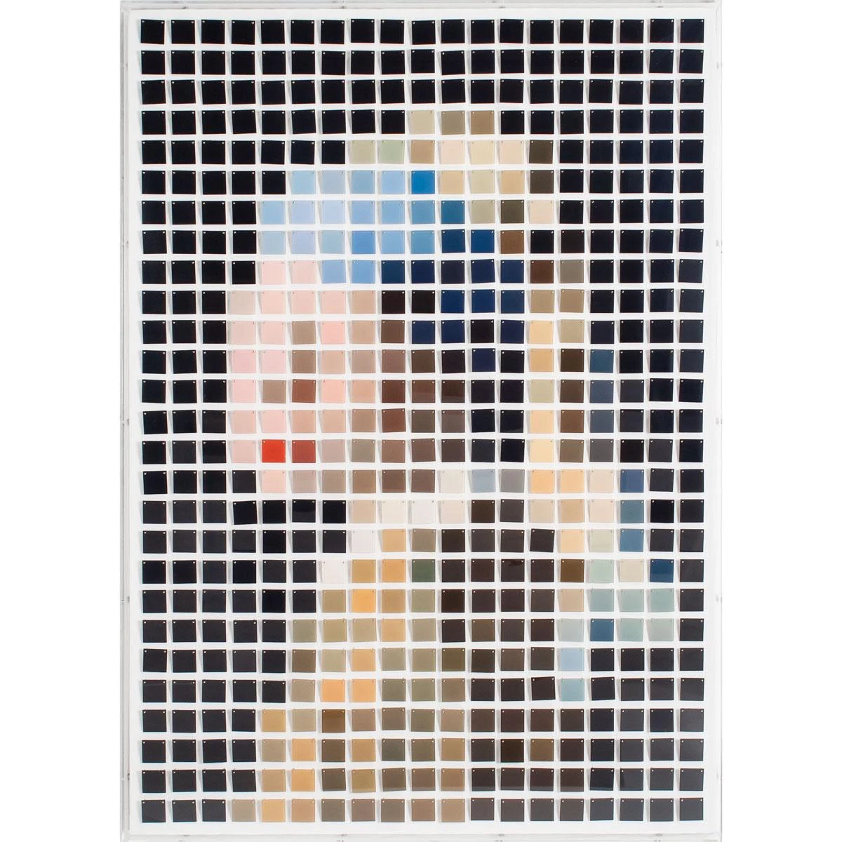 Mixed media artwork by Tat Frederick. Girl with a Pearl Earring portrait made with colored acrylic squares, framed in an acrylic shadowbox.