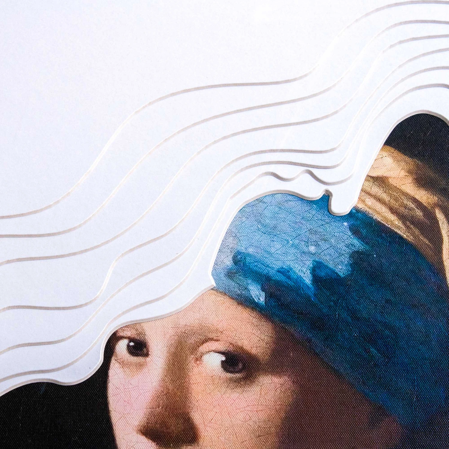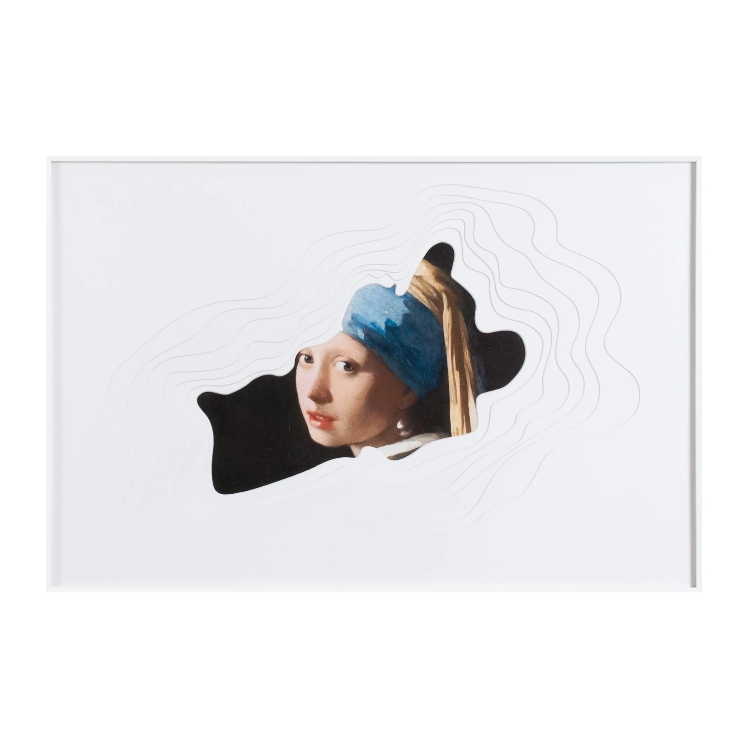 Girl with a Pearl. ‘Pearl’ย print isย peeking through aย ripple-like design of white matts. Framed in white.