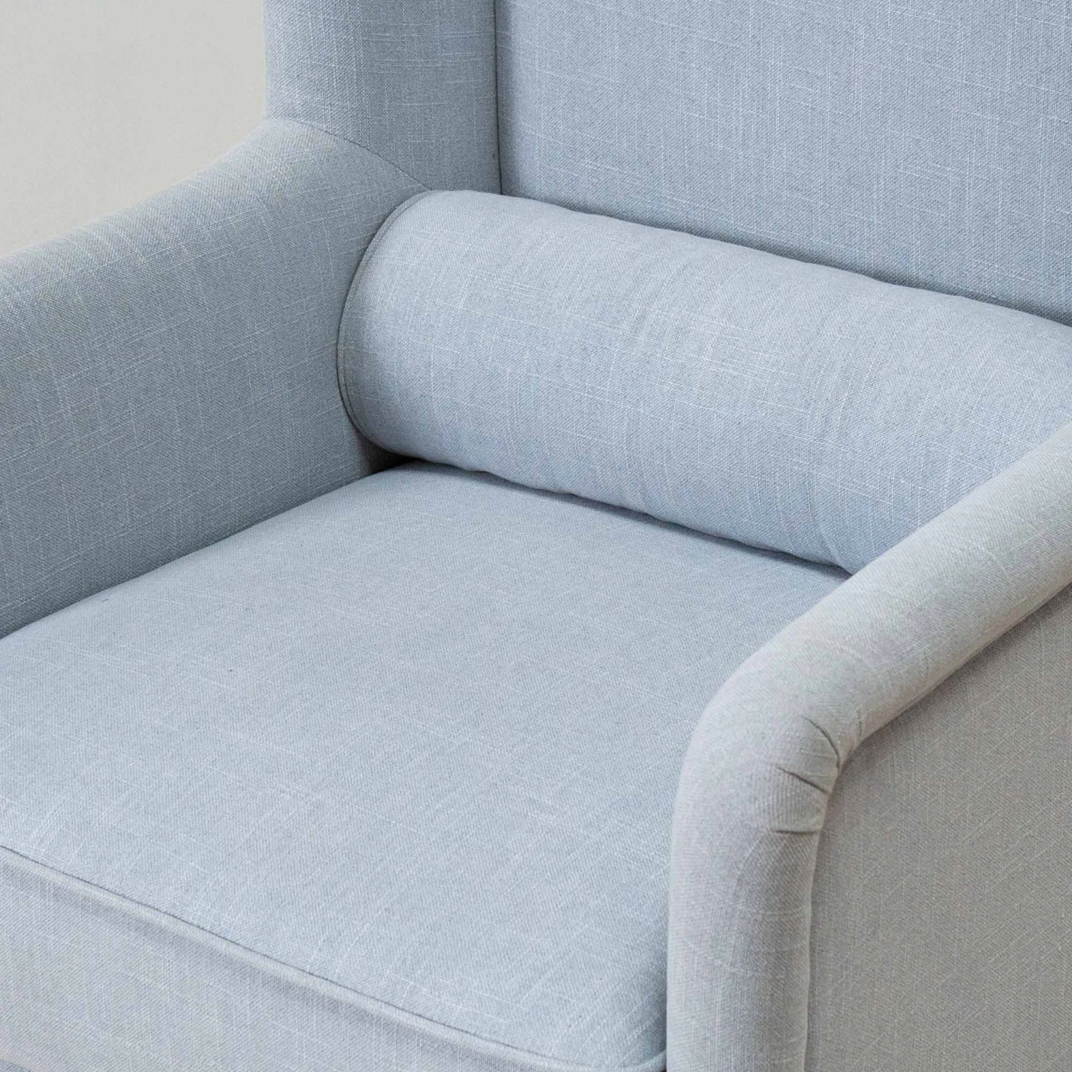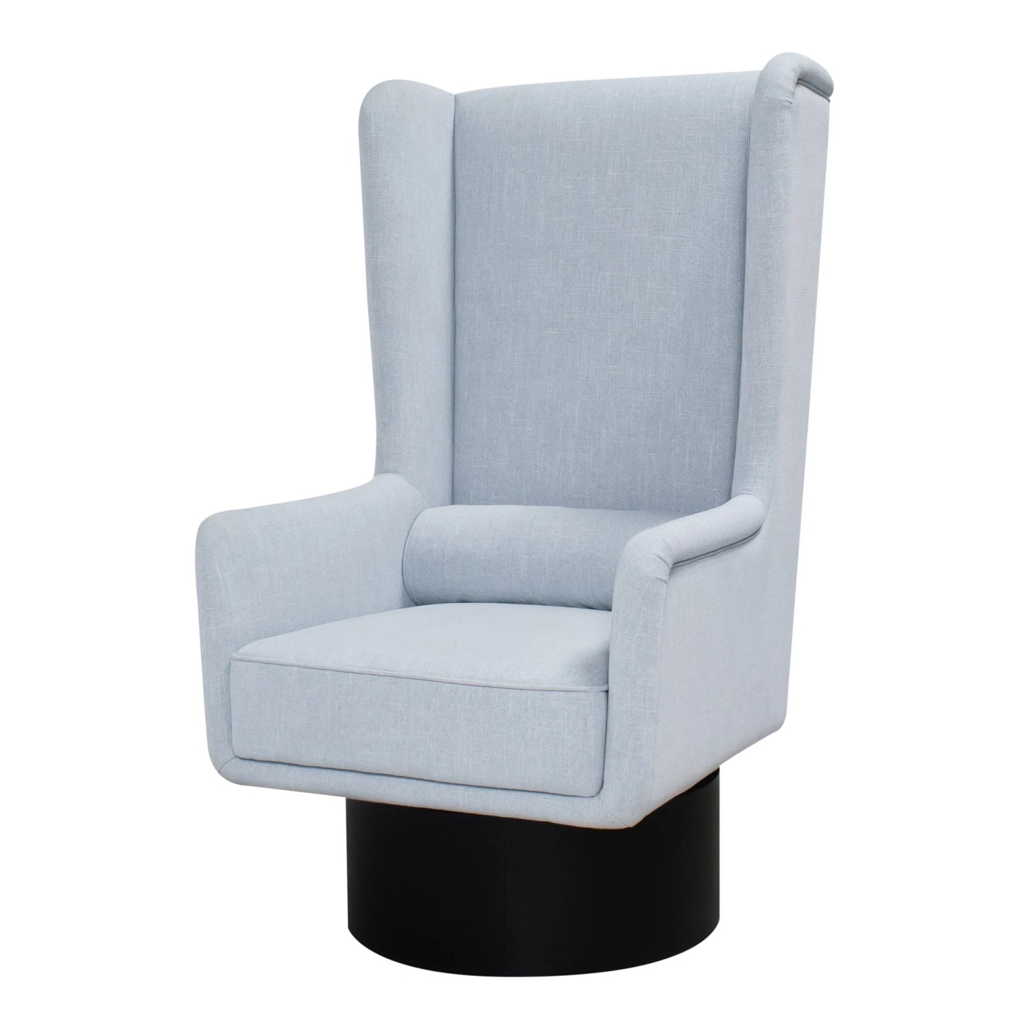 Our Percy Swivel Chairย features a tall wingback design with a black swivel base.ย Light blue linen softens the look for the modern home.ย