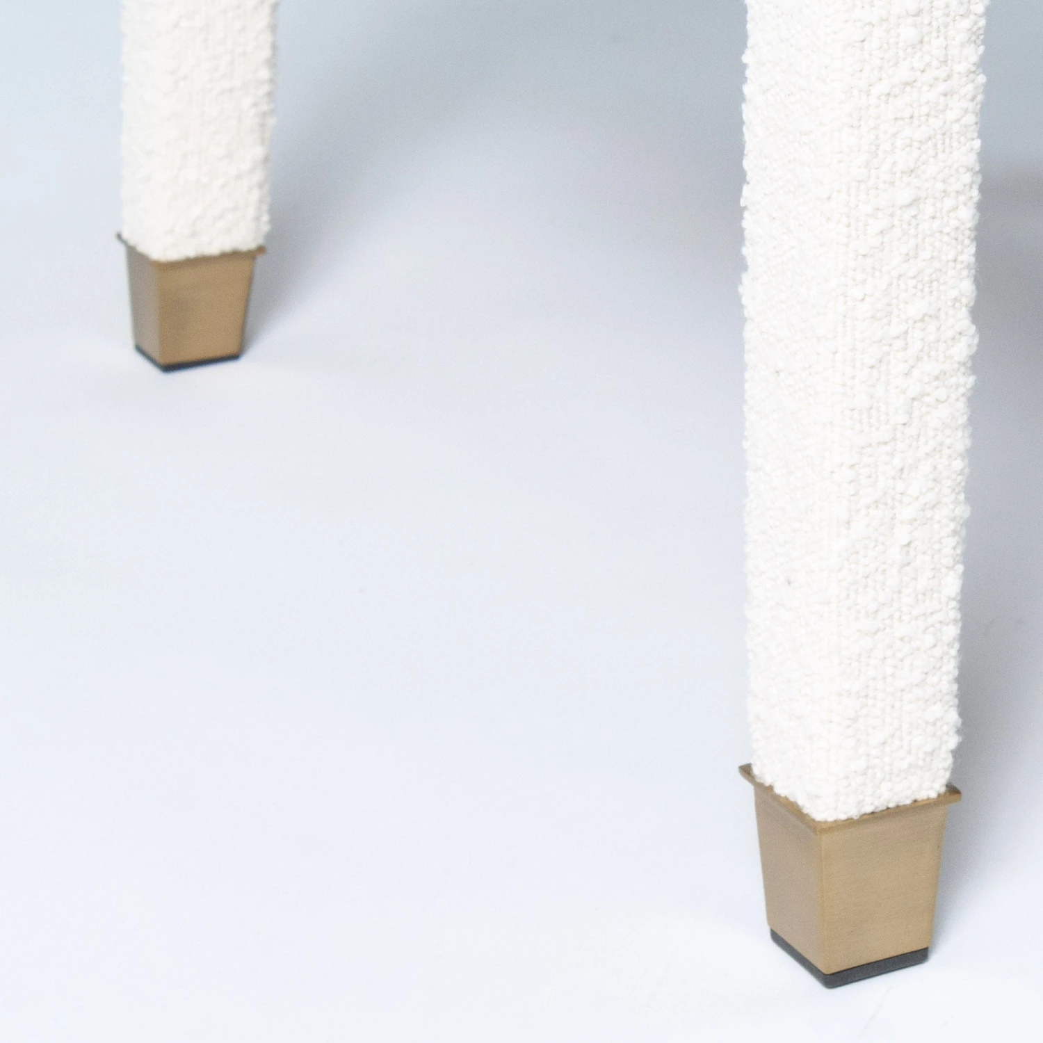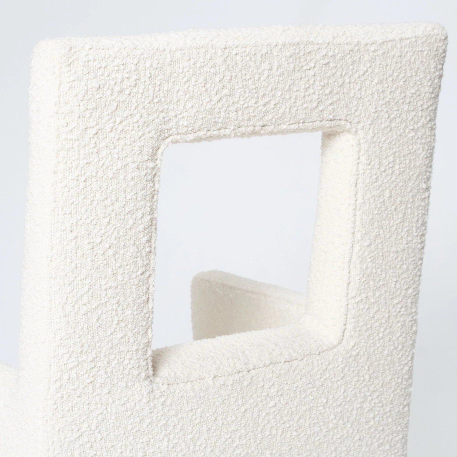 The Perry Dining Armchair features a squaredย frame and cut out detail. Ivory boucle gives this seat a comfy, cozy feel despite its angular look.ย