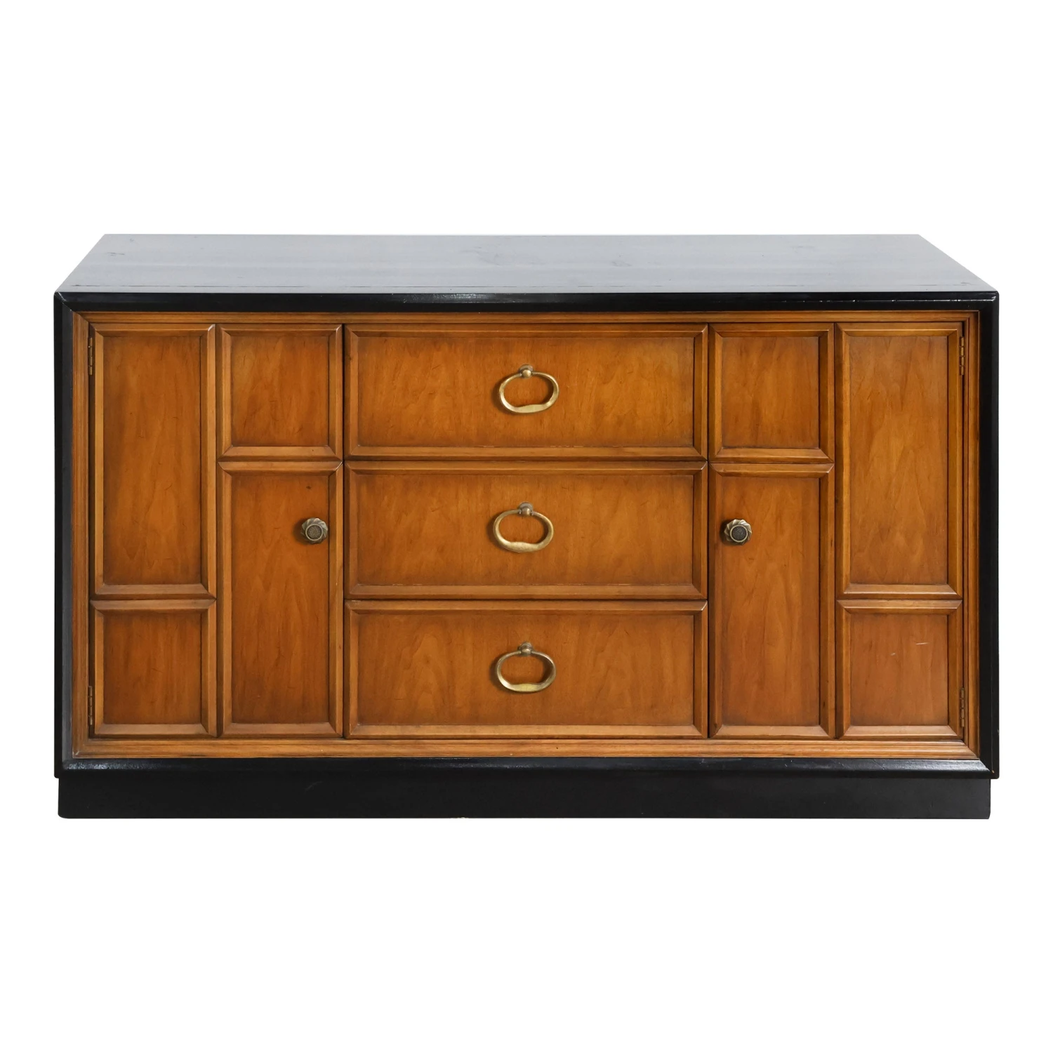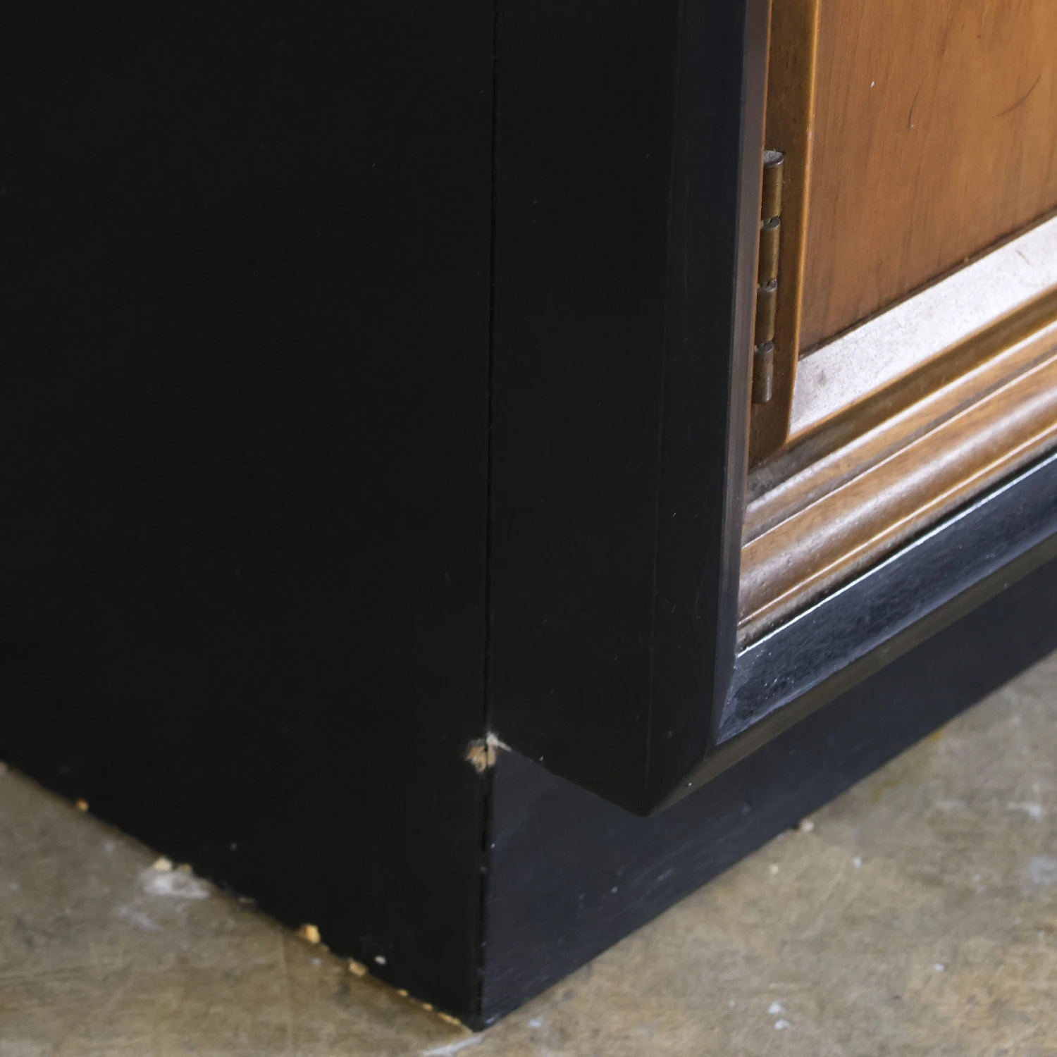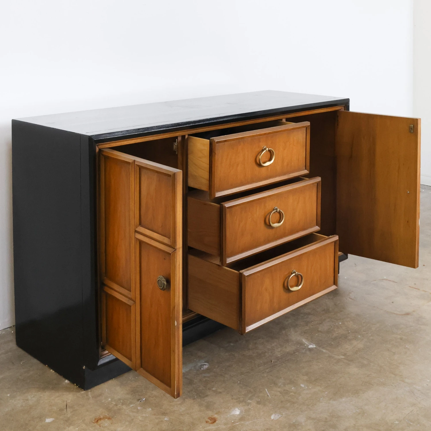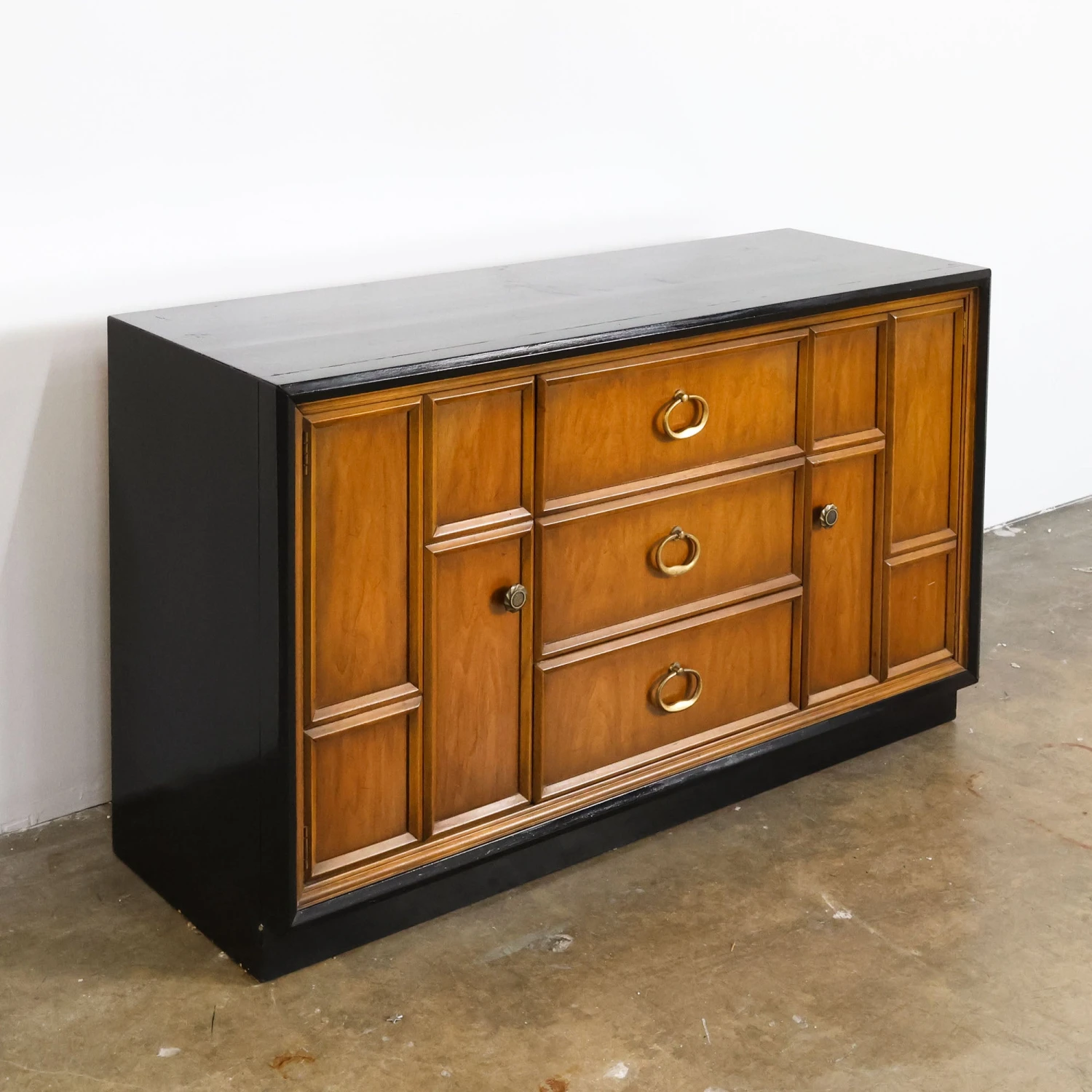Vintage credenza featuring a medium stain encased in a black finish. Original brass hardware shines against the thick sectioned trim work on the front of this piece. With 2 cabinets and 3 drawers, thisย secondhand treasure is ready to hold allllll your odds and ends.