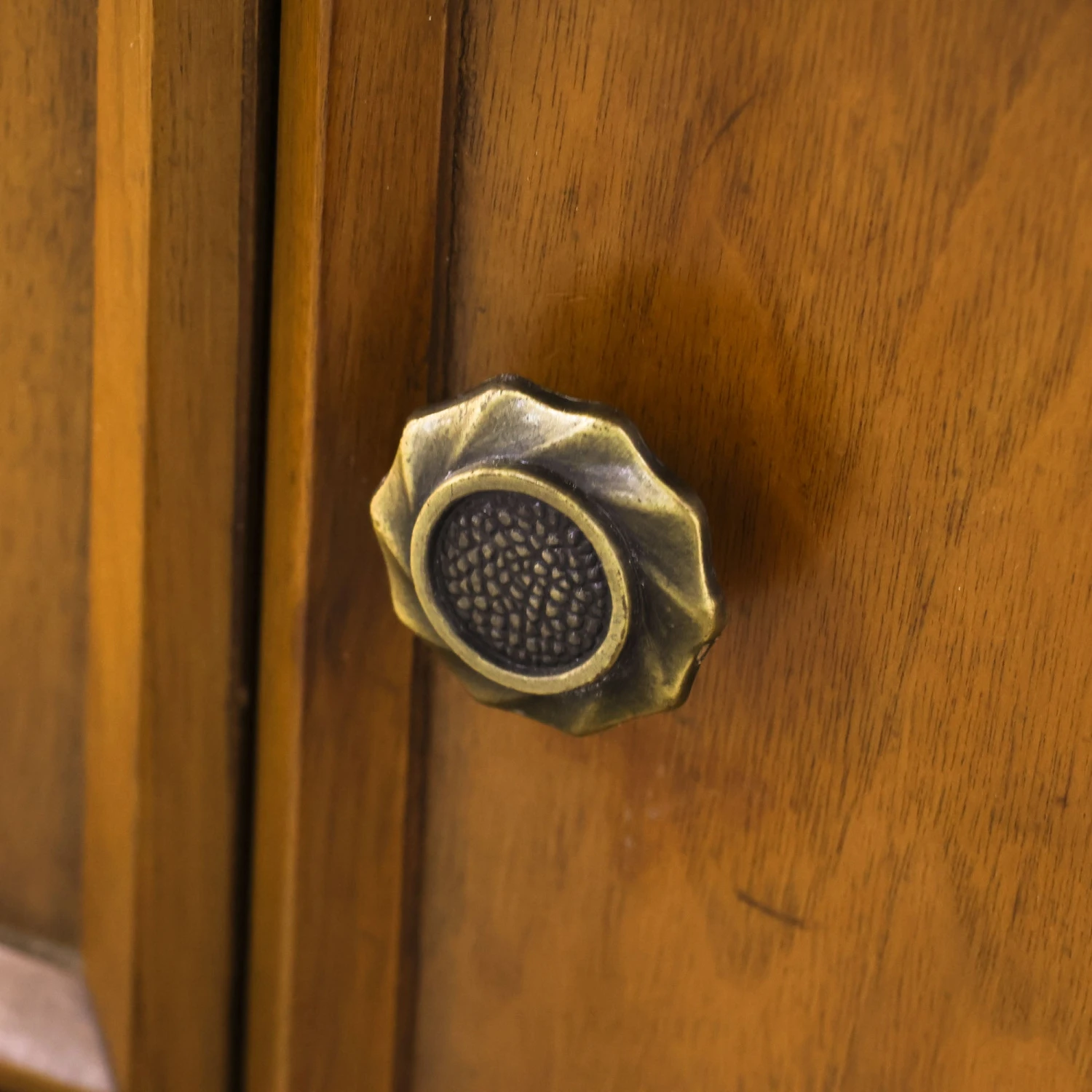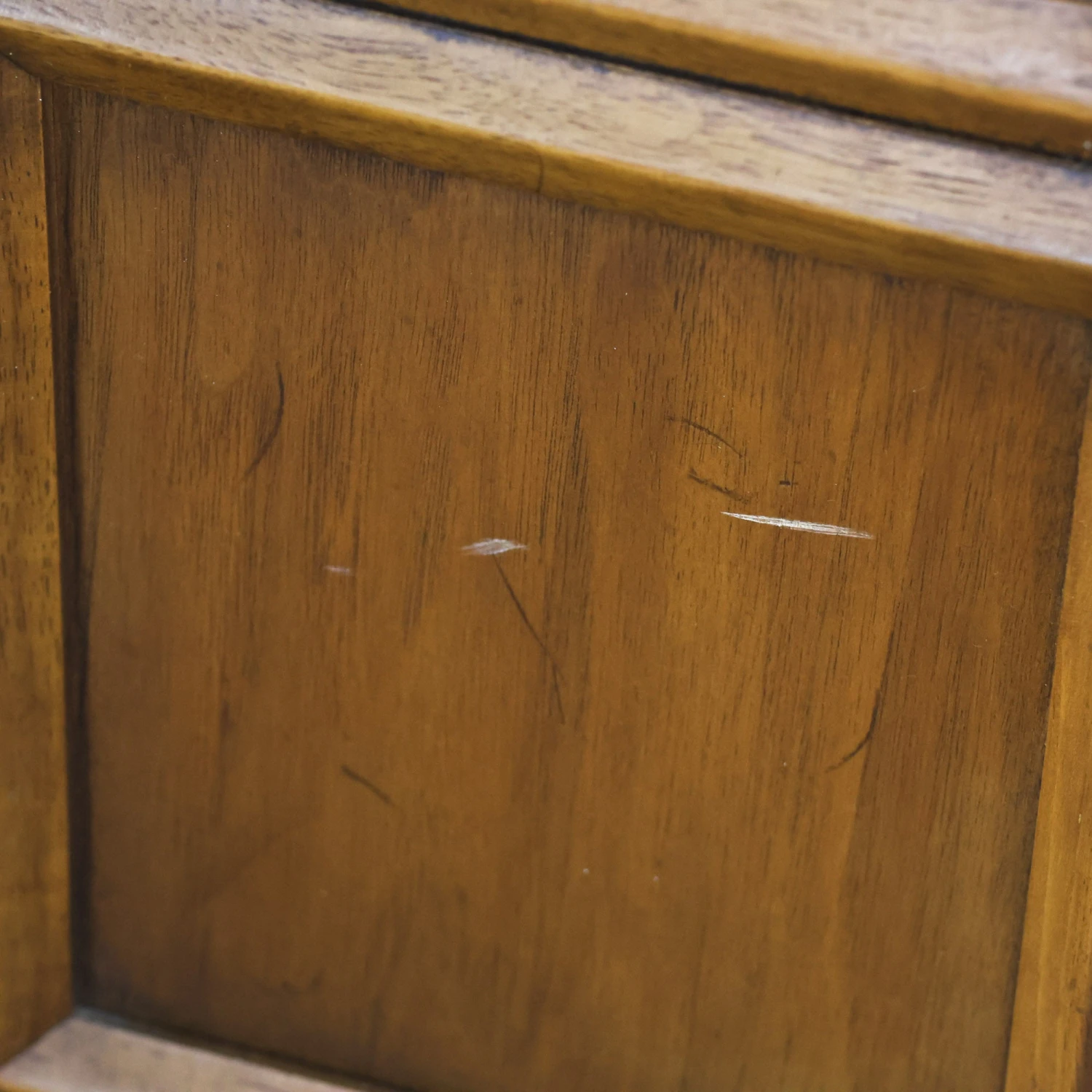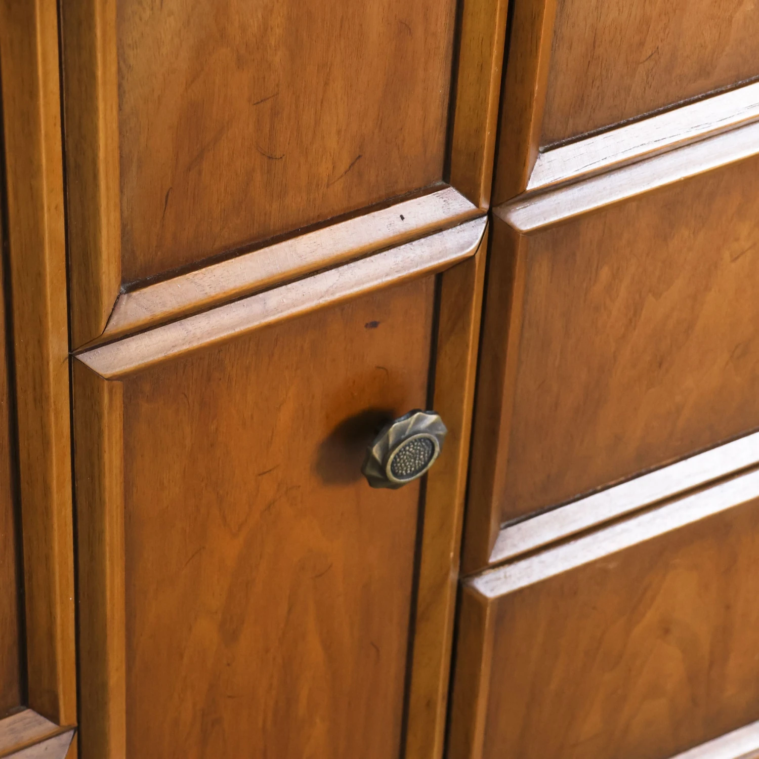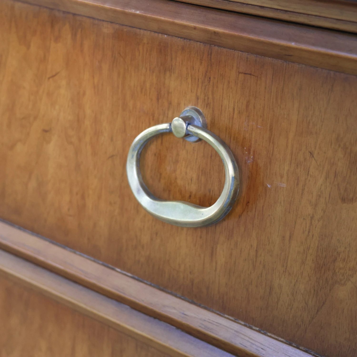 Vintage credenza featuring a medium stain encased in a black finish. Original brass hardware shines against the thick sectioned trim work on the front of this piece. With 2 cabinets and 3 drawers, thisย secondhand treasure is ready to hold allllll your odds and ends.