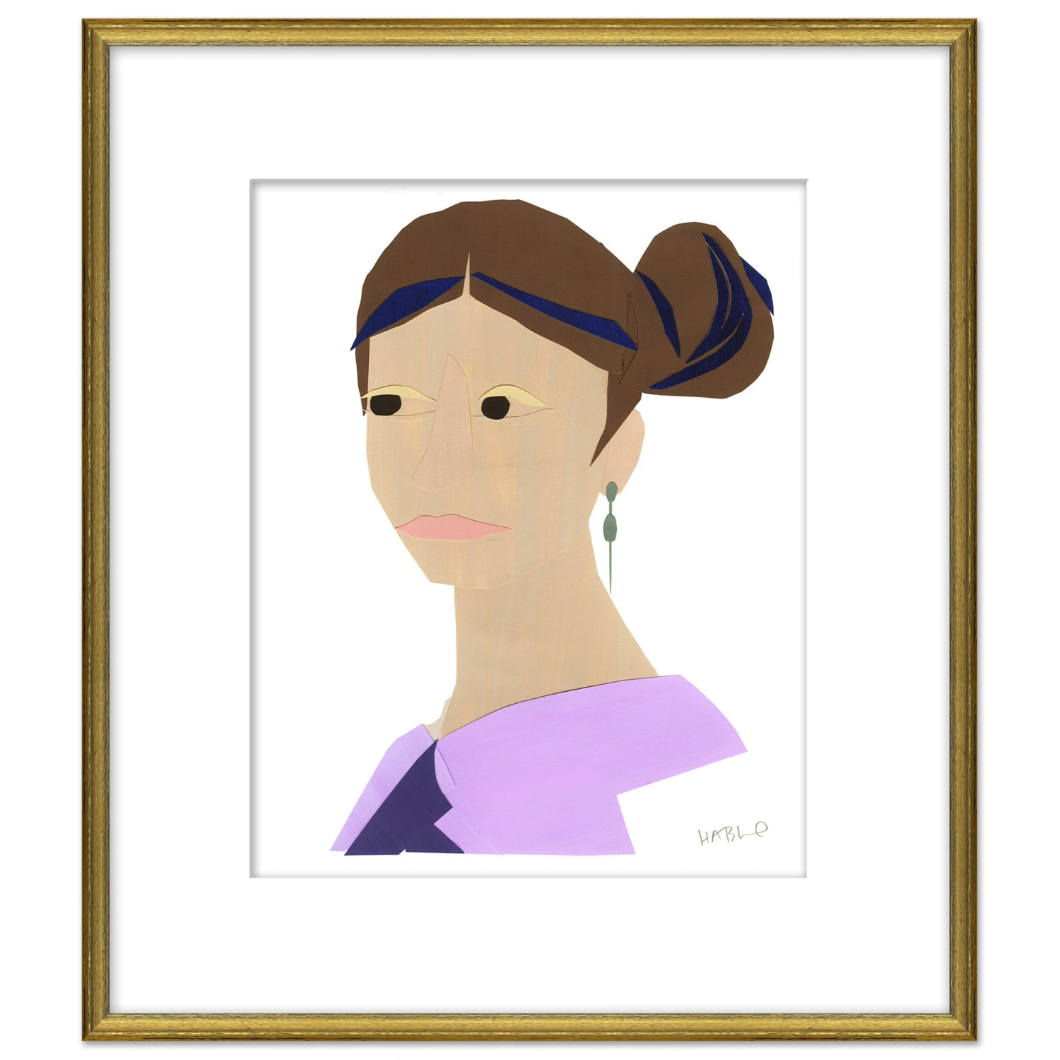 Colorful giclée print of a portrait created by Susan Hable. ‘Portrait Series – Jeannie‘ is printed on archival paper and framed in a black and gold frame.